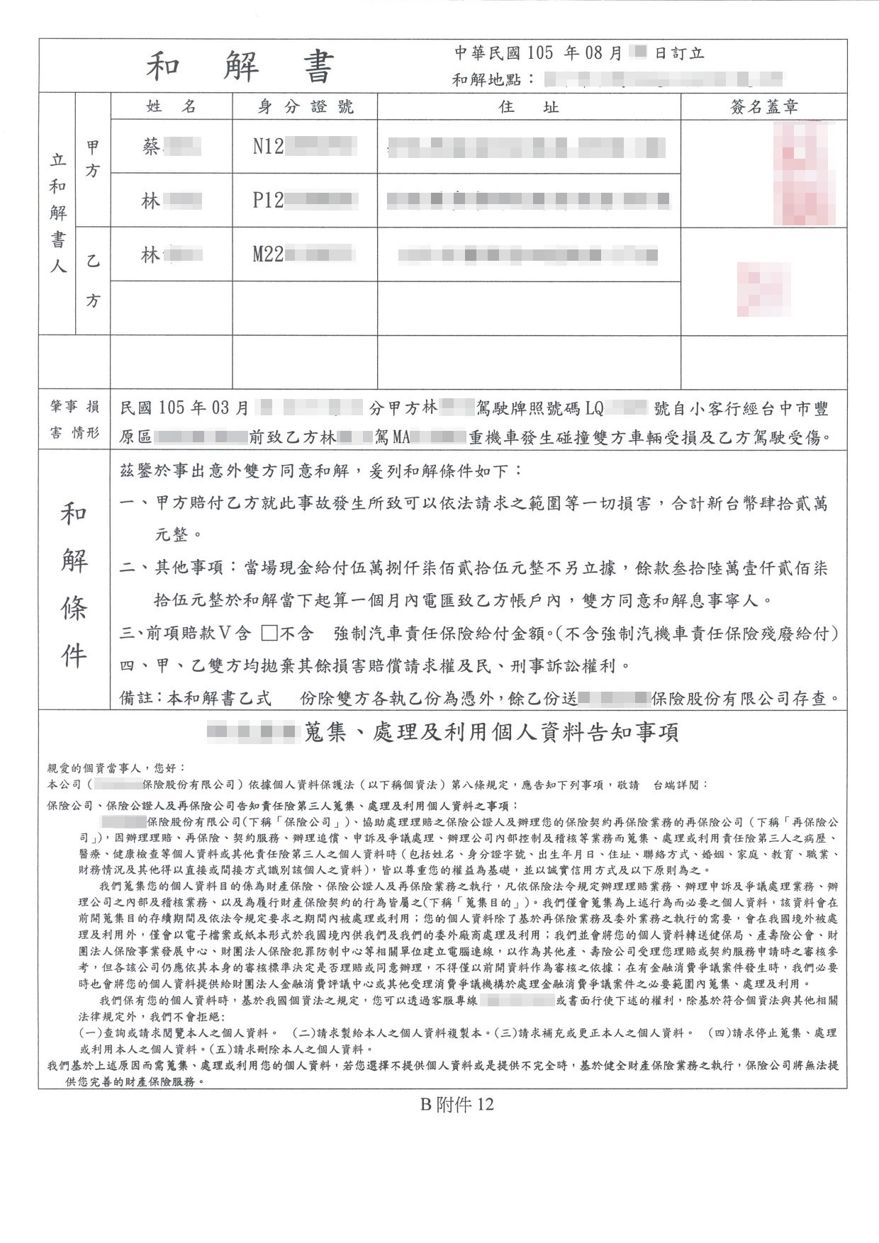 案件類型: 車禍案件。 發生時地: 105年3月 台中市豐原區。 面談過程: 林小姐騎機車行駛於台中市豐原區道路上,路邊一台自小客戶迴轉時沒有注意後方來車,與林小姐發生碰撞,林小姐受傷且機車損毀。本公司業務人員開發案件時得知此案,向林小姐說明車禍發生後越早尋求專業人員協助,越容易獲得完整的補償,不僅可以省時免費心,效果也往往比自己處理好得多。林小姐後來幾經思考,認為自己不清楚處理車禍事故要注意哪些地方,也不知道該做些什麼努力才可以拿到合理補償不至於讓自己權益受損,便決定將此案件委託本公司協助。 委任關鍵: 我方當事人了解車禍案件及早尋求專業協助的重要性。 處理結果: 協助當事人收集相關資料並商議如何爭取補償金,我方當事人總計獲得補償金額420,000元。 案件資料: 現場圖 初判表 診斷書 和解書