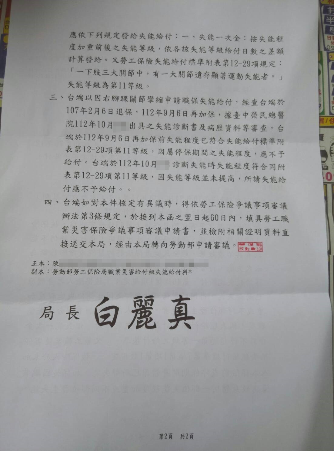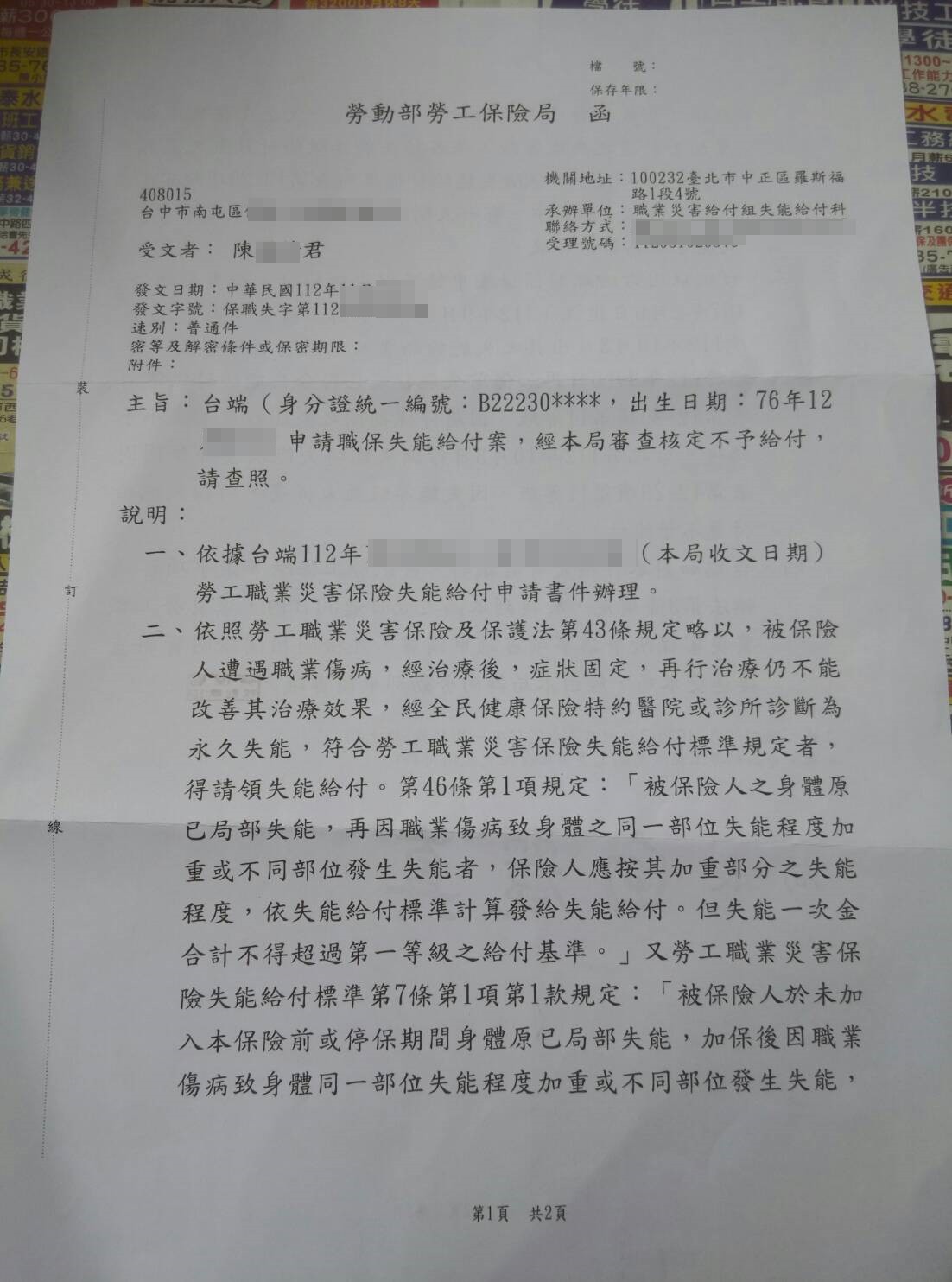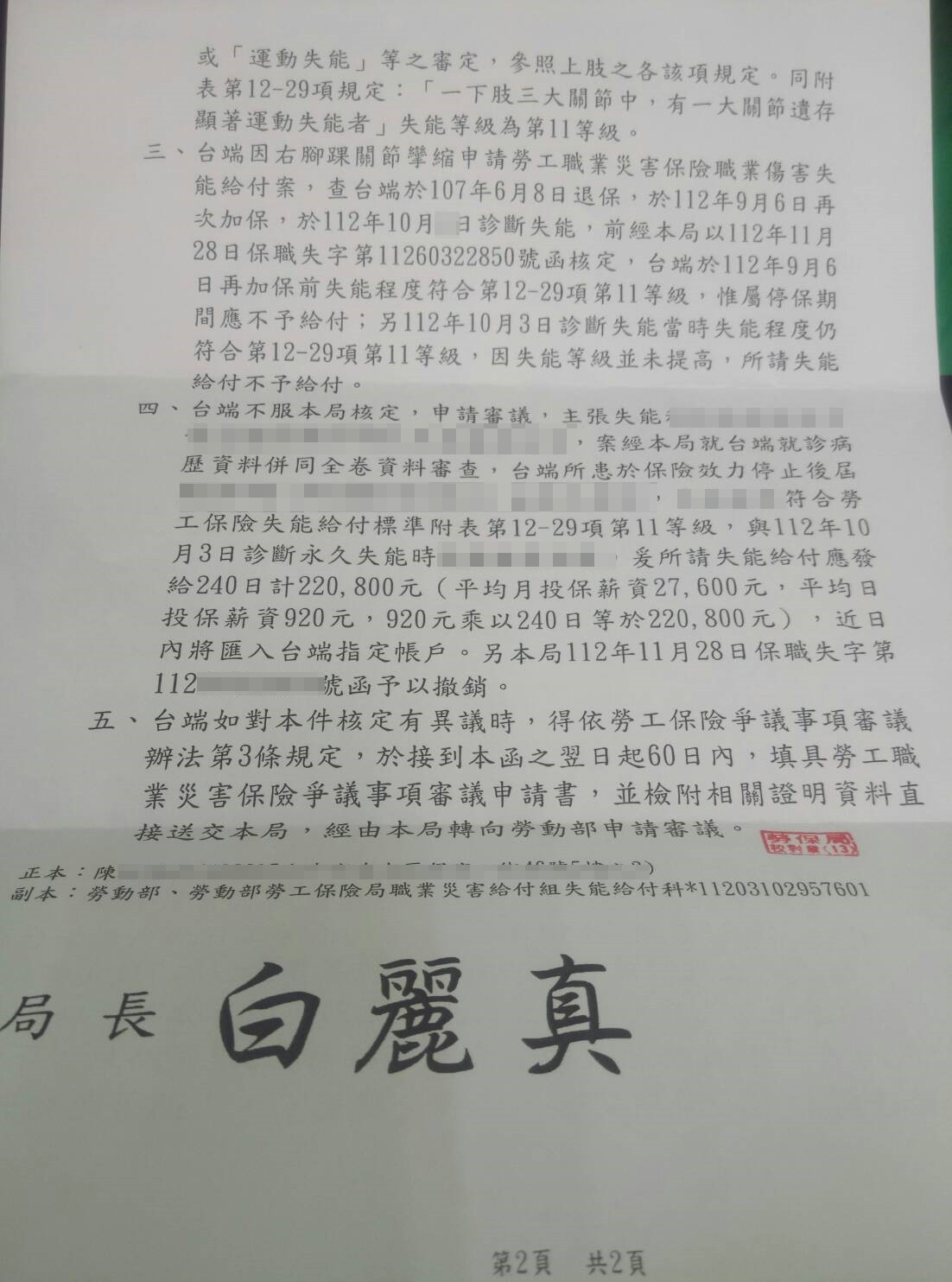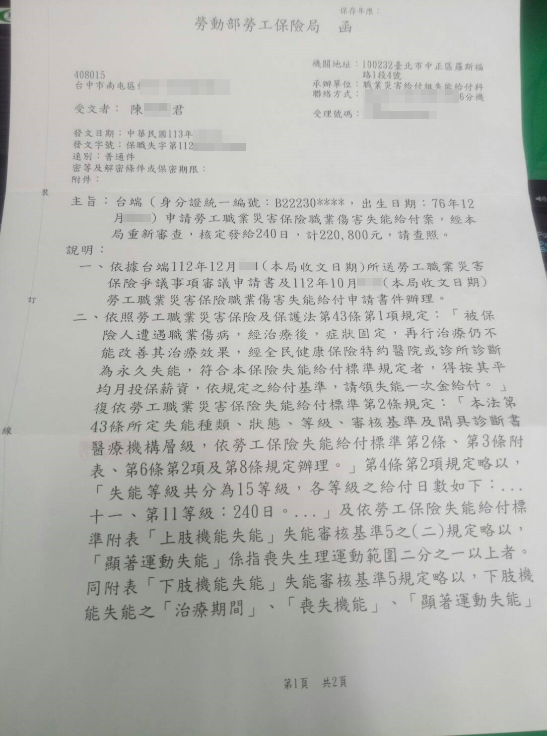 案件類型: 勞保失能案件。 發生時地: 107年6月 台中市。 面談過程: 陳小姐於107年上班途中發生車禍,導致陳小姐受有傷害,於同年月遭到雇主要求離職並退出勞保,經治療後陳小姐於112年開始工作加入勞保申請勞保失能給付,經勞保局審核不予給付,陳小姐為維護自己權益請我們協助她申請勞保理賠。 委任關鍵: 我方當事人申請勞保失能,但經勞保局審查不予給付,所以願意委託佑安代為維護權益。 處理結果: 協助當事人收集相關資料並向勞保局提出審議,我方當事人取得勞保職業傷病失能給付220,800元。 心得: 勞保局常告訴民眾申請勞保很簡單,不需要委託請人代辦,又常常用污衊代辦的方式來誤導民眾,事實真的如此嗎? 案件資料: 勞保局不予給付函 勞保核定給付通知書︰原核定失能第9等級,給付金額220,800元