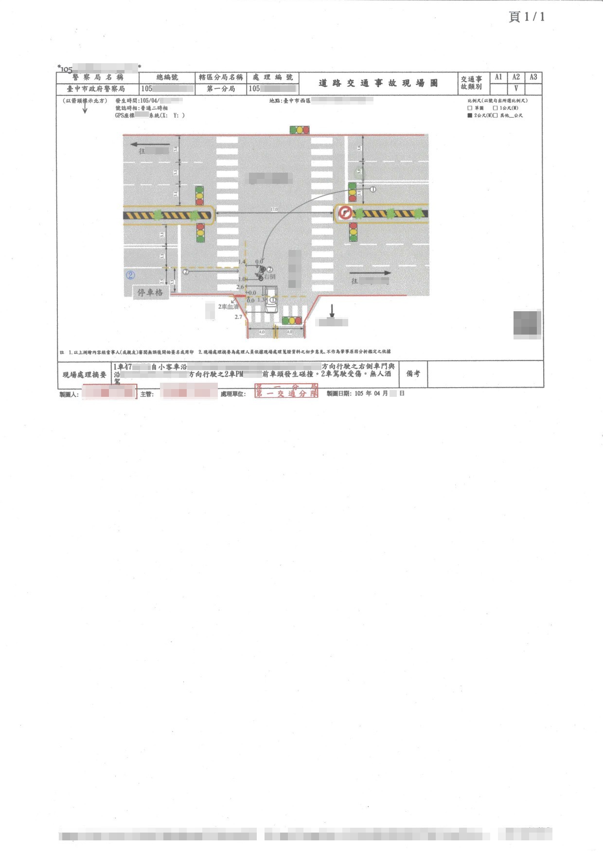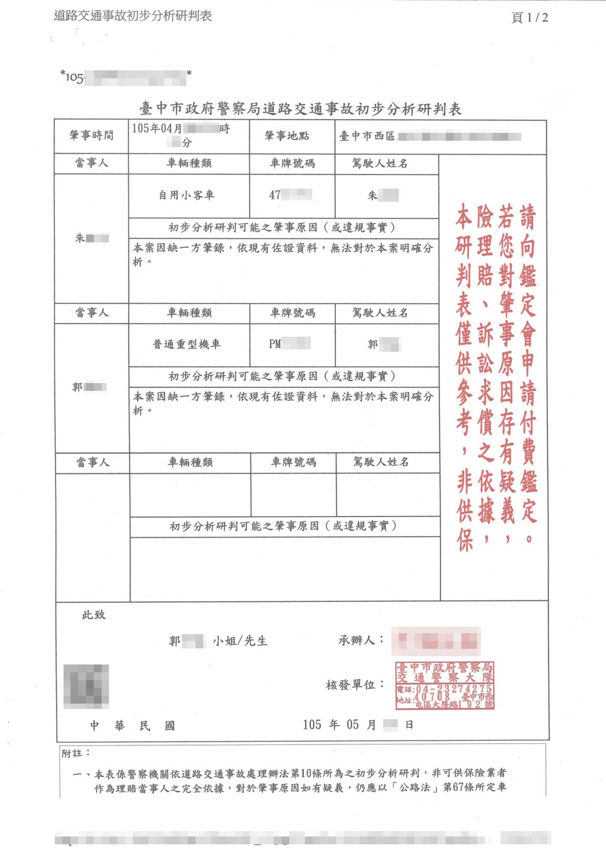 案件類型: 車禍案件。 發生時地: 105年4月 台中市西區。 面談過程: 郭先生騎機車幫便當店外送便當時行經台中市西區某路口,與對向左轉的自小客車發生碰撞,郭先生受傷以及機車損毀。本公司業務人員開發案件時得知此案,向郭先生說明車禍發生後越早尋求專業人員協助,越容易獲得完整的補償,不僅可以省時免費心,效果也往往比自己處理好得多。郭先生後來幾經思考,認為自己不清楚處理車禍事故要注意哪些地方,也不知道該做些什麼努力才可以拿到合理補償不至於讓自己權益受損,便決定將此案件委託本公司協助。 委任關鍵: 我方當事人了解車禍案件及早尋求專業協助的重要性。 處理結果: 協助當事人收集相關資料並商議如何爭取補償金,我方當事人總計獲得補償金額470,000元。 案件資料: 現場圖 初判表 診斷書 和解書