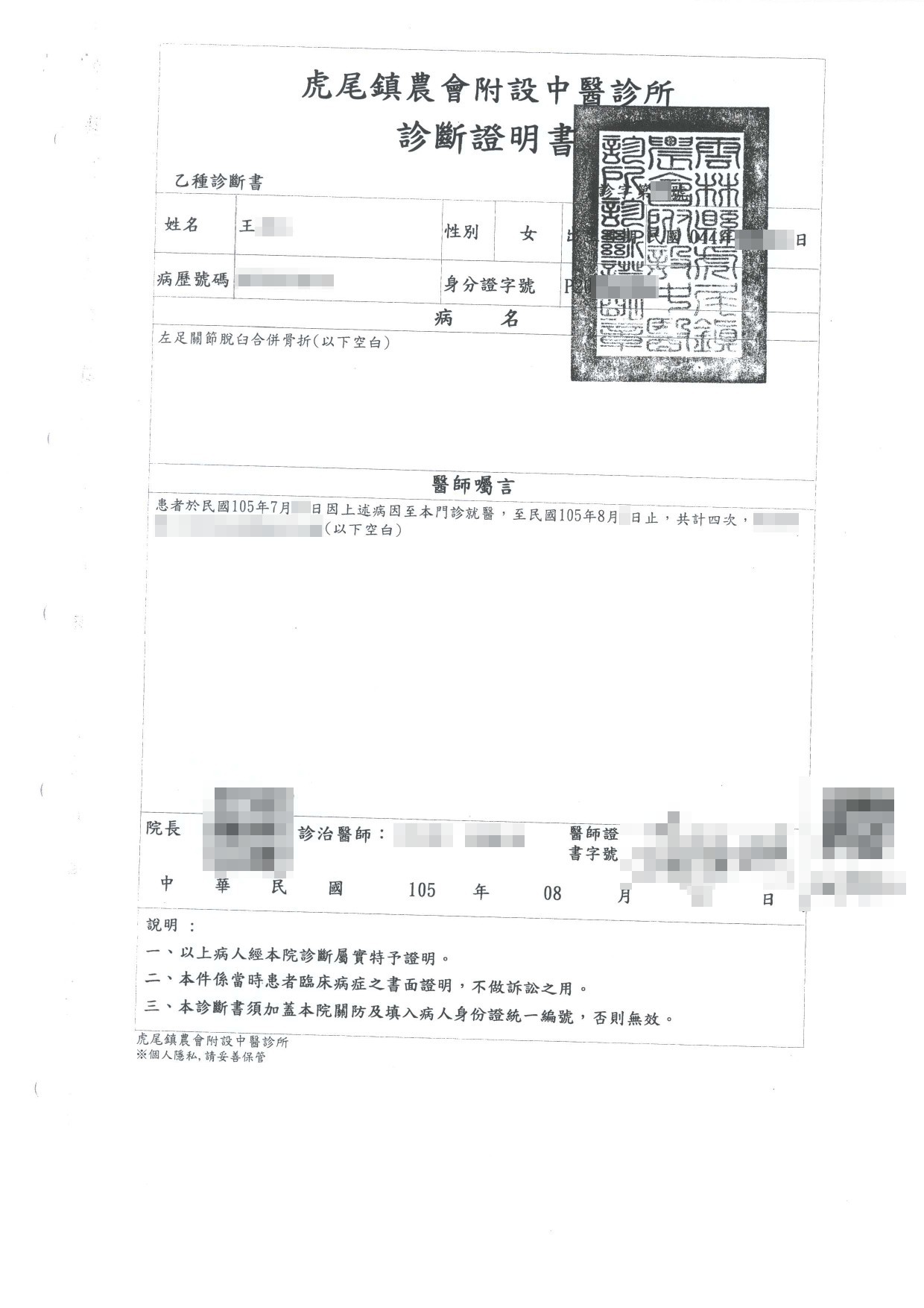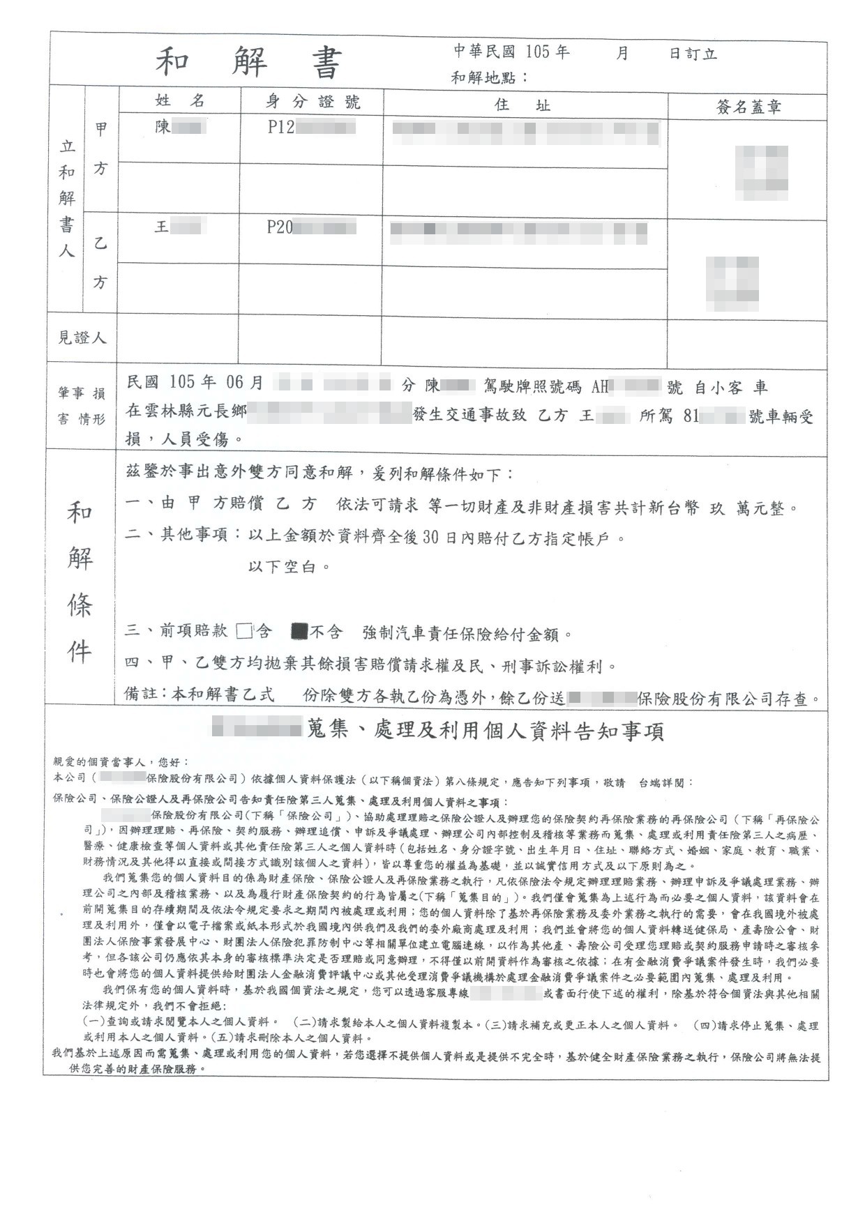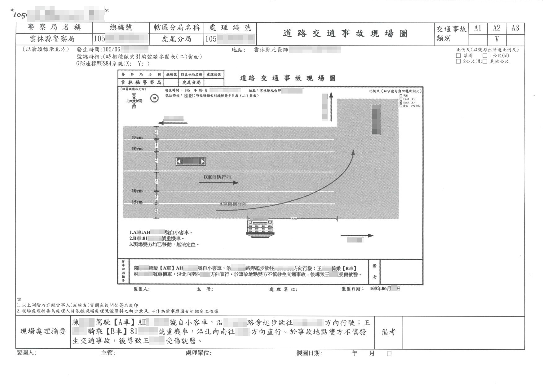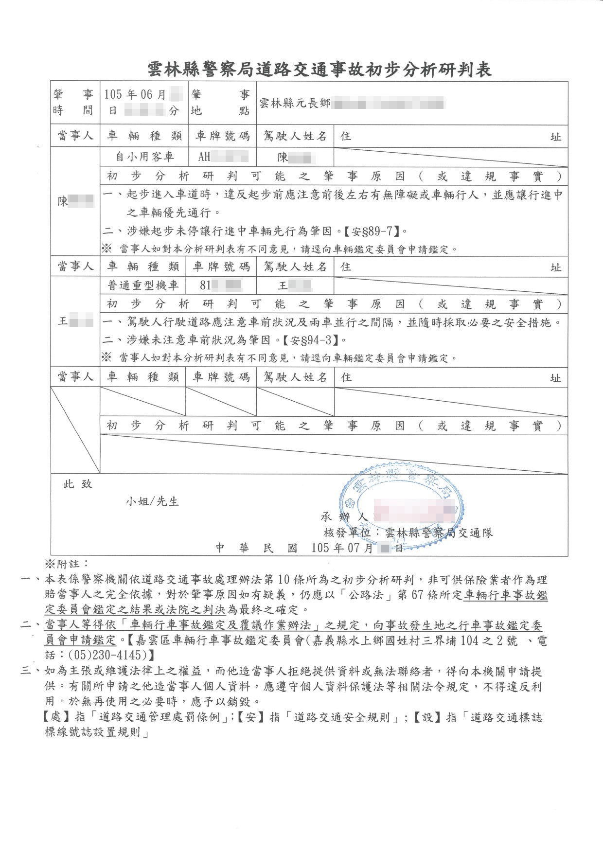 案件類型: 車禍案件。 發生時地: 105年6月 雲林縣元長鄉。 面談過程: 王女士騎機車行經雲林縣元長鄉某路段,右前方一輛自小客車路邊起步欲左轉未注意後方來車導致雙方發生碰撞,王女士受傷以及機車損毀。本公司業務人員與王女士聊到此案時,王女士表示雖然對方駕駛態度不差,不過感覺得出來沒有很積極在處理後續賠款事宜。加上王女士工作繁忙,無力分神於事故處理的繁雜細節,幾經思考後決定將此案件委託本公司協助。 委任關鍵: 我方當事人本來只打算求償醫療費用,在與子女商量後決定力爭自身權益但卻無暇處理這些繁瑣細節。 處理結果: 協助當事人收集相關資料並商議如何爭取補償金,我方當事人總計獲得補償金額98,830元(含強制險)。 案件資料: 現場圖 初判表 診斷書 和解書