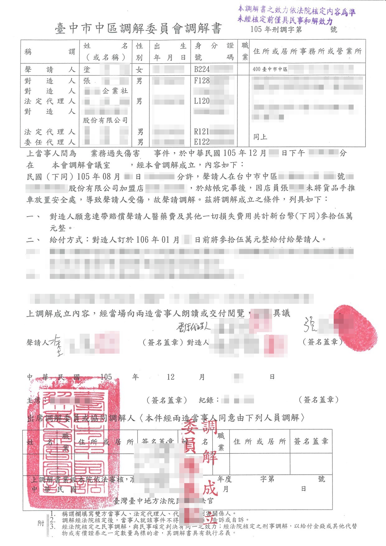 案件類型: 公共意外案件。 發生時地: 105年8月 台中市中區。 面談過程: 塗女士於上述時間至台中市某賣場採購生活用品,結帳完畢欲離開時不慎踢到放置一旁的貨品手推車,跌倒在地右膝骨折,現場立即報警處理並送至醫院急診。在塗女士自行與對造協調賠償事宜時,賣場所投保之產物保險公司依塗女士所提供之資料理算,同意賠償17萬元整,塗女士認為金額過低沒有同意,經幾次協調雙方始終無法達成共識。後來本公司業務人員開發案件時發現塗女士不知如何補全資料才能爭取更合理的賠款,加上塗女士必需持續復健及照顧兒女,無力分神於事故處理的繁雜細節,幾經思考後塗女士決定將此案件委託本公司協助。 委任關鍵: 1.我方當事人自行處理時始終無法與保險公司就金額達成共識。 2.我方當事人不知如何補全資料爭取合理賠款。 3.我方當事人忙於復健及照顧家庭,無暇再耗費時間處理事故。 處理結果: 協助當事人收集相關資料並商議如何爭取補償金,我方當事人總計獲得補償金額350,000元。 案件資料: 診斷書 和解書