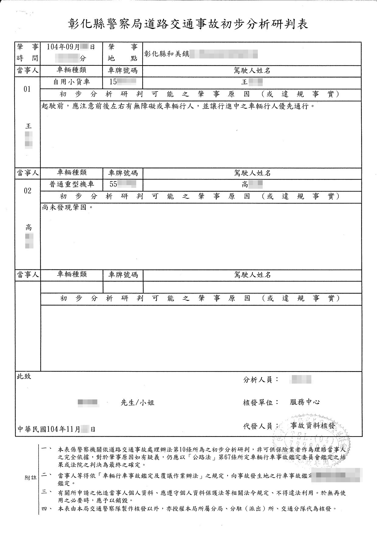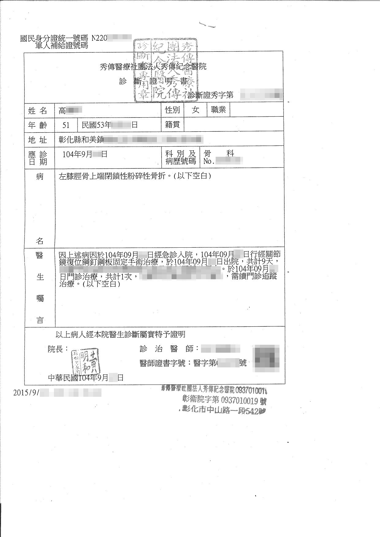 案件類型: 車禍案件。 發生時地: 104年9月 彰化縣和美鎮。 面談過程: 高女士為房屋仲介人員,於上述時間帶客戶看完房子要返回辦公室途中,與駕駛小貨車從路邊起步的王姓駕駛發生碰撞因而受傷,導致左腳粉碎性骨折。高女士在自行處理後續和解事宜時,保險公司只願意賠款12萬元,高女士覺得金額不合理但又無能為力,加上在送件職業工會申請勞保職業災害補償時,職業工會回覆高女士因為他有固定雇主,依法應透過雇主投保勞保而非職業工會,因此不能申請。本公司業務人員與高女士聊到此案時,得知高女士在與保險公司調解及申請勞保職災給付上都不順利,向其說明透過專業公司協助處理的優點後,高女士決定將此案件委託本公司協助。 委任關鍵: 1.當事人自行跟保險公司調解時,保險公司只願意賠款12萬元。 2.當事人向投保之職業工會申請職業災害補償時職業工會告知不能理賠。 處理結果: 協助當事人收集相關資料並商議如何爭取補償金,我方當事人獲得車禍賠款700,000元、勞保職業災害給付158,359元,共計858,359元。 案件資料: 現場圖 初判表 診斷書