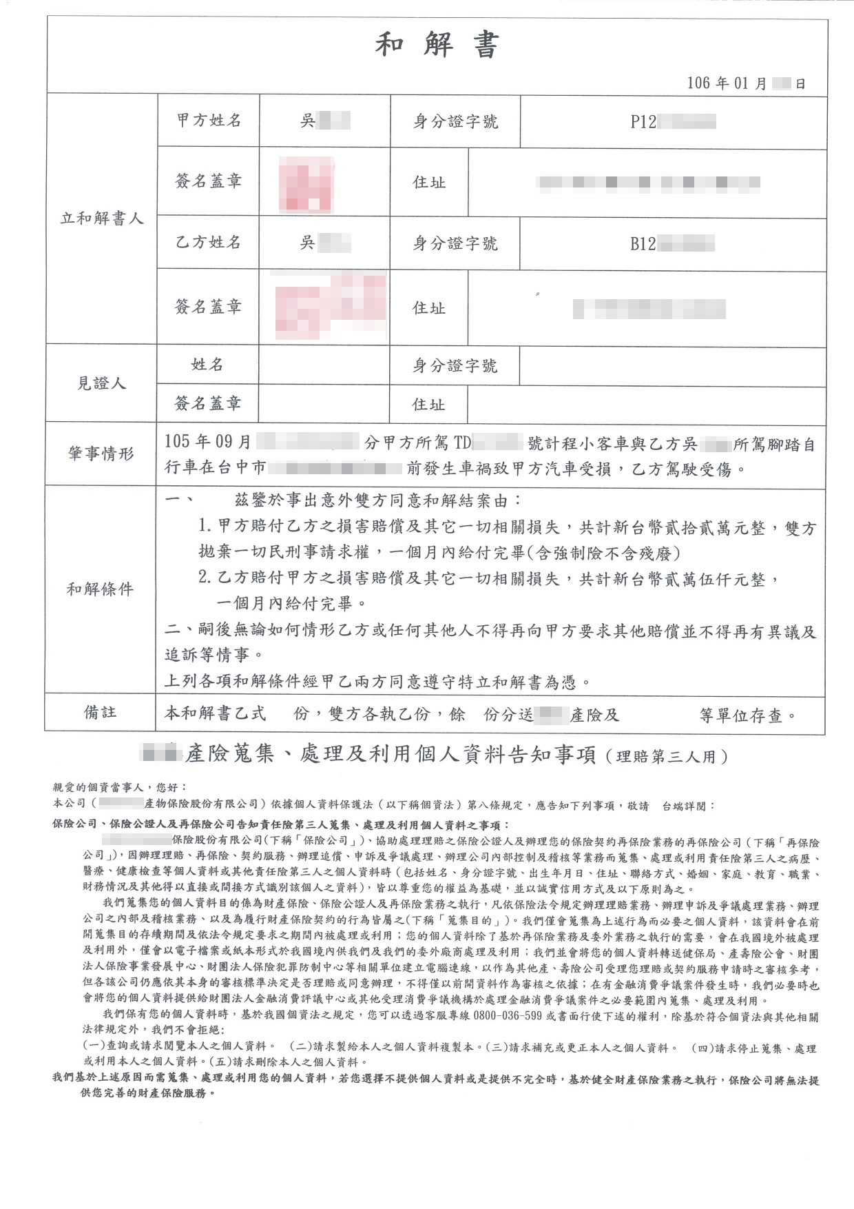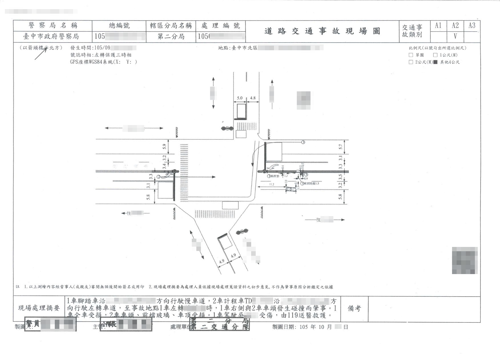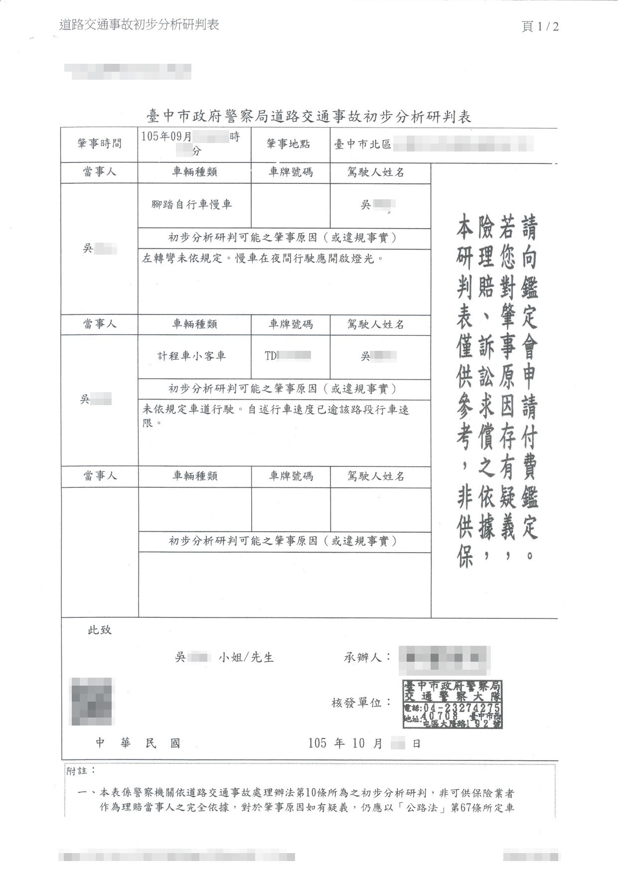 案件類型: 車禍案件。 發生時地: 105年9月 台中市北區。 面談過程: 吳同學於清晨時分騎乘自行車跨越馬路,遭計程車從側面撞上導致嚴重受傷。因為吳同學獨自一人在台中上學,吳爸爸考量工作及住家都在北部,不能常常請假下來台中協助吳同學處理車禍後續事宜,決定尋求協助。吳爸爸經友人介紹,上網尋找本公司的網站及聯絡方式,看完本公司協助處理過的案例後認為本公司值得託付,特地親自至本公司詳談及簽約委任,將此案件全權交由本公司協助。 委任關鍵: 1.我方當事人的爸爸在台北工作,無法時常分身下來台中處理車禍事宜。 2.我方當事人爸爸經友人介紹得知本公司,經由瀏覽網站及見面詳談認為我們公司值得託付。 3.我方行駛自行車道未等自行車號誌轉為綠燈便起步轉彎。 處理結果: 協助當事人收集相關資料並商議如何爭取補償金,我方當事人總計獲得補償金額220,000元(含強制險不含殘廢),賠付對方25,000元。 案件資料: 現場圖 初判表 診斷書 和解書