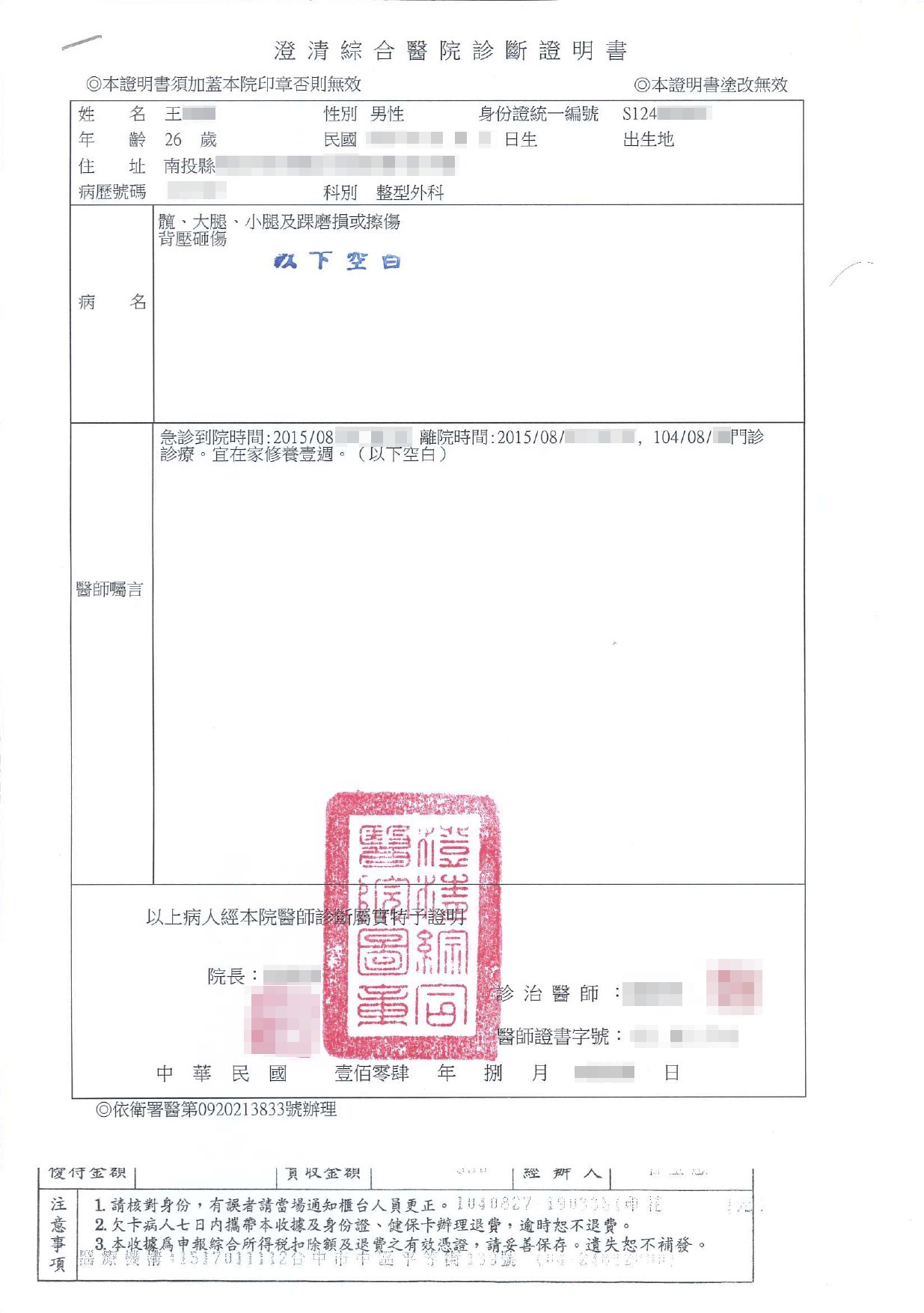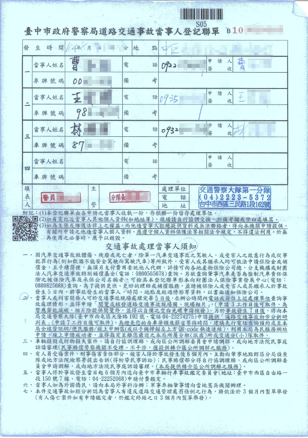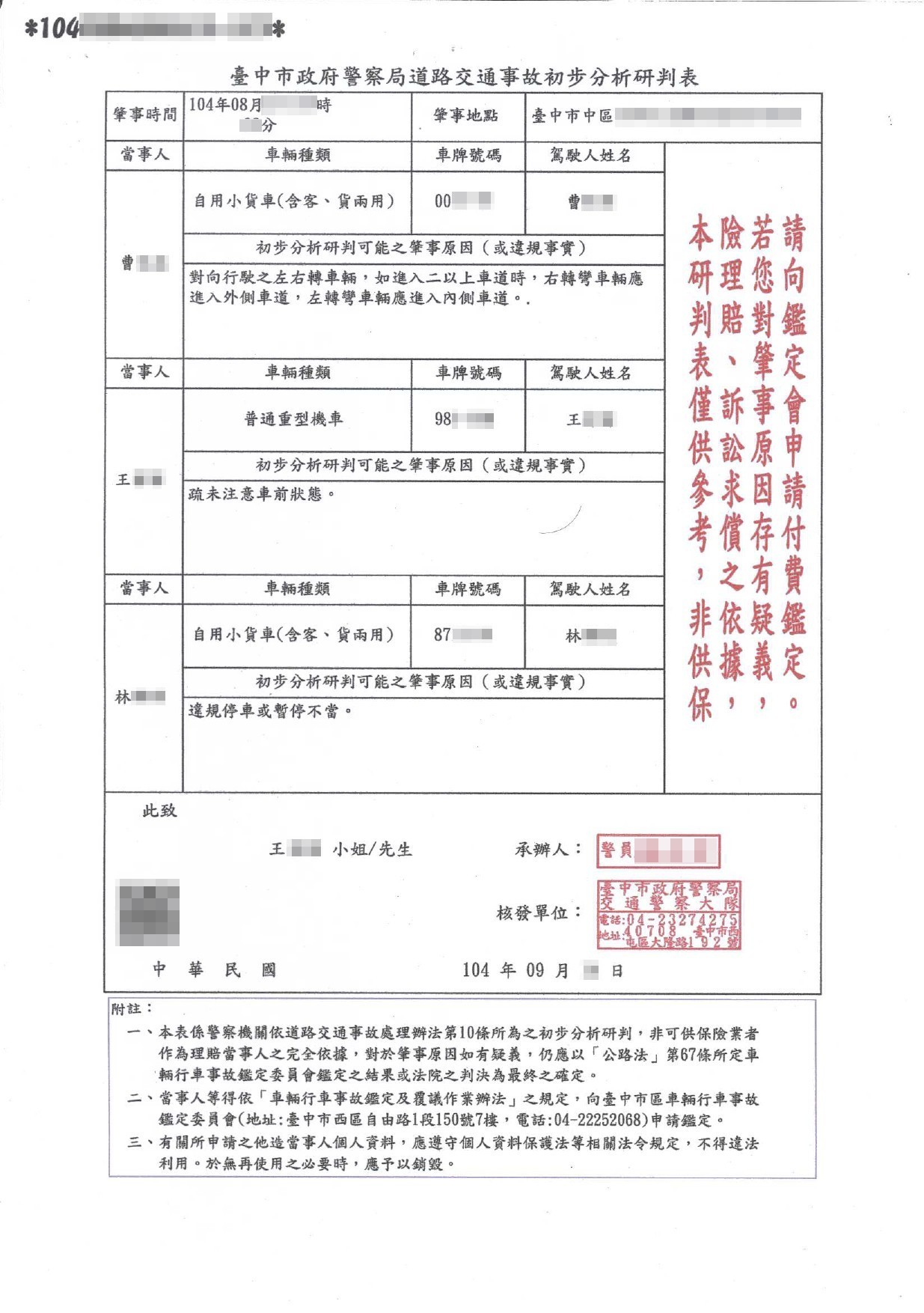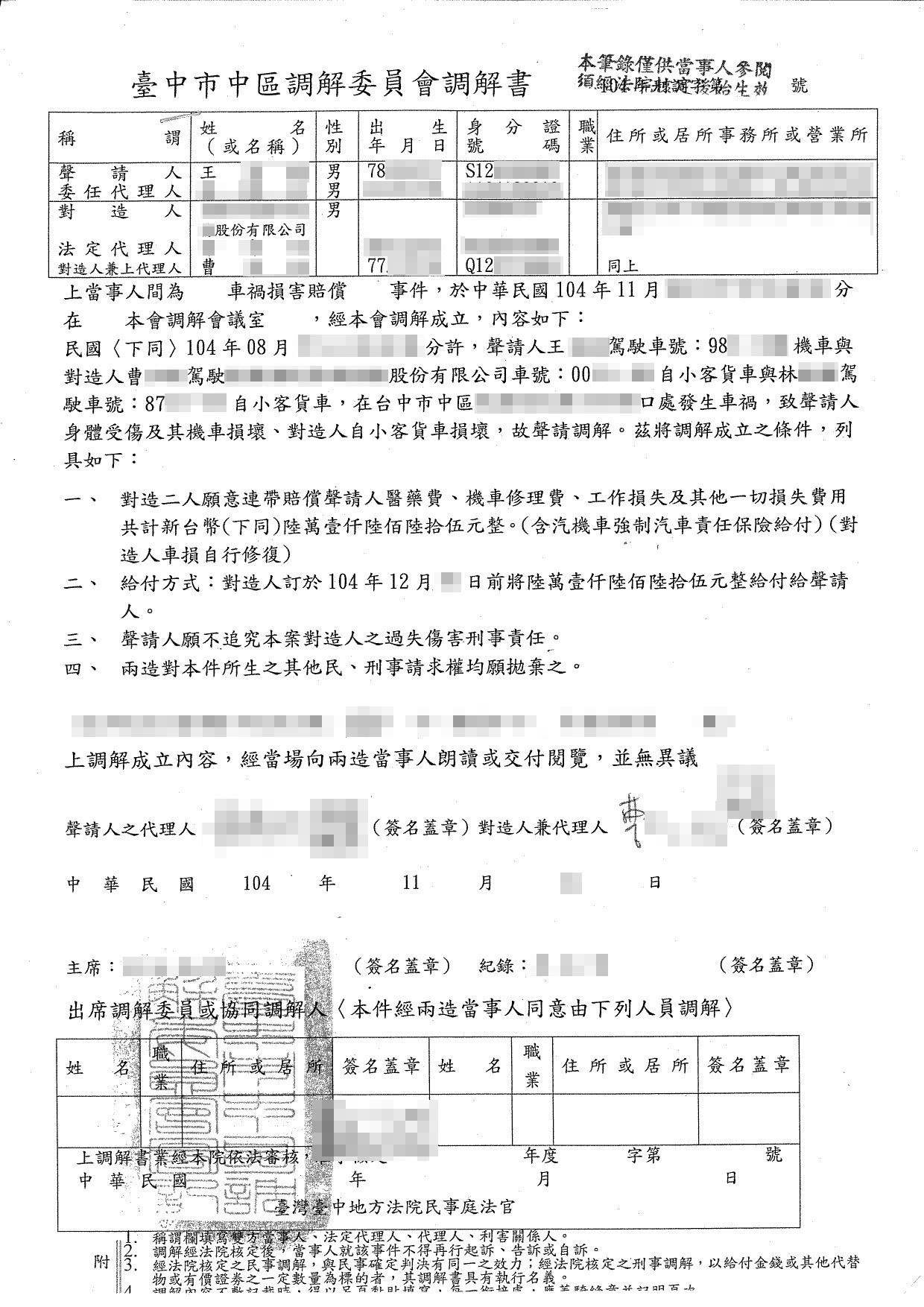 案件類型: 車禍案件。 發生時地: 104年8月 台中市中區。 面談過程: 王先生於台中市中區騎機車轉彎時,遭對向小貨車駕駛轉彎撞上,導致王先生受傷。本公司業務人員透過朋友認識王先生,經業務人員向王先生解釋自行處理與透過專業公司協助的差別後,王先生決定將案件委託本公司協助。 委任關鍵: 我方當事人沒有交通事故處理經驗。 處理結果: 協助當事人收集相關資料並商議如何爭取補償金,我方當事人總計獲得補償金額61,665元。 案件資料: 事故登記單 初判表 診斷書 和解書