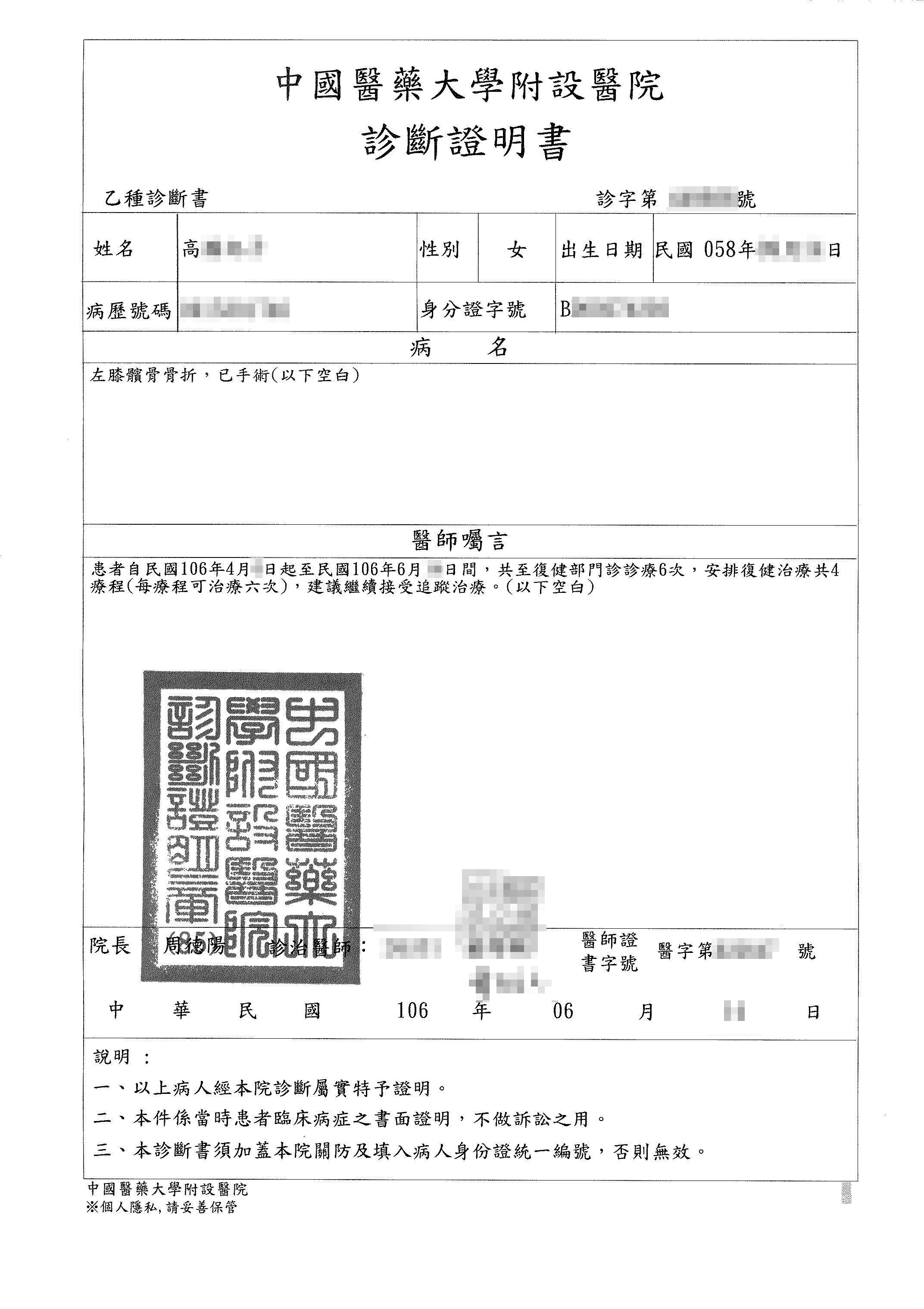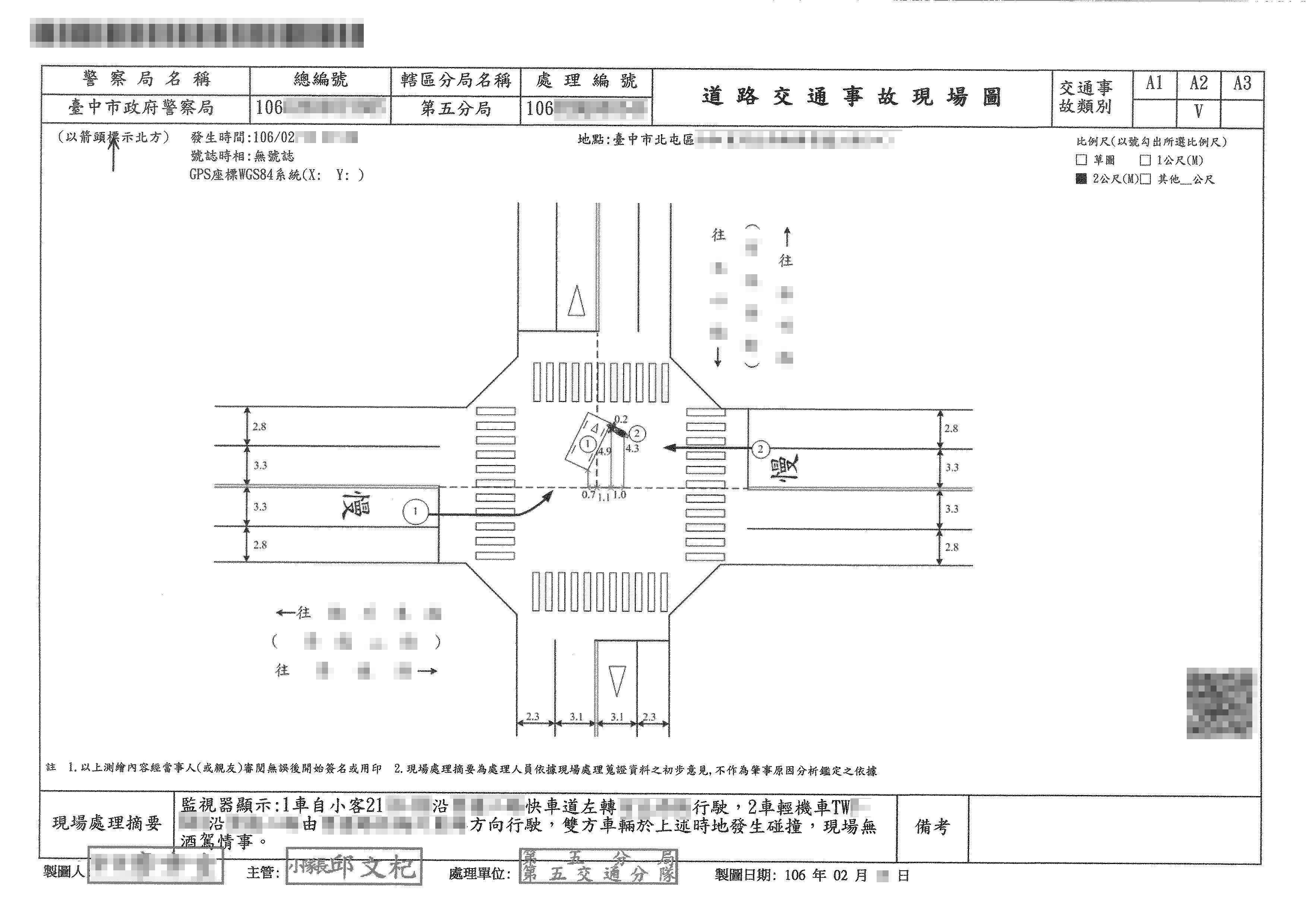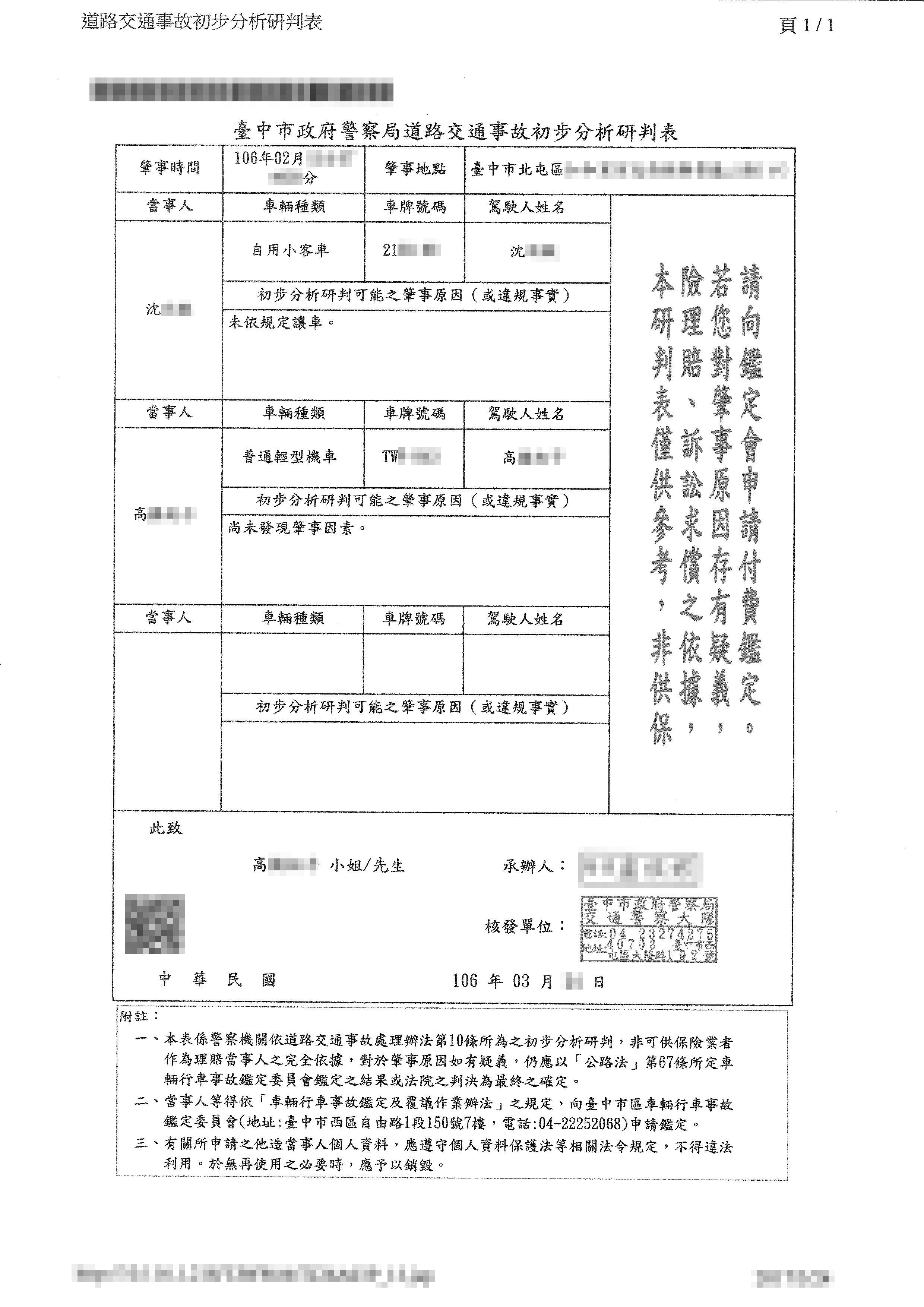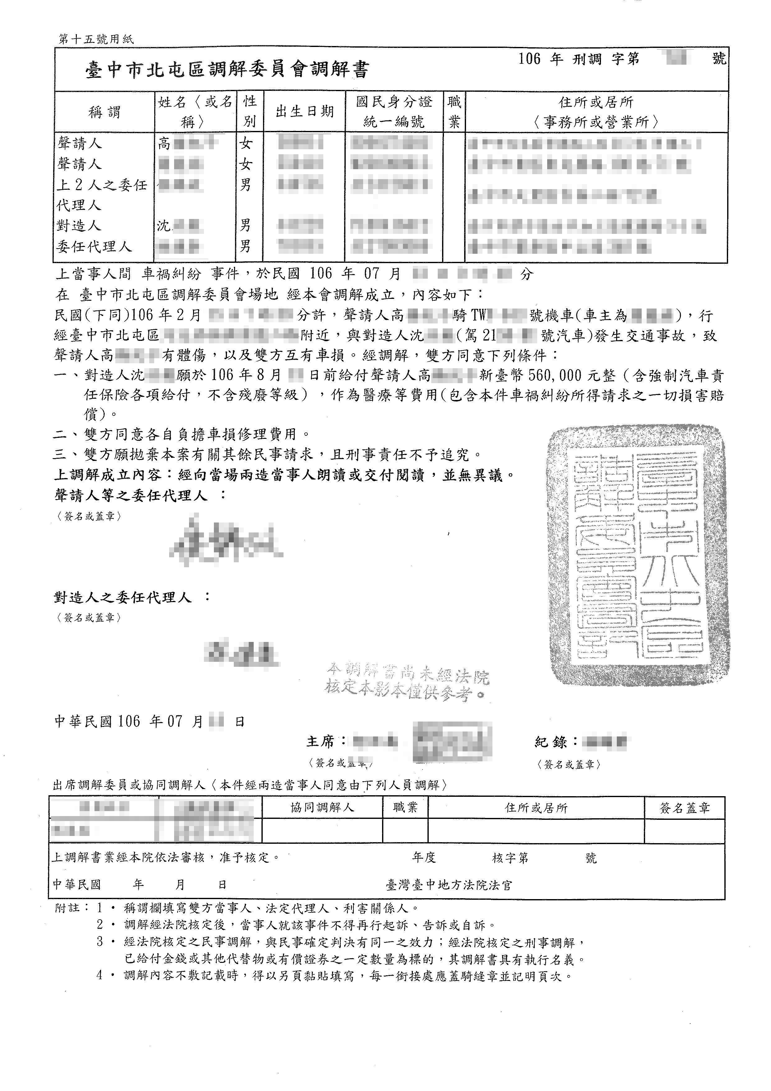 案件類型: 車禍案件。 發生時地: 106年2月 台中市北屯區。 面談過程: 高小姐騎機車上班途中行經路口,遭對向直行來車撞上。高小姐回診時認識本公司業務人員,本公司業務人員向其建議將交通事故的處理交由專業人員協助,更容易完整維護自身權益取得合理賠款,高小姐的丈夫認為雖然身邊有許多友人表達可以協助處理,但欠朋友人情是我方當事人不希望的,而且他相信有專業能力處理起來和解金額才不會偏低,因此決定將此事件交由本公司處理。 委任關鍵: 1.我方當事人經營事業無暇處理車禍調解事宜。 2.我方當事人朋友雖表達協助之意,但我方當事人不想欠朋友人情。 3.我方當事人於上班途中發生車禍,屬職業災害,我方當事人不知如何開口向雇主請求補償。 處理結果: 協助當事人收集相關資料並申請補償金,我方當事人總計獲得雇主補償金額180,000元、車禍對造賠償金額560,000元,合計740,000元。 案件資料: 現場圖 初判表 診斷書 和解書1 和解書2