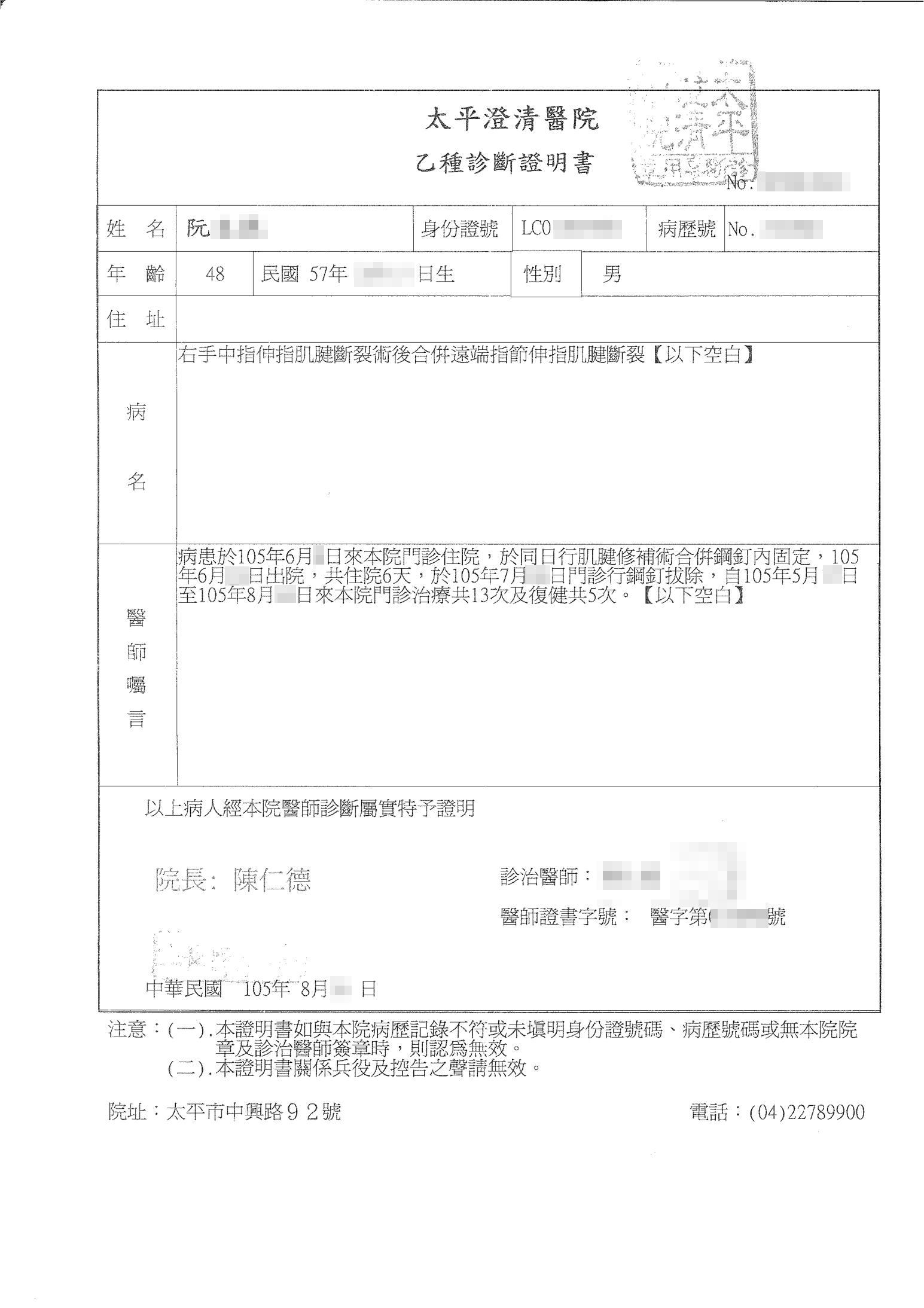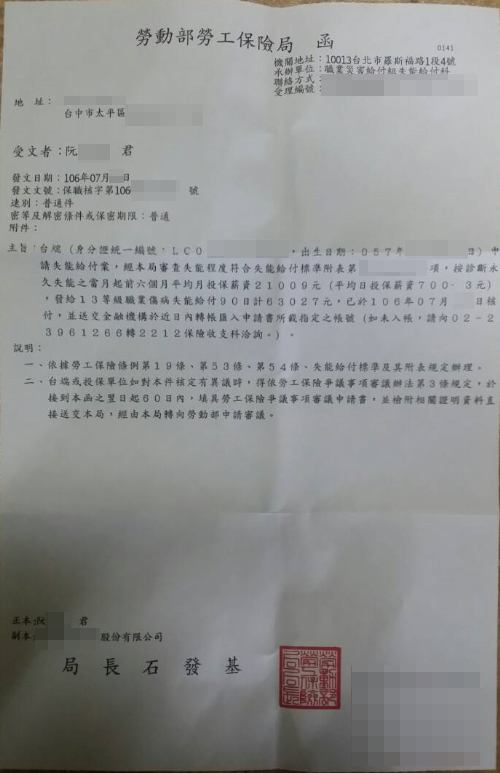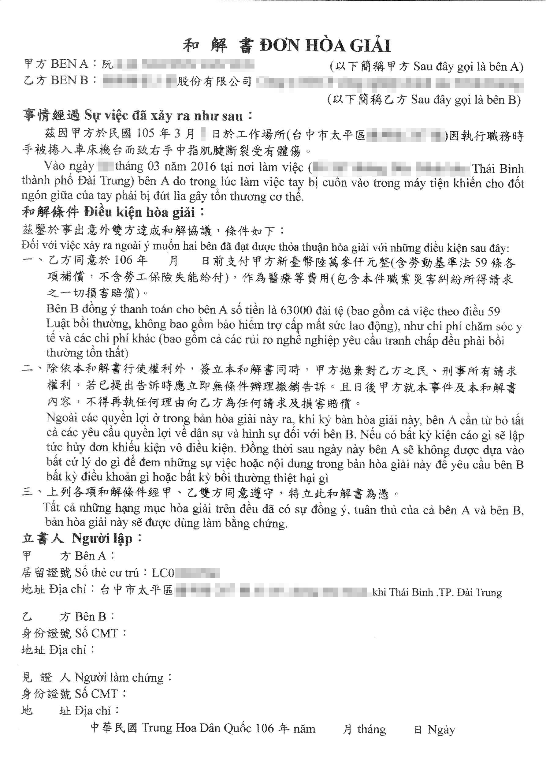 案件類型: 職業災害案件。 發生時地: 105年6月 台中市太平區。 面談過程: 阮先生於台中某工廠工作時手指遭車床機台捲入導致手指肌腱斷裂。本公司業務人員於業務開發過程中得知阮先生因為本身為外籍人士,礙於語言與身分問題不知如何向公司索取合理之補償,故建議阮先生交由本公司透過專業可以給予最好的幫忙,阮先生決定將此案件委託本公司協助。 委任關鍵: 我方當事人因語言及身分問題(外籍勞工)不知如何開口向公司要求補償。 處理結果: 協助當事人收集相關資料並商議如何爭取補償,我方當事人獲得公司補償63,000元、勞保給付63,027元,合計126,027元。 案件資料: 診斷書 和解書 勞保局核付函