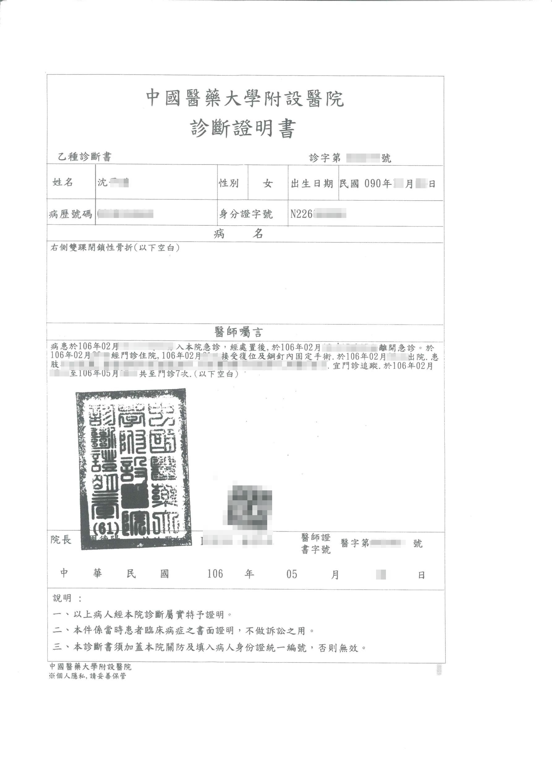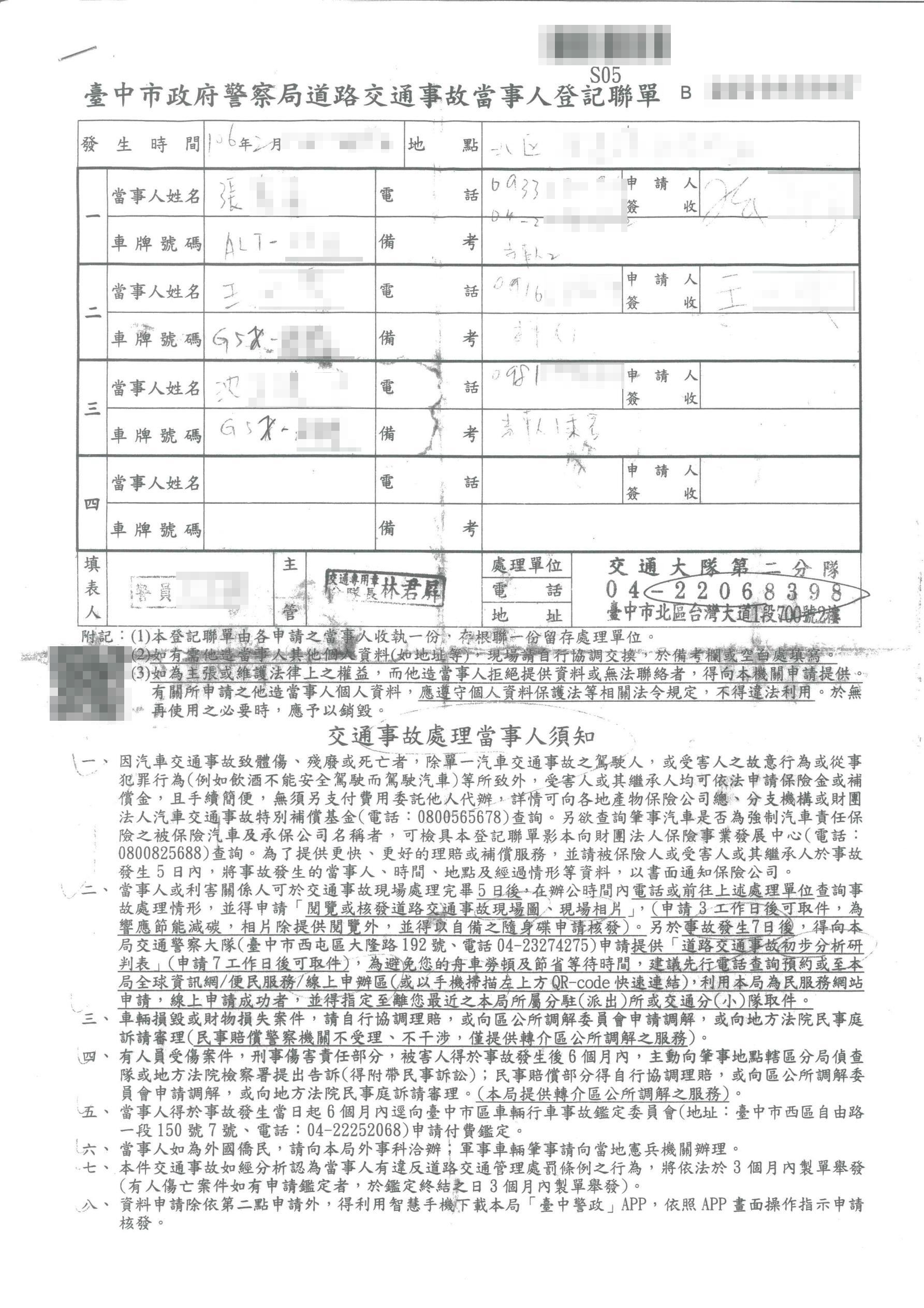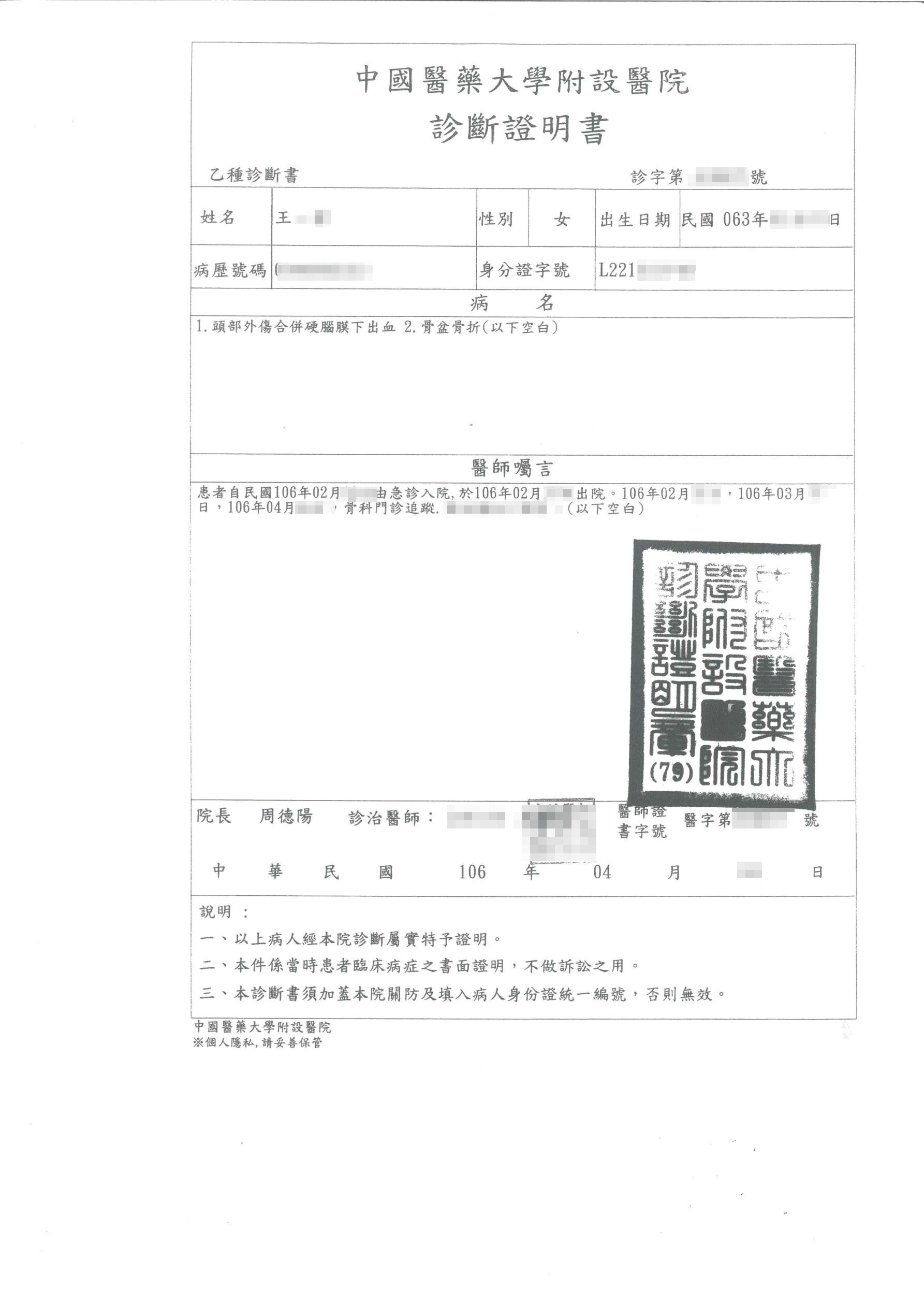 案件類型: 車禍案件。 發生時地: 106年2月 台中市北區。 面談過程: 王小姐騎車載女兒時在台中市北區發生交通事故,回診時認識本公司業務人員,本公司業務人員向其建議將交通事故的處理交由專業人員協助,更容易完整維護自身權益取得合理賠款。王小姐認為自己沒有交通事故處理經驗亦不知如何著手處理,因此決定將此事件交由本公司處理。 委任關鍵: 我方當事人無交通事故處理經驗亦不知如何著手處理。 處理結果: 協助當事人收集相關資料並申請賠償,我方當事二人共計獲得賠償金額340,000元。 案件資料: 事故單 診斷書1 診斷書2 估價單