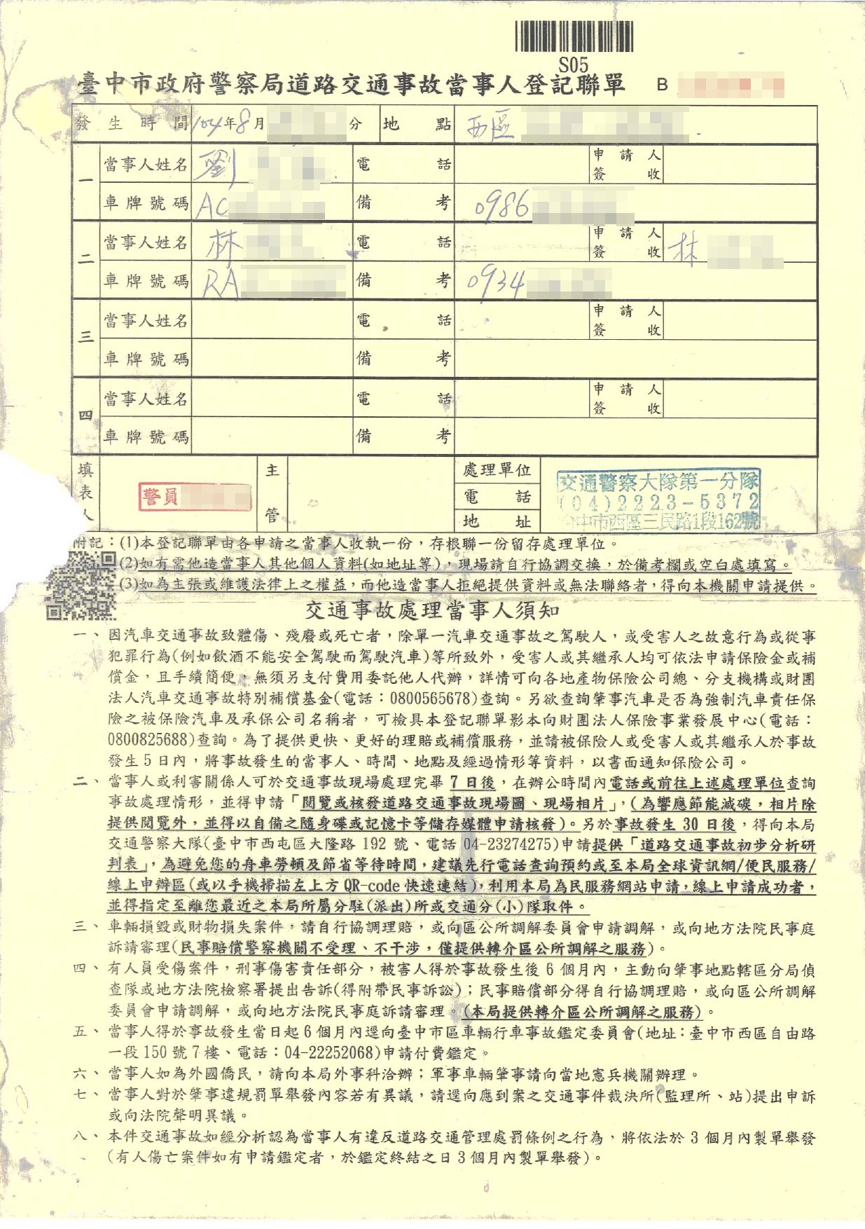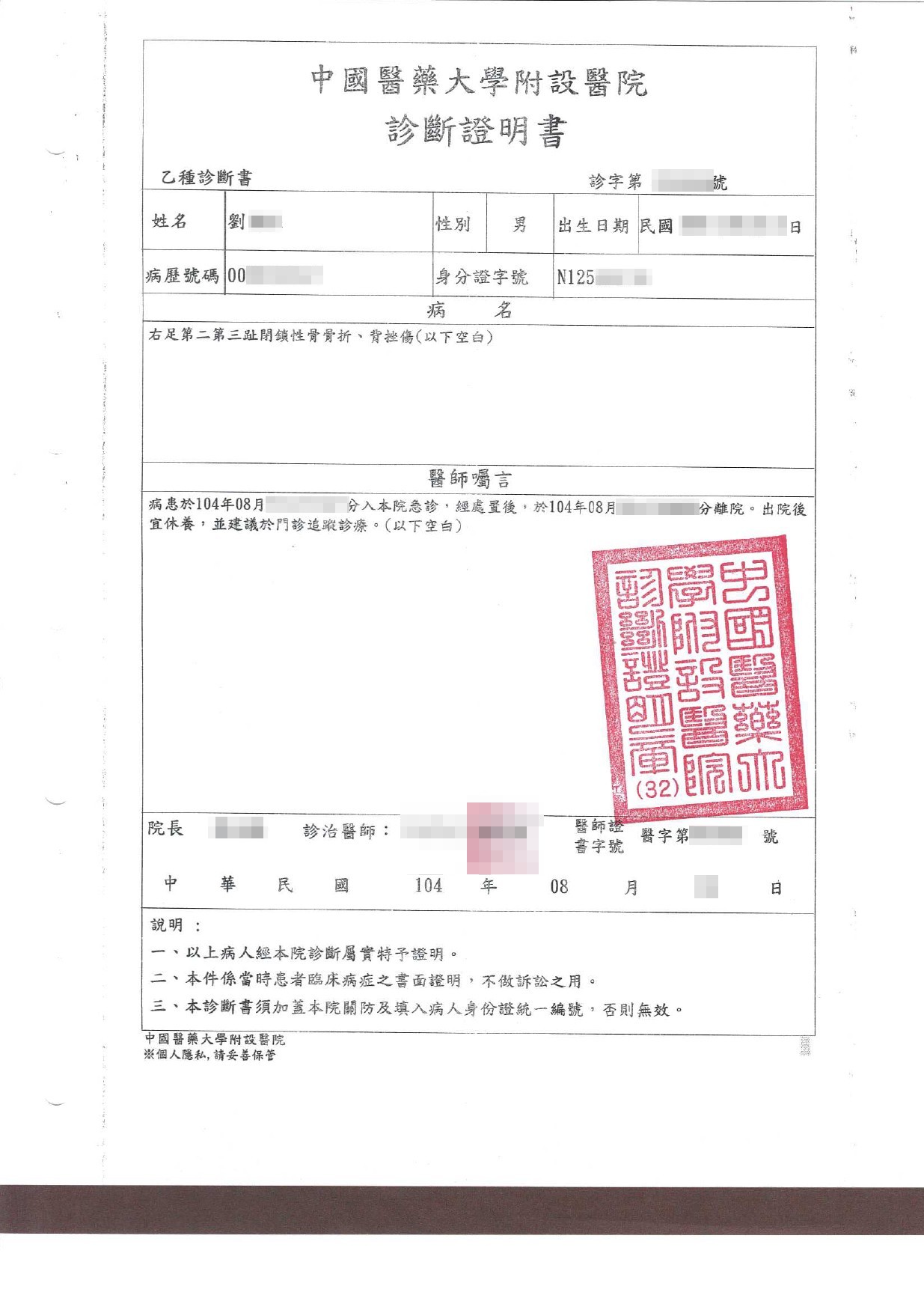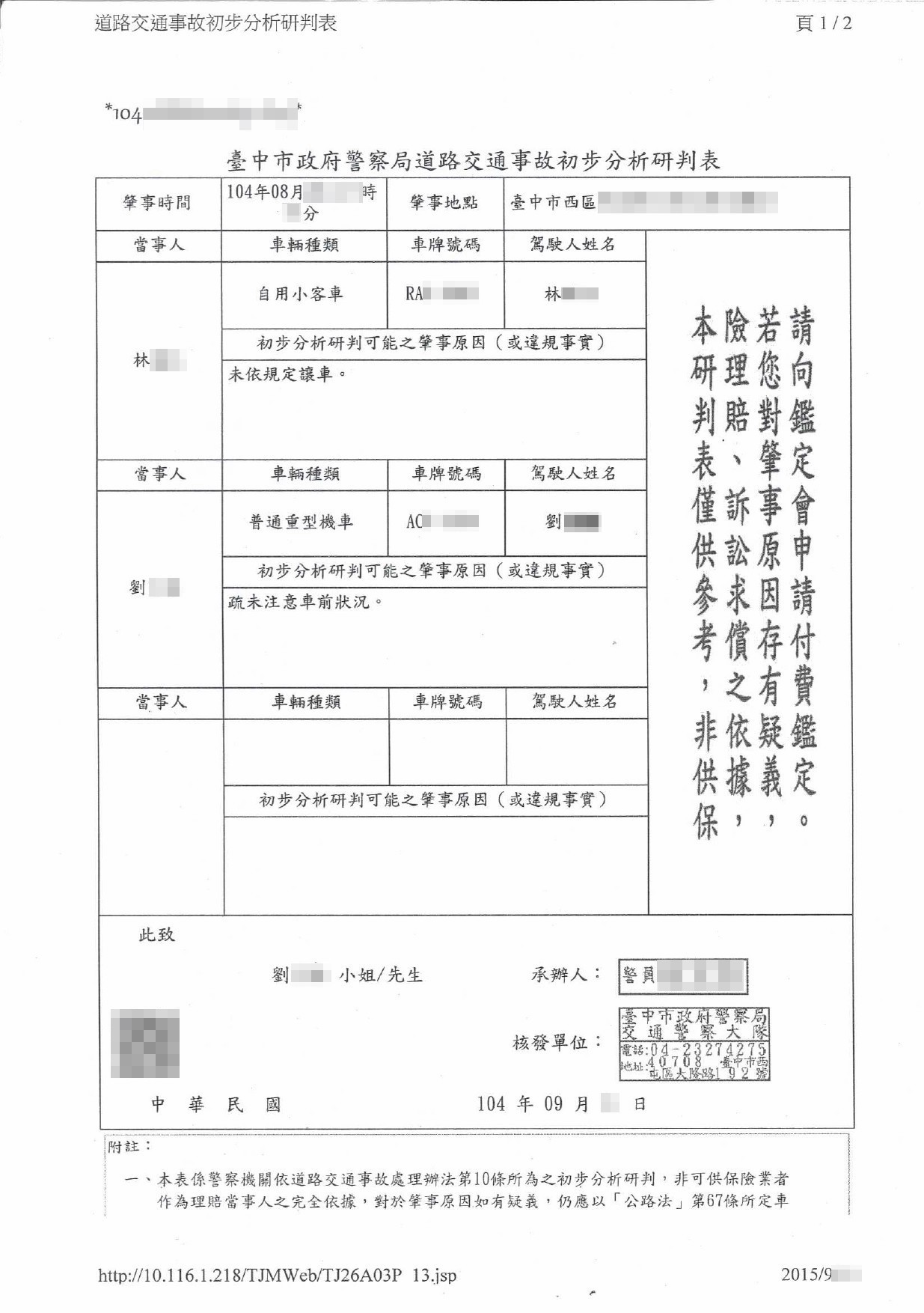 案件類型: 車禍案件。 發生時地: 104年8月 台中市西區。 面談過程: 劉先生於台中市西區騎機車行經十字路口,不慎與右方行駛過來的自小客車發生碰撞。本公司業務人員在開發客戶時認識劉先生,得知這起車禍案件劉先生並無相關專業知識可以圓滿處理,亦無人可提供專業協助。業務人員向劉先生說明本公司透過專業可以給予最好的幫忙,效果往往會大於自行處理後,劉先生決定將此案件委託本公司協助。 委任關鍵: 1.我方當事人沒有事故相關處理經驗。 2.保險公司主張我方當事人為左方來車應佔七成肇事責任,補償金額很難爭取。 處理結果: 協助當事人收集相關資料並商議如何爭取補償金,我方當事人總計獲得補償金額100,000元。 案件資料: 事故登記單 初判表 診斷書