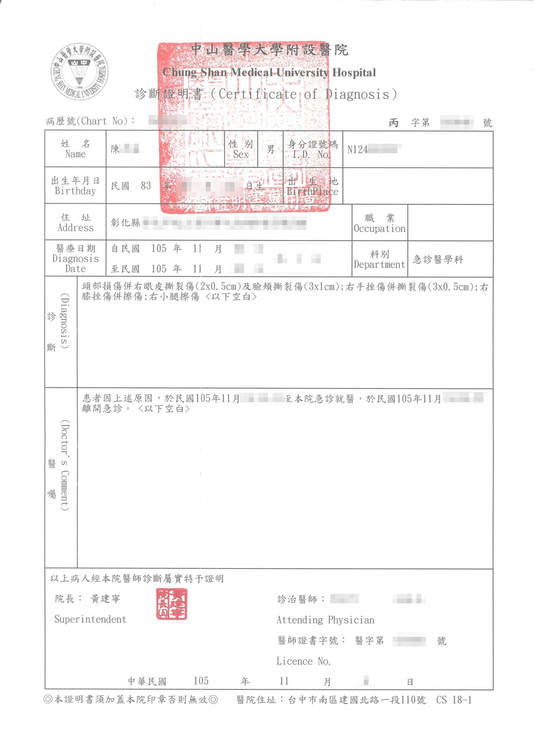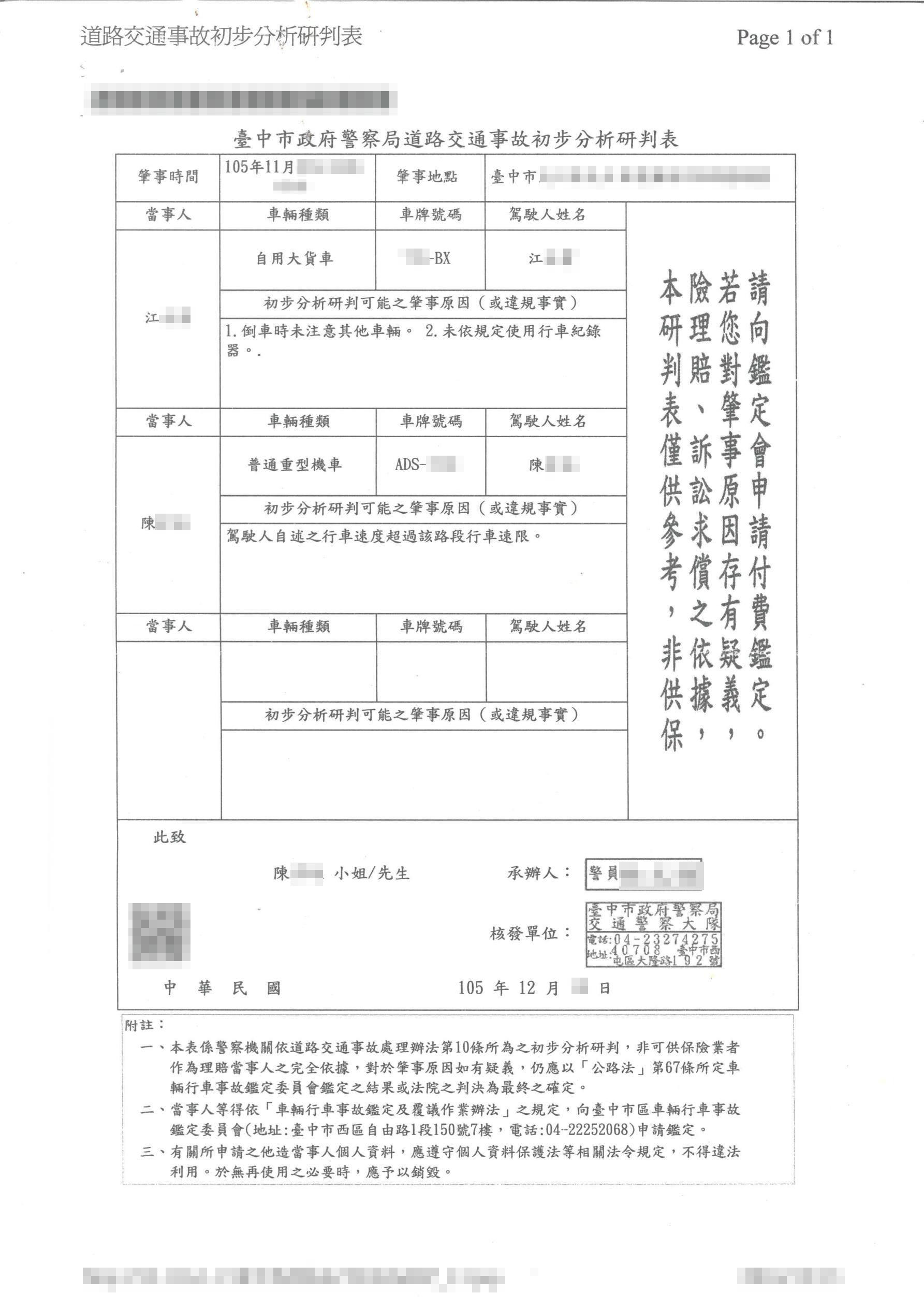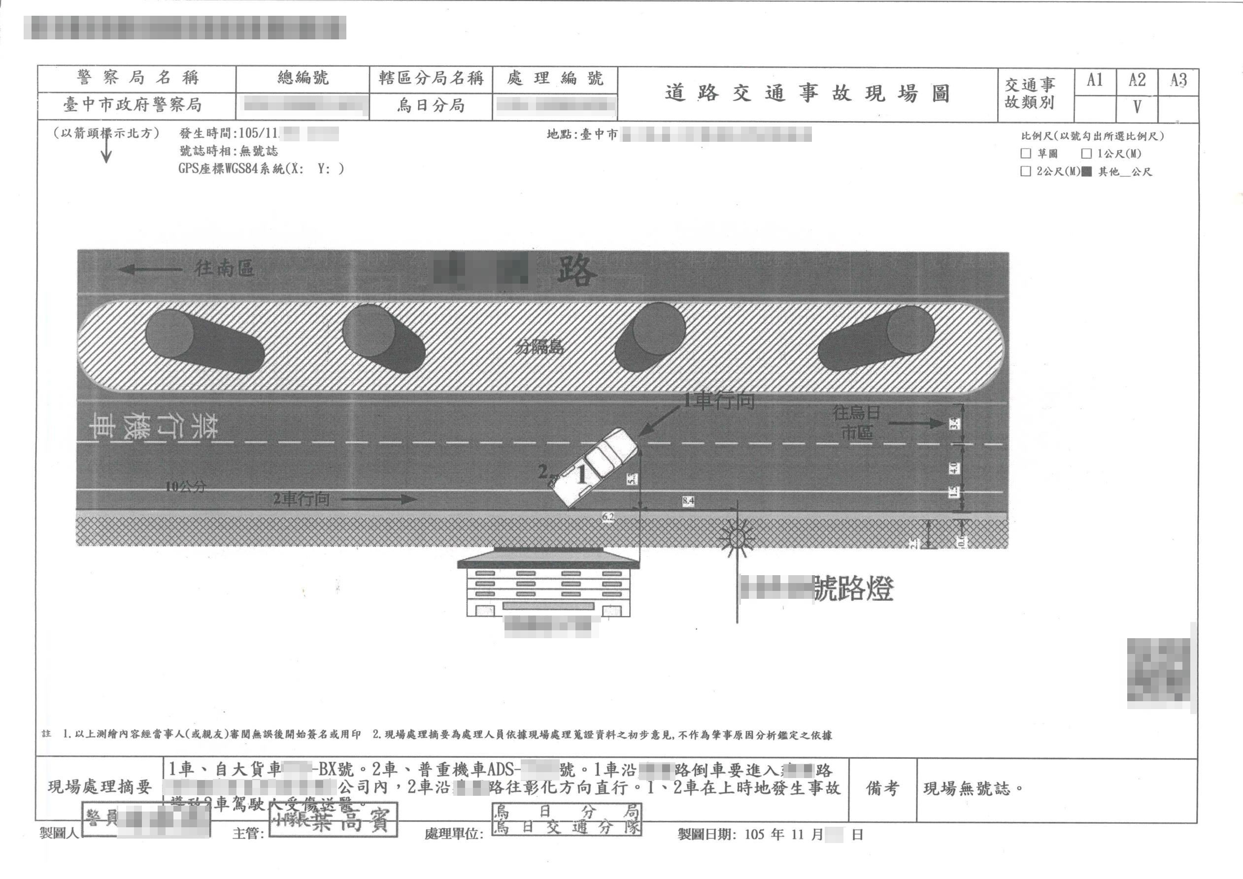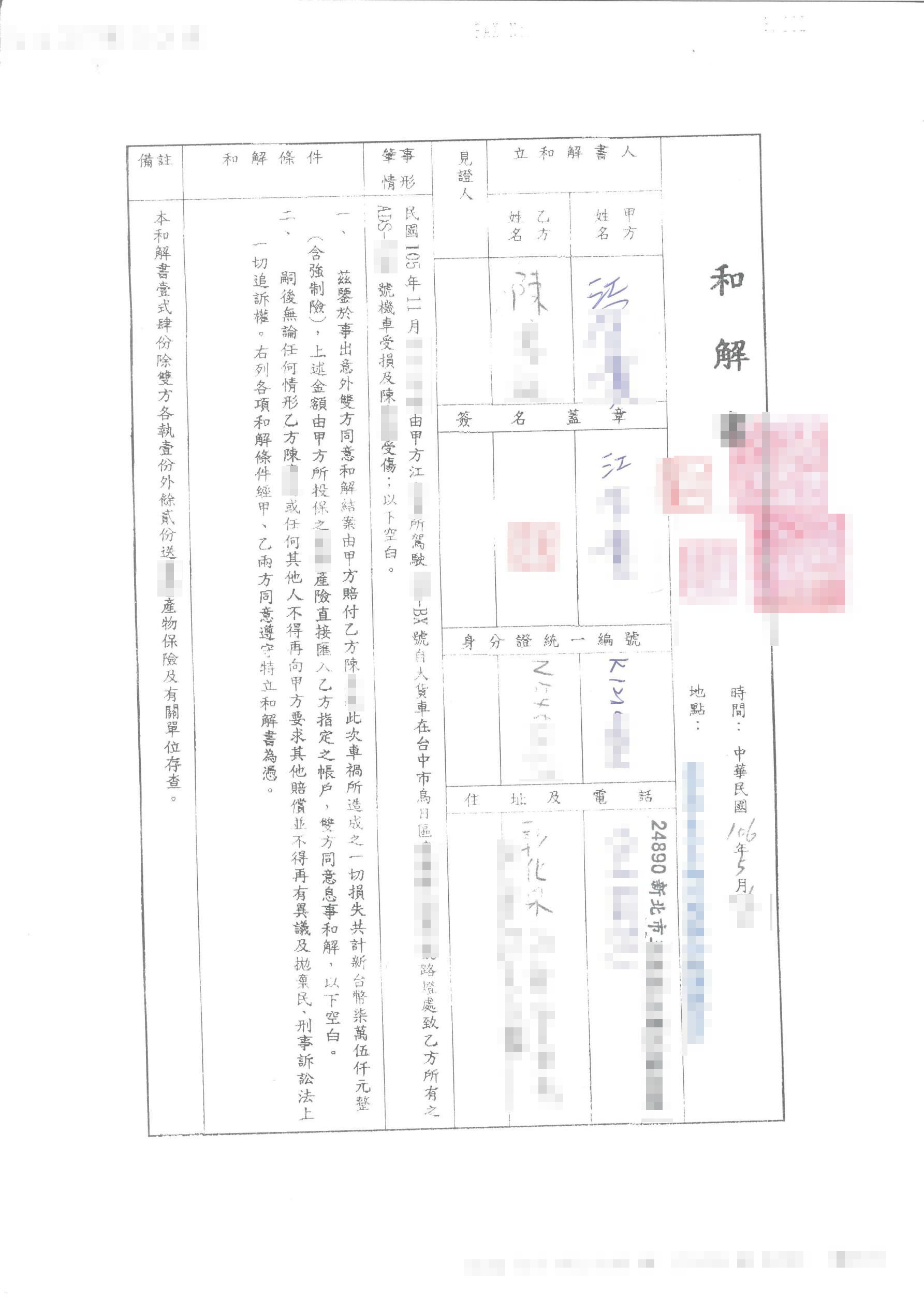 案件類型: 車禍案件。 發生時地: 105年11月 台中市烏日區。 面談過程: 陳先生騎機車行經台中市烏日區某公司大門,該公司之大貨車司機於倒車出馬路時未注意來車不慎與陳先生發生碰撞,陳先生受有車損及體傷。陳先生在跟保險公司交涉的過程中,屢遭保險公司拖延,直至事發四個月後在醫院遇到本公司業務人員,了解經由專業人員協助處理或許能省下不必要的拖延時間與心力,而且所獲之賠款金額可以更合理且完整,思量後決定將此案件交由本公司協助。 委任關鍵: 1.我方當事人自行處理時屢遭保險公司拖延。 2.我方當事人對交通事故處理沒有經驗,不知如果理算合理求償金額。 處理結果: 協助當事人收集相關資料並申請賠償,共計獲得賠款75,000元。 案件資料: 現場圖 初判表 診斷書 估價單 和解書