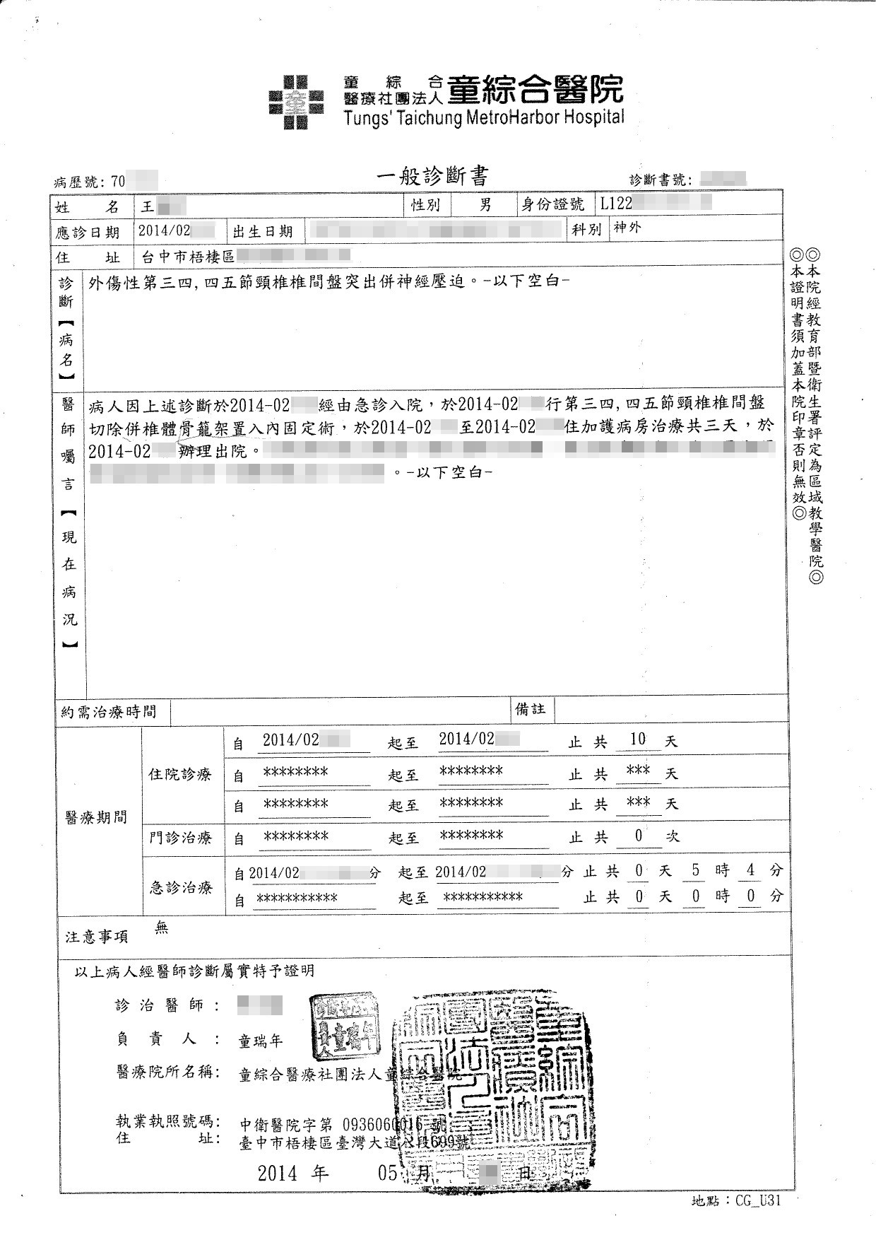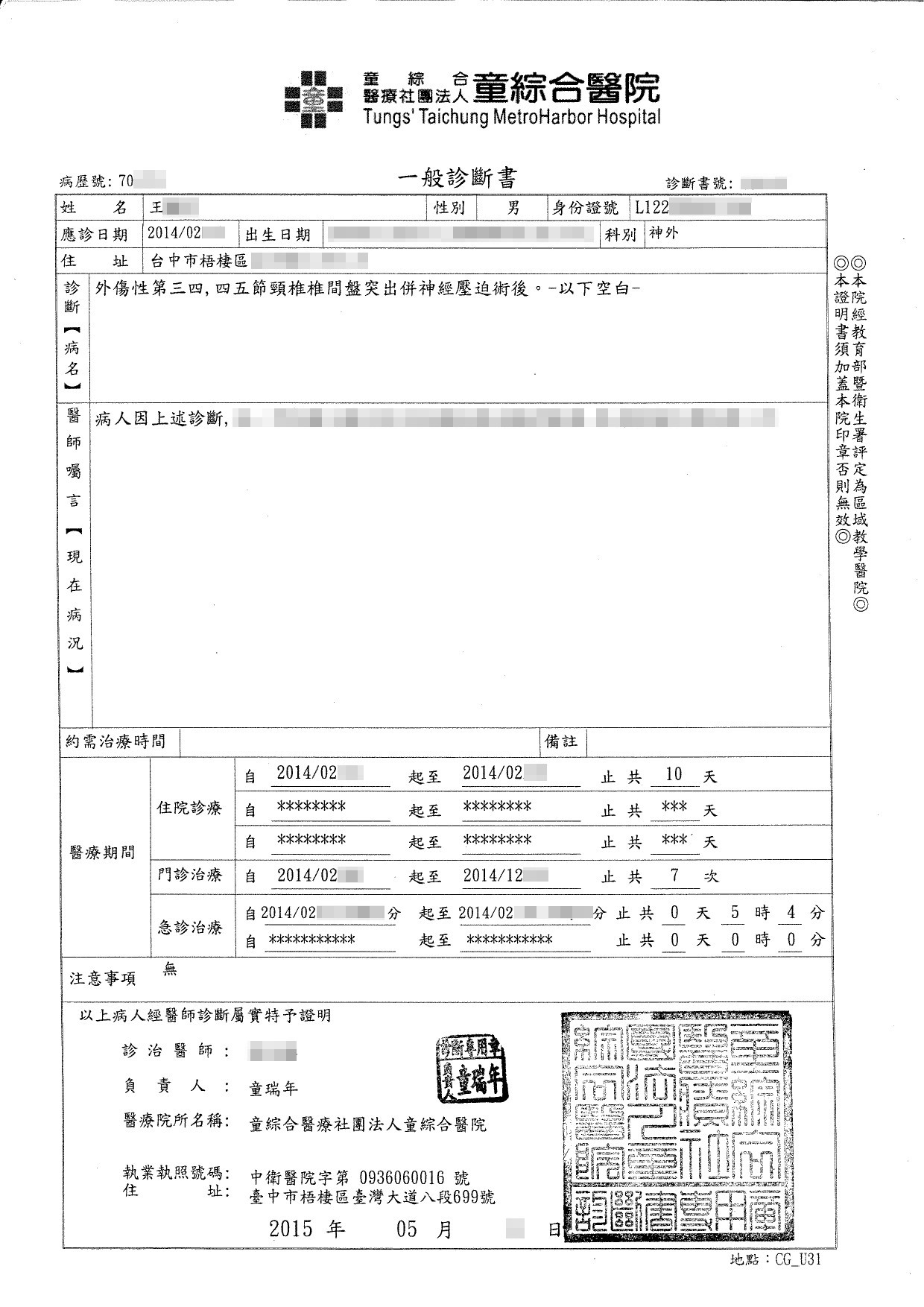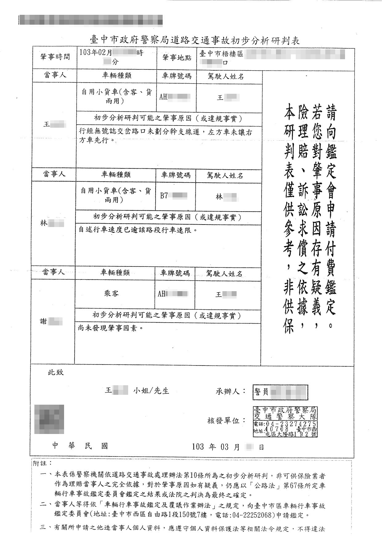 案件類型: 車禍案件。 發生時地: 103年2月 台中市梧棲區。 面談過程: 王先生於台中市梧棲區駕駛自小客車行經十字路口,不慎與另一部自小客車發生碰撞。本公司業務人員在開發客戶時認識王先生,得知這起車禍案件王先生並無相關專業知識可以圓滿處理,亦無人可提供協助。業務人員向王先生說明本公司透過專業可以給予最好的幫忙,效果往往會大於自行處理後,王先生決定將此案件委託本公司協助。 委任關鍵: 1.我方當事人沒有事故相關處理經驗。 2.我方當事人肇事責任較高,補償金額很難爭取。 處理結果: 協助當事人收集相關資料並商議如何爭取補償金,我方當事人總計獲得補償金額1,000,000元(未含強制險醫療給付)。 案件資料: 初判表 診斷書