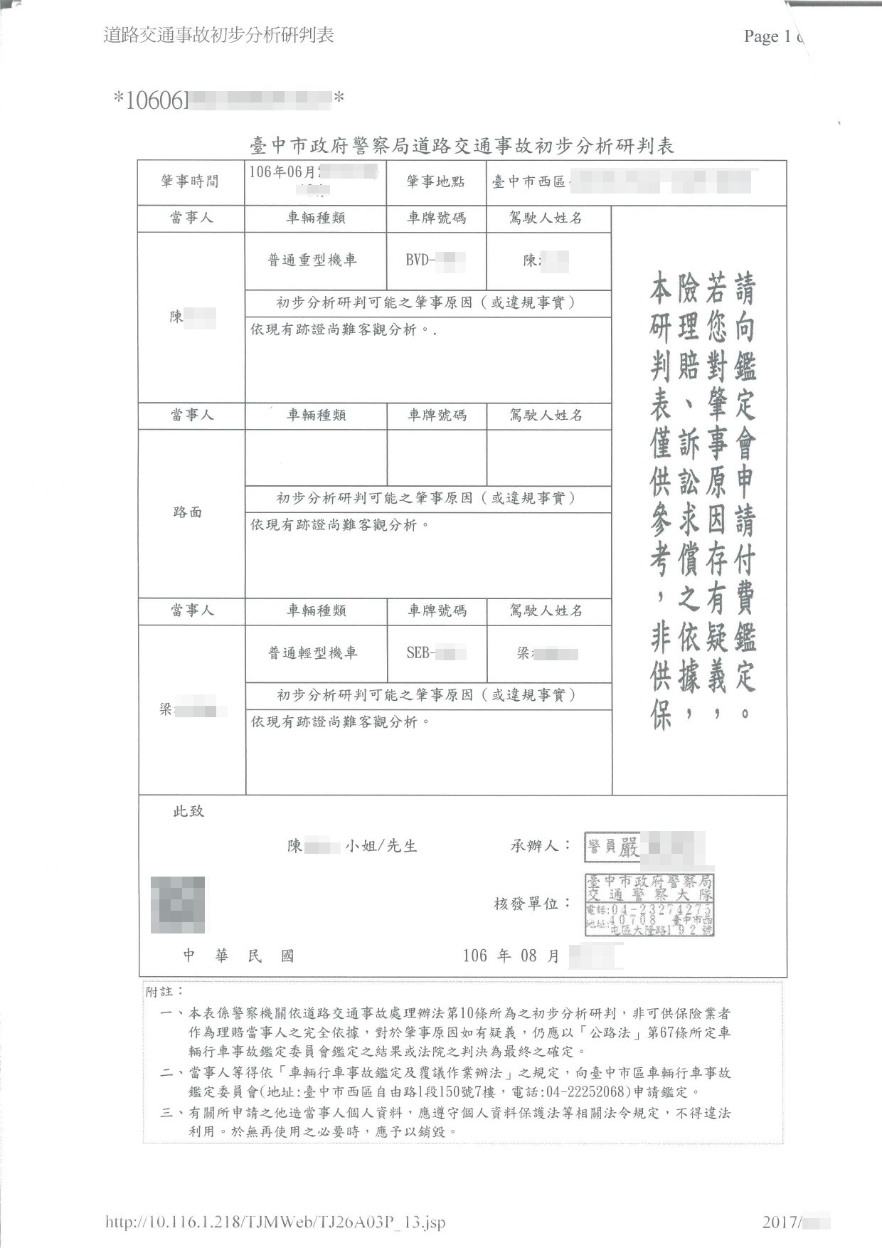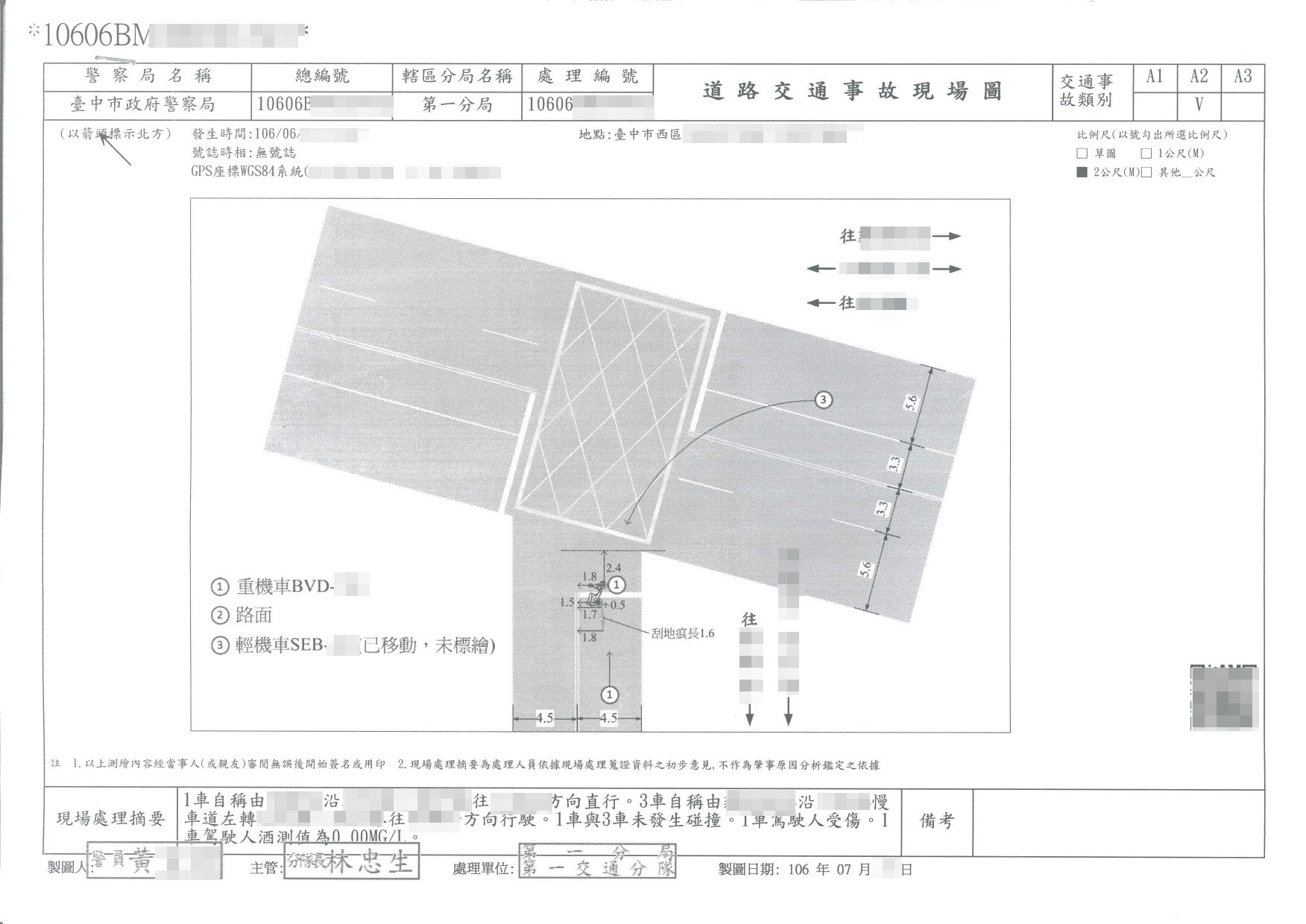 案件類型: 車禍案件。 發生時地: 106年6月 台中市西區。 面談過程: 陳先生騎車行經台中市西區某路口,遭對方違規左轉之機車驚嚇導致摔車,受有體傷及車損。對方認為兩車無碰撞,因此不肯負責賠償事宜,我方當事人不知如何處理,故委託本公司協助處理。 委任關鍵: 1.對方認為兩車無碰撞,是我方自摔,他沒有需要負責。。 處理結果: 協助當事人收集相關資料並申請補償金,我方當事人總計獲得266,000元。 案件資料: 現場圖 初判表 診斷書 和解書