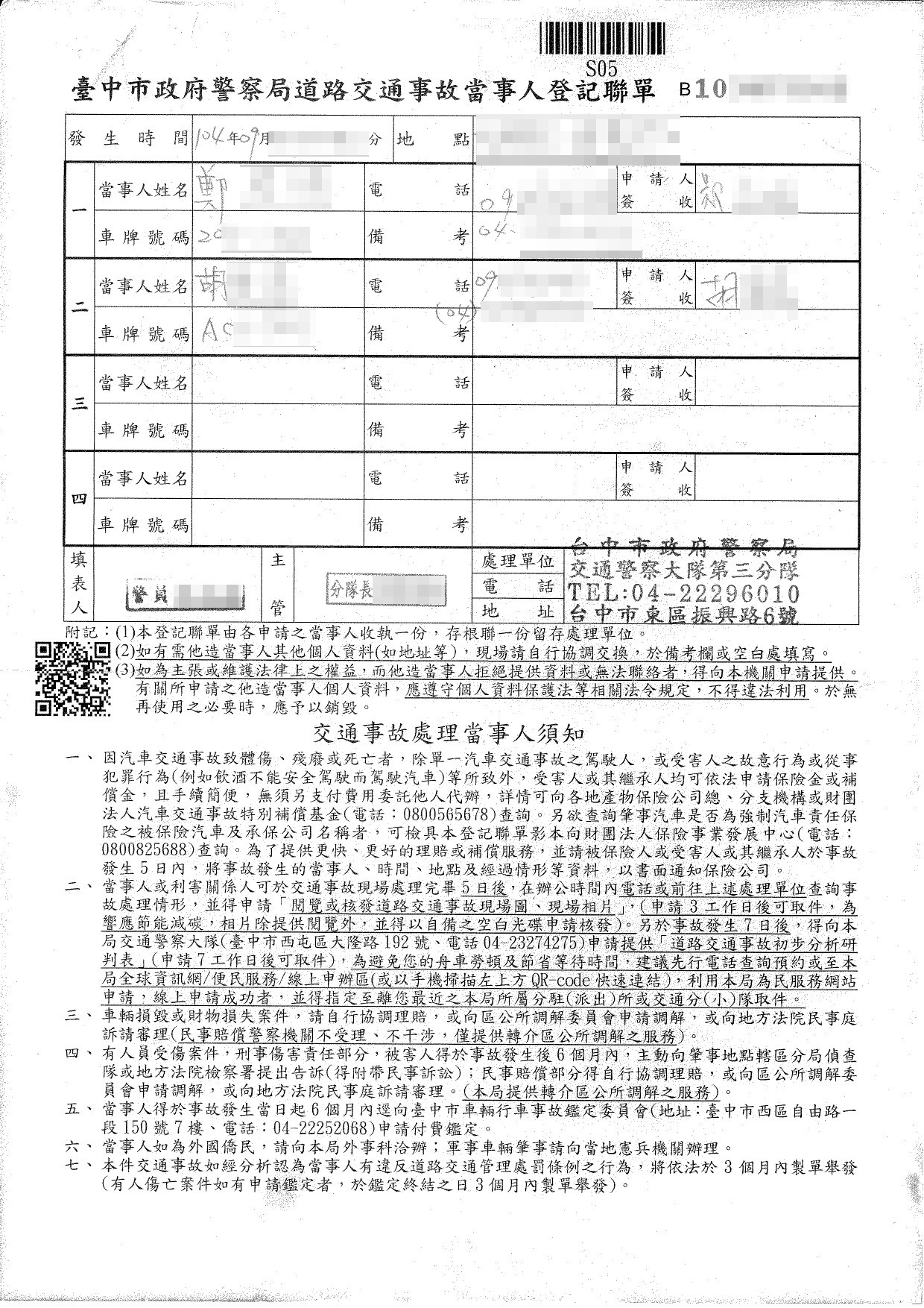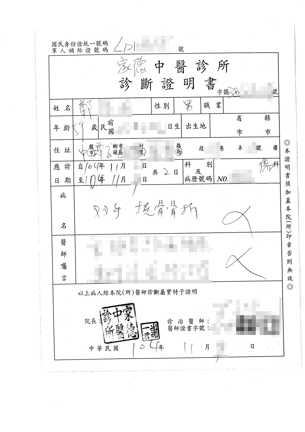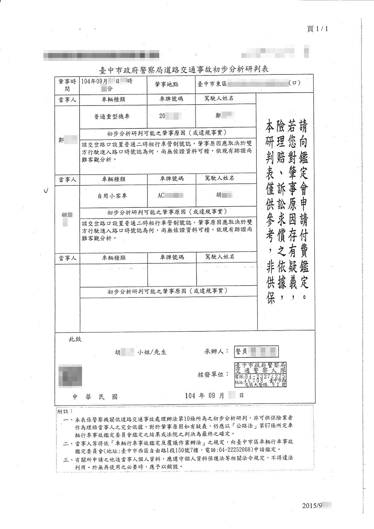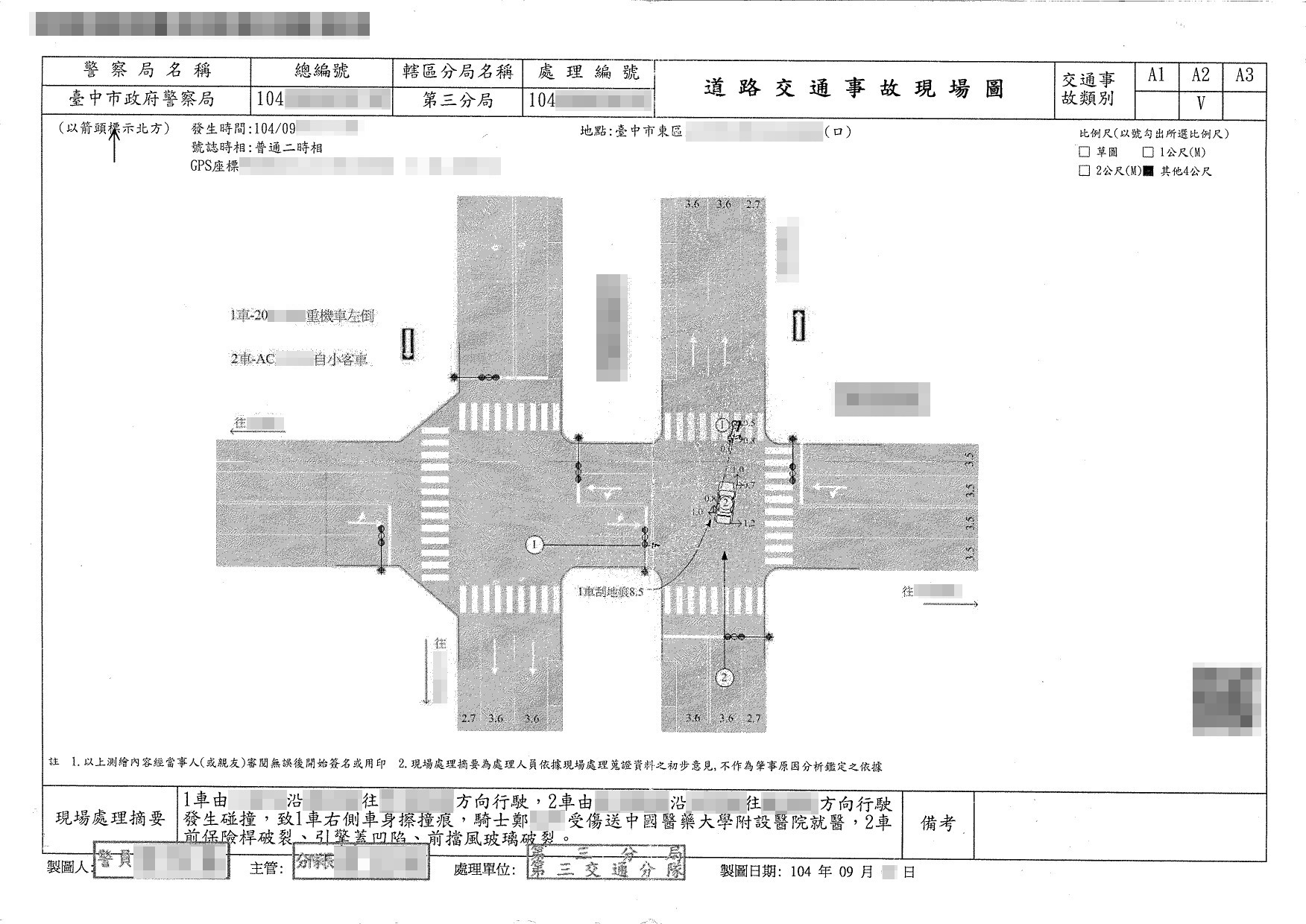 案件類型: 車禍案件。 發生時地: 104年9月 台中市東區。 面談過程: 鄭先生騎機車行經台中市東區某路口,與右方行駛而來的自小客車發生碰撞,鄭先生受傷骨折以及機車損毀。車禍發生後鄭先生向朋友轉述事故過程,朋友告訴鄭先生這起車禍他的肇事責任比較大不好處理。後來鄭先生至中國醫回診時遇到本公司業務人員,業務人員向鄭先生說明透過專業人員的協助,通常能夠把補償金額爭取到最合理的範圍,不僅省時免費心,效果也往往比自己處理好得多,因此決定將此案件委託本公司協助。 委任關鍵: 1.我方當事人無事故處理經驗。 2.朋友告知我方當事人其肇事責任較重,補償金額不好爭取。 處理結果: 協助當事人收集相關資料並商議如何爭取補償,我方當事人總計獲得補償金額250,000元。 案件資料: 事故登記單 現場圖 初判表 診斷書