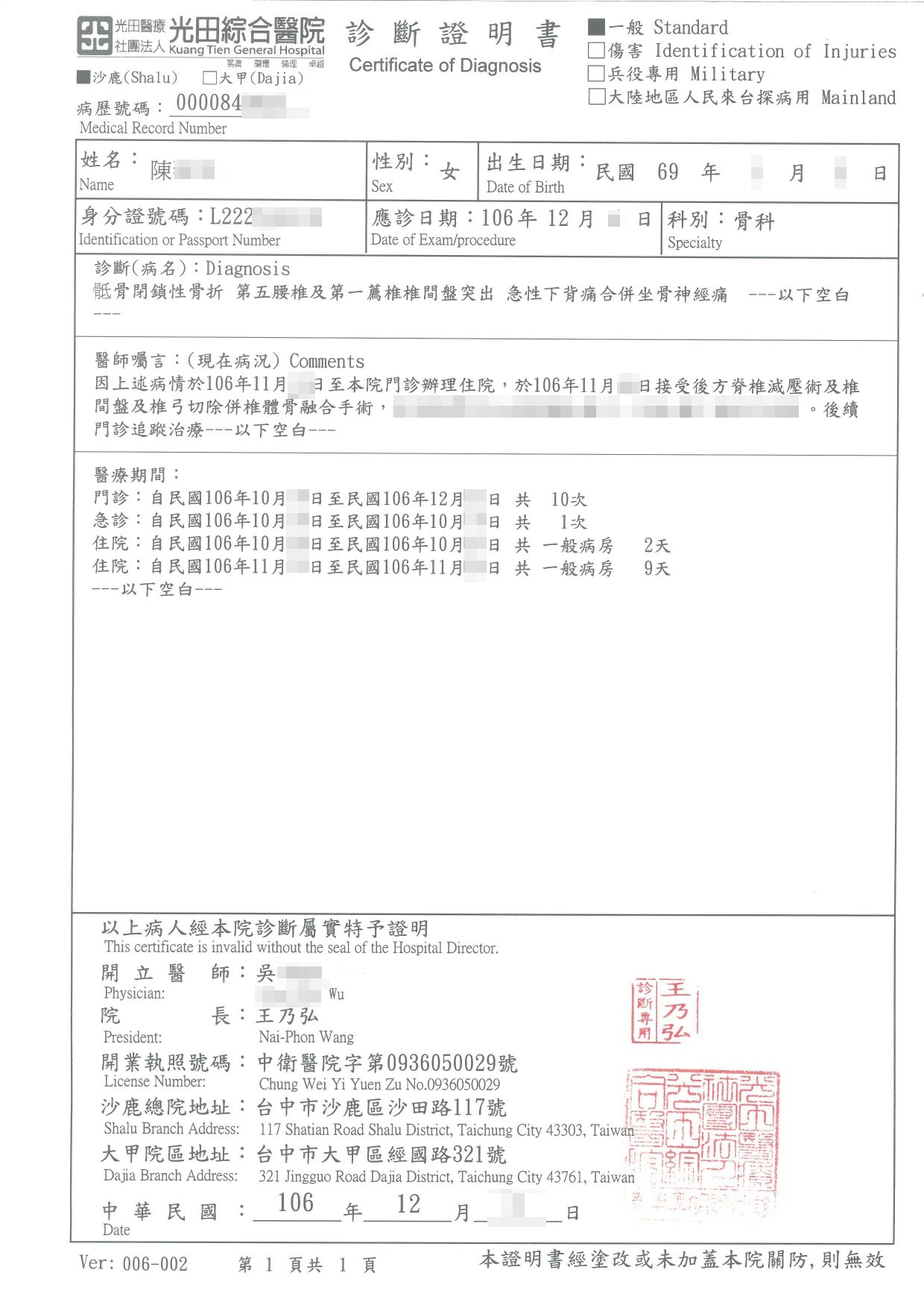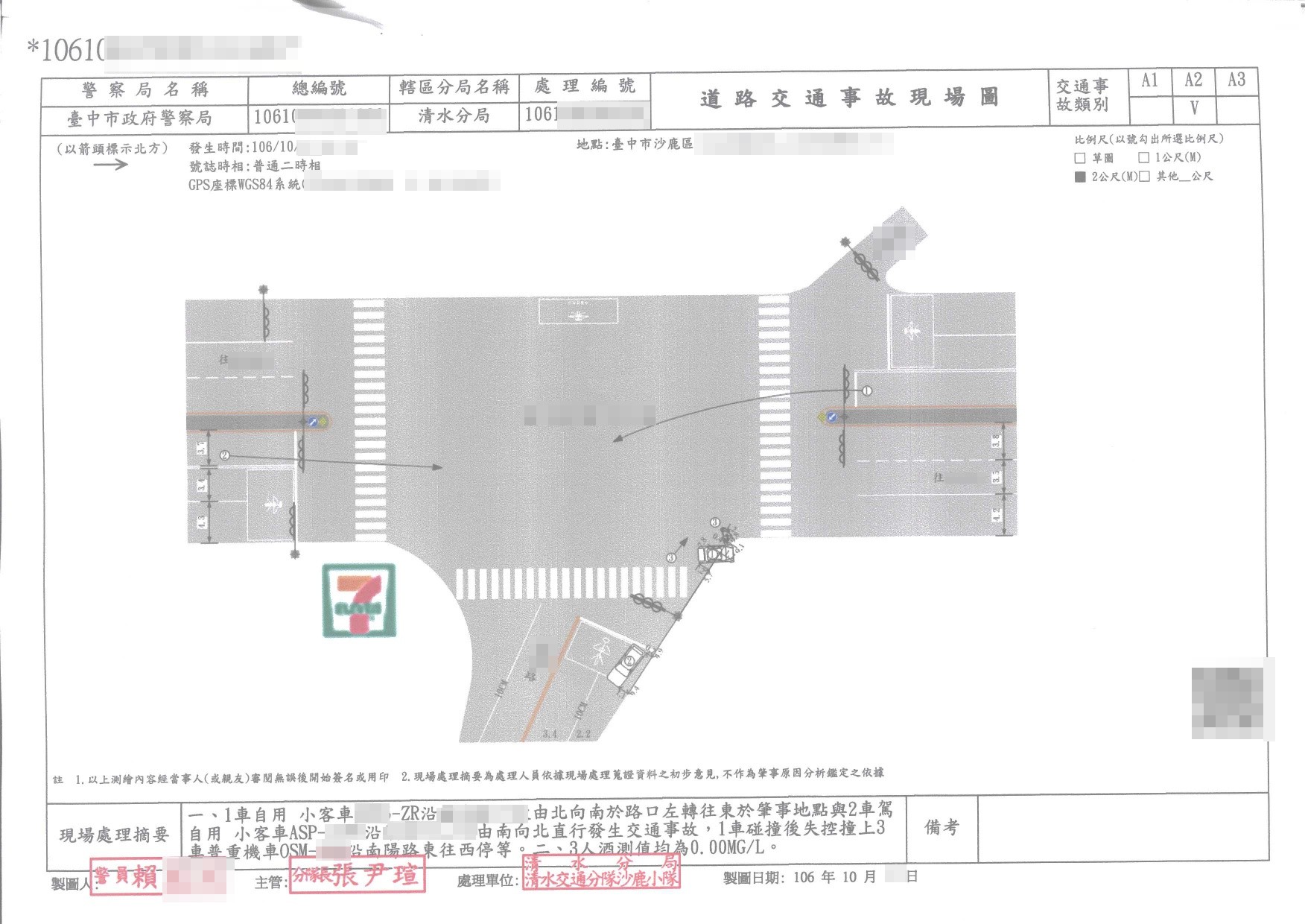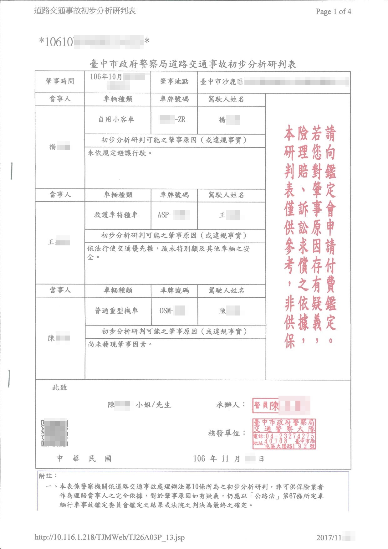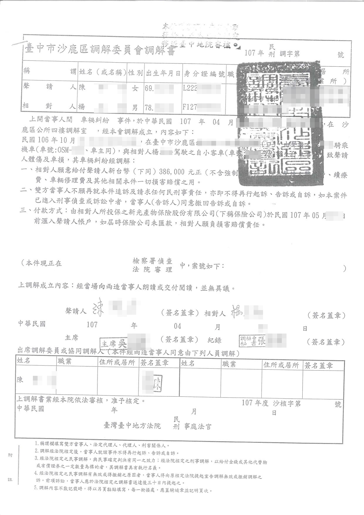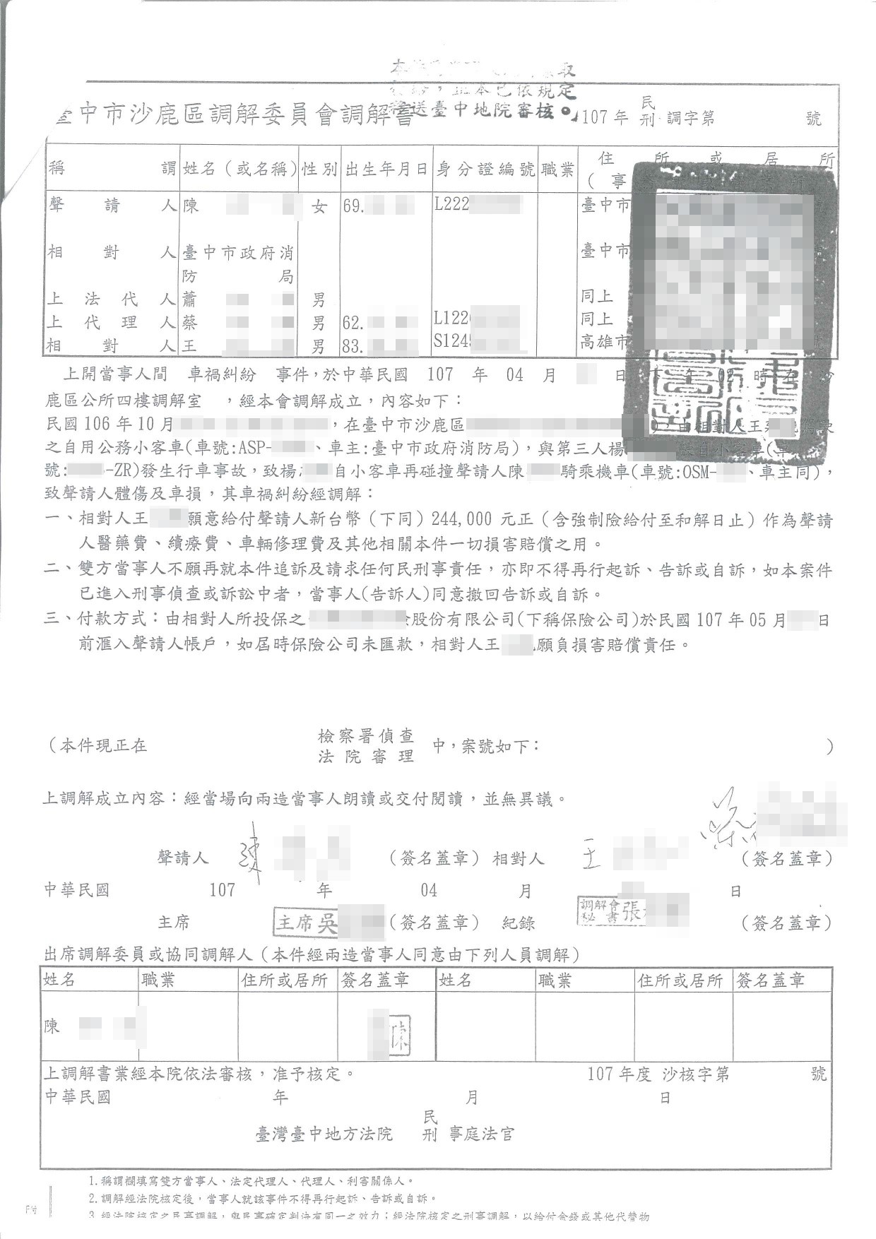 案件類型: 車禍案件。 發生時地: 106年10月 台中市沙鹿區。 面談過程: 行經台中市沙鹿區某路口之自小客車與救護車發生碰撞後,自小客車失控偏向,碰撞到停等紅燈之我方當事人陳小姐,致車損及嚴重體傷。陳小姐剛好認識本公司之業務人員,亦知車禍處理是否具有專業素養會影響理賠金甚鉅,便直接聯絡本公司業務人員委託此事件之處理。 委任關鍵: 我方當事人知道車禍處理專業素養很重要,亦認識本公司之業務人員。 處理結果: 協助當事人收集相關資料並申請補償金,我方當事人總計獲得630,000元。 案件資料: 現場圖 初判表 診斷書 和解書1 和解書2