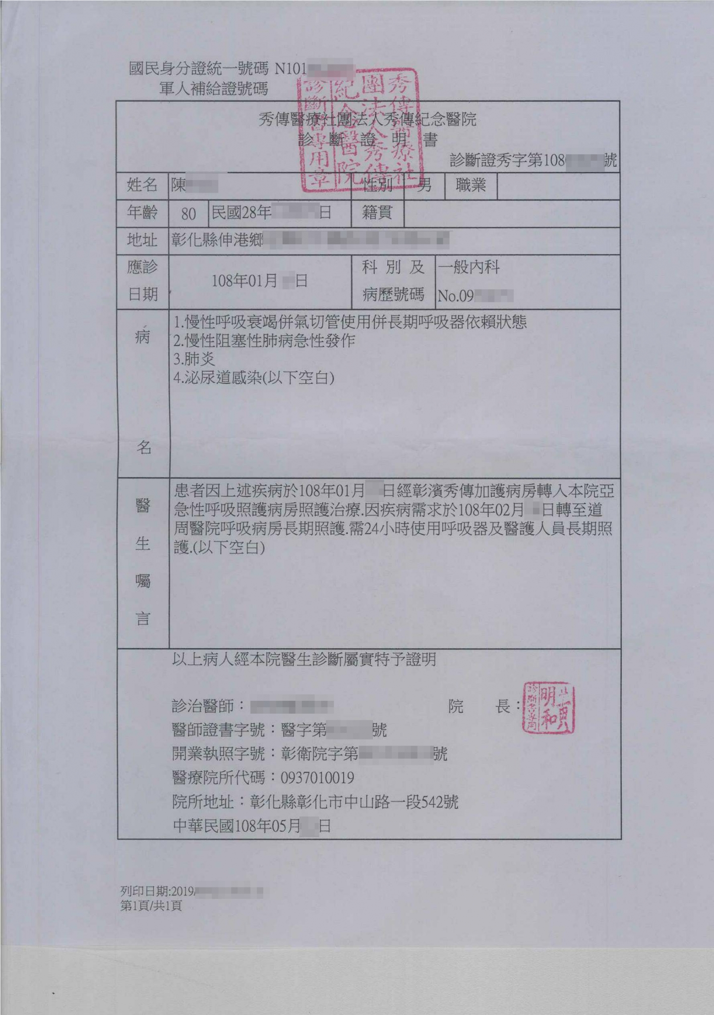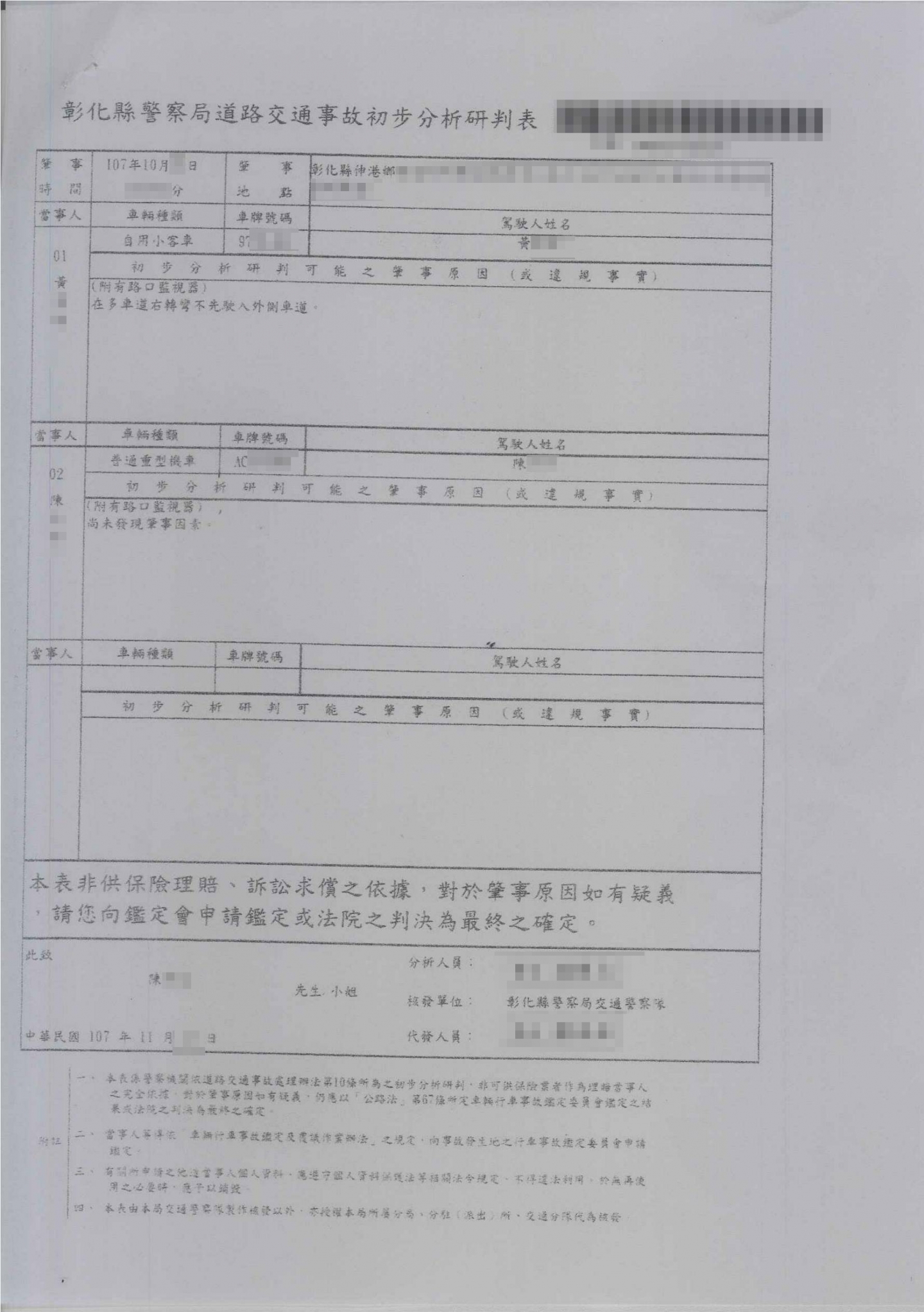 案件類型: 車禍案件。 發生時地: 107年10月 彰化縣伸港鄉。 面談過程: 陳老先生騎車行經彰化縣伸港鄉某路口,經右轉車輛撞擊,造成嚴重體傷及多項併發症。陳老先生的子女們沒有車禍處理經驗,而且陳老先生的身體狀況亟需家人照料,子女們根本無法分神於車禍處理,在談論案件過程中深感若有能夠信任的專業人士予以協助,事情處理起來會比較安心省事,因此決定將此事件交由本公司處理。 委任關鍵: 1.我方當事人子女無相關處理經驗,怕因為不夠專業而吃虧。 2.我方當事人的身體狀況亟需家人照料,子女們根本無法分神於車禍處理。 處理結果: 協助當事人收集相關資料並申請賠償,我方當事人共計獲得補償金額3,200,000元。 案件資料: 初判表 診斷書