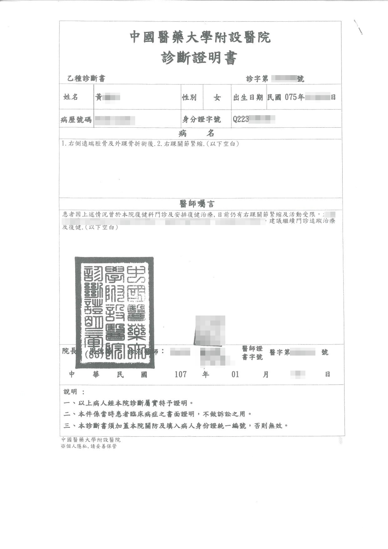 案件類型: 勞保失能案件。 發生時地: 106年2月 台中市。 面談過程: 黃小姐於106年2月在家不慎跌倒,傷及右腳腳踝,後來經多次治療及復健,都未能完全治癒。某次本公司業務人員在開發業務時與黃小姐聊到此事,向其索取相關醫療資料交由本公司法務人員進行評估後,告知黃小姐這個案件我們可以協助他申請勞保理賠,若未能成功不會收費。黃小姐很訝異他的狀況竟可申請勞保給付,明白告知我們雖然他不知道有沒有機會,但願意交由我們試試。 委任關鍵: 我方當事人不知他的狀況有機會申請勞保理賠,也不知如何申請。 處理結果: 協助當事人收集相關資料並向勞保局提出申請,我方當事人取得勞保普通傷病失能給付69,816元。 案件資料: 診斷書 勞保核定給付通知書