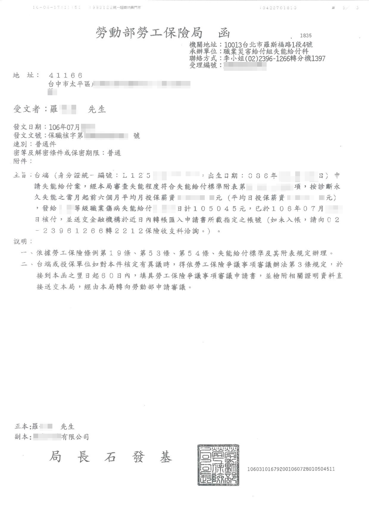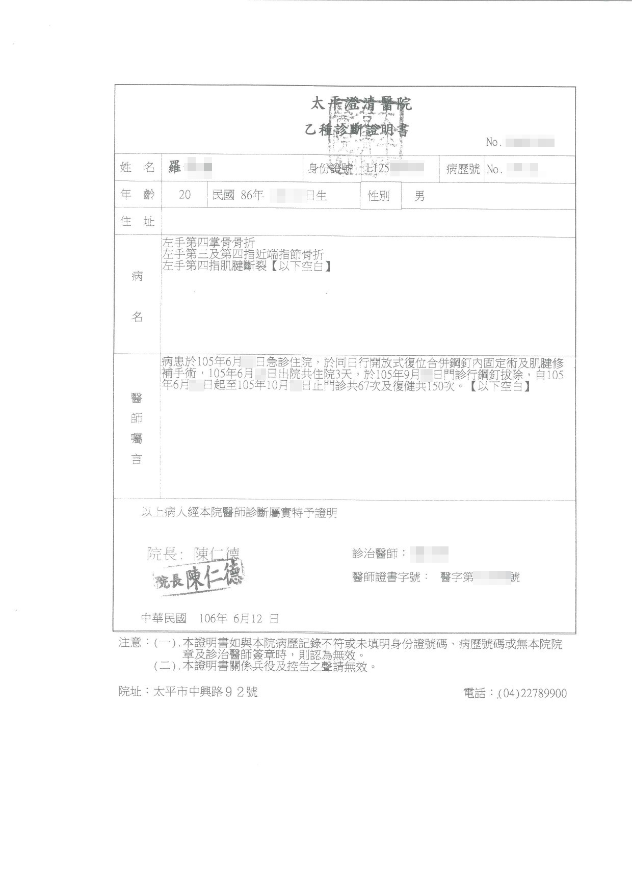 案件類型: 職業災害案件。 發生時地: 105年6月 台中市太平區。 面談過程: 羅先生於台中某工廠工作時因同事疏忽致鋼板倒下壓傷左手,導致手部骨折及肌腱斷裂。本公司業務人員於業務開發過程中得知羅先生向公司要求補償時公司不予理會,故建議羅先生透過專業可以給予最好的協助,羅先生決定將此案件委託本公司協助。 委任關鍵: 我方當事人向公司要求補償時公司不予理會。 處理結果: 協助當事人收集相關資料並商議如何爭取補償,我方當事人獲得公司補償250,000元、勞保給付105,045元,合計355,045元。 案件資料: 診斷書 勞保核付函