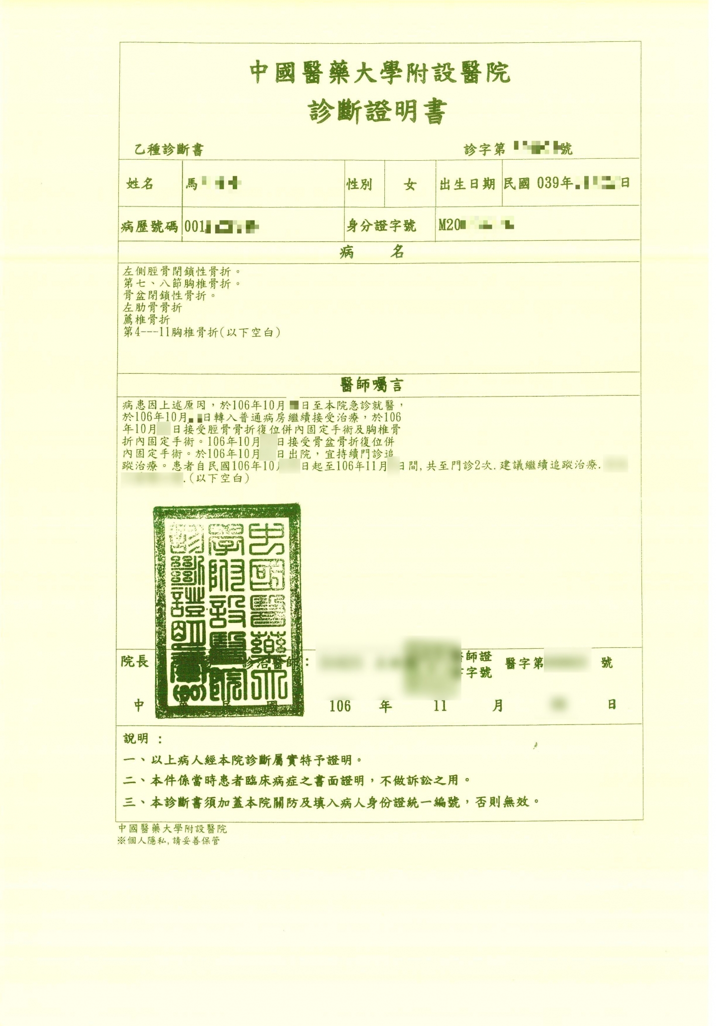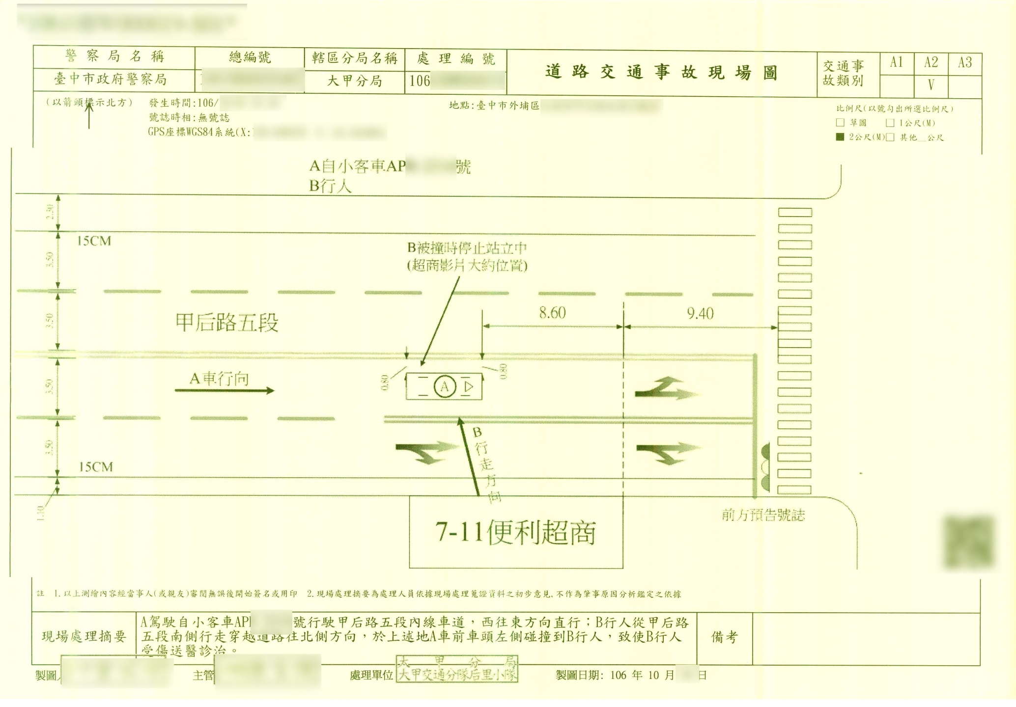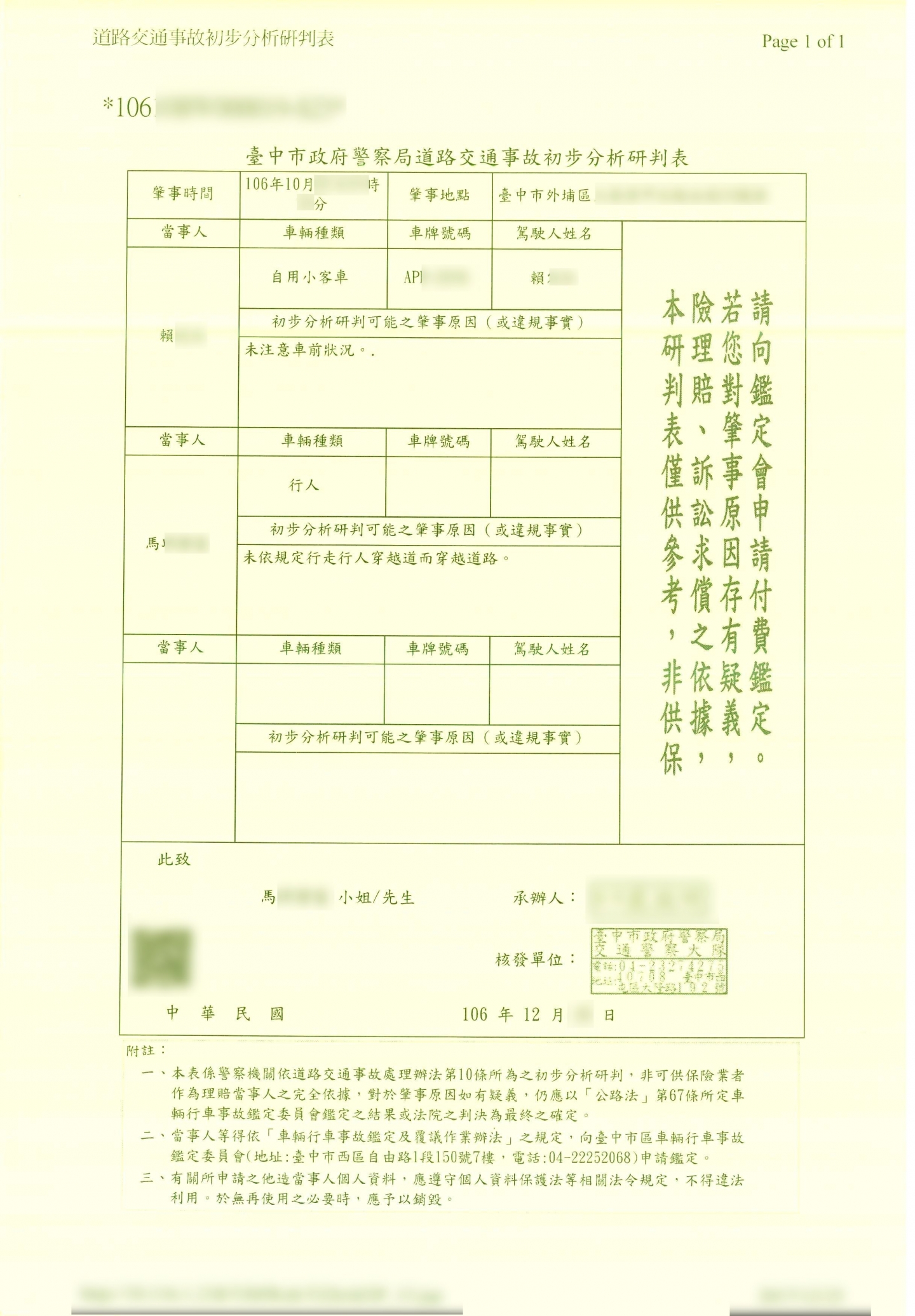 案件類型: 車禍案件。 發生時地: 106年10月 台中市外埔區。 面談過程: 馬邱小姐穿越馬路時未依規定行走行人穿越道,致使對方不慎開車撞上。在處理過程中對方認為穿越雙黃線就是要負全責,完全沒有打算賠款。考量身體狀況需積極治療且行動不便,難以分神於車禍處理,馬邱小姐深感若有能夠信任的專業人士予以協助,事情處理起來會比較安心省事,效果亦佳,因此決定將此事件交由本公司處理。 委任關鍵: 對方認為我方當事人穿越雙黃線,要負全責。 處理結果: 協助當事人收集相關資料並申請賠償,我方當事人共計獲得補償金額400,000元。 案件資料: 現場圖 初判表 診斷書