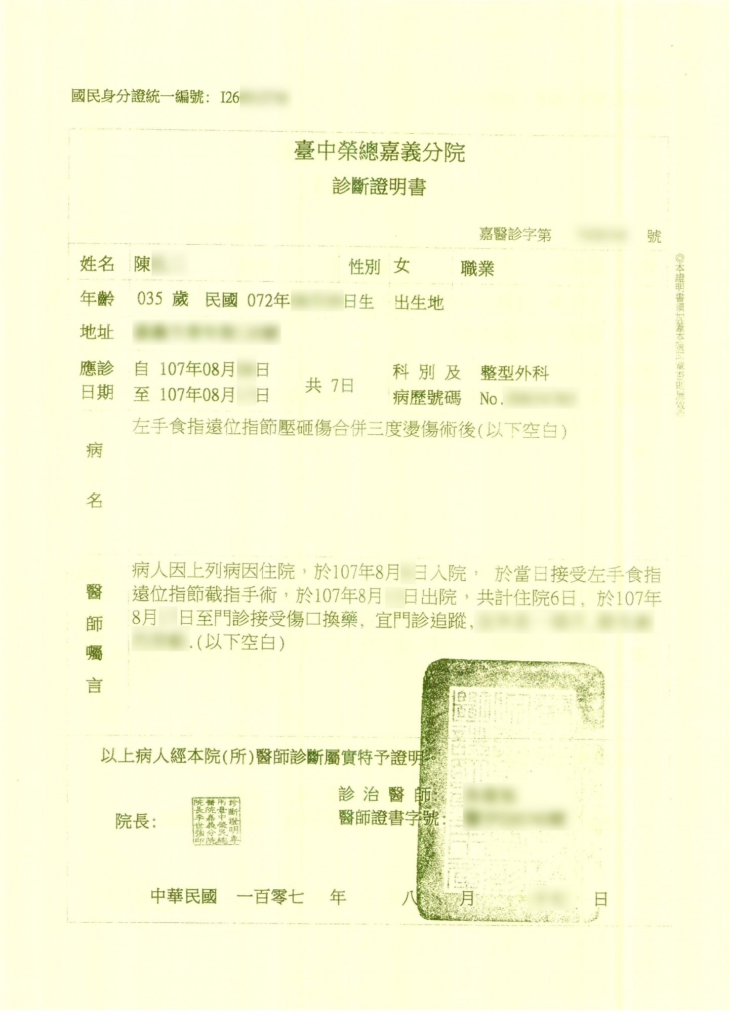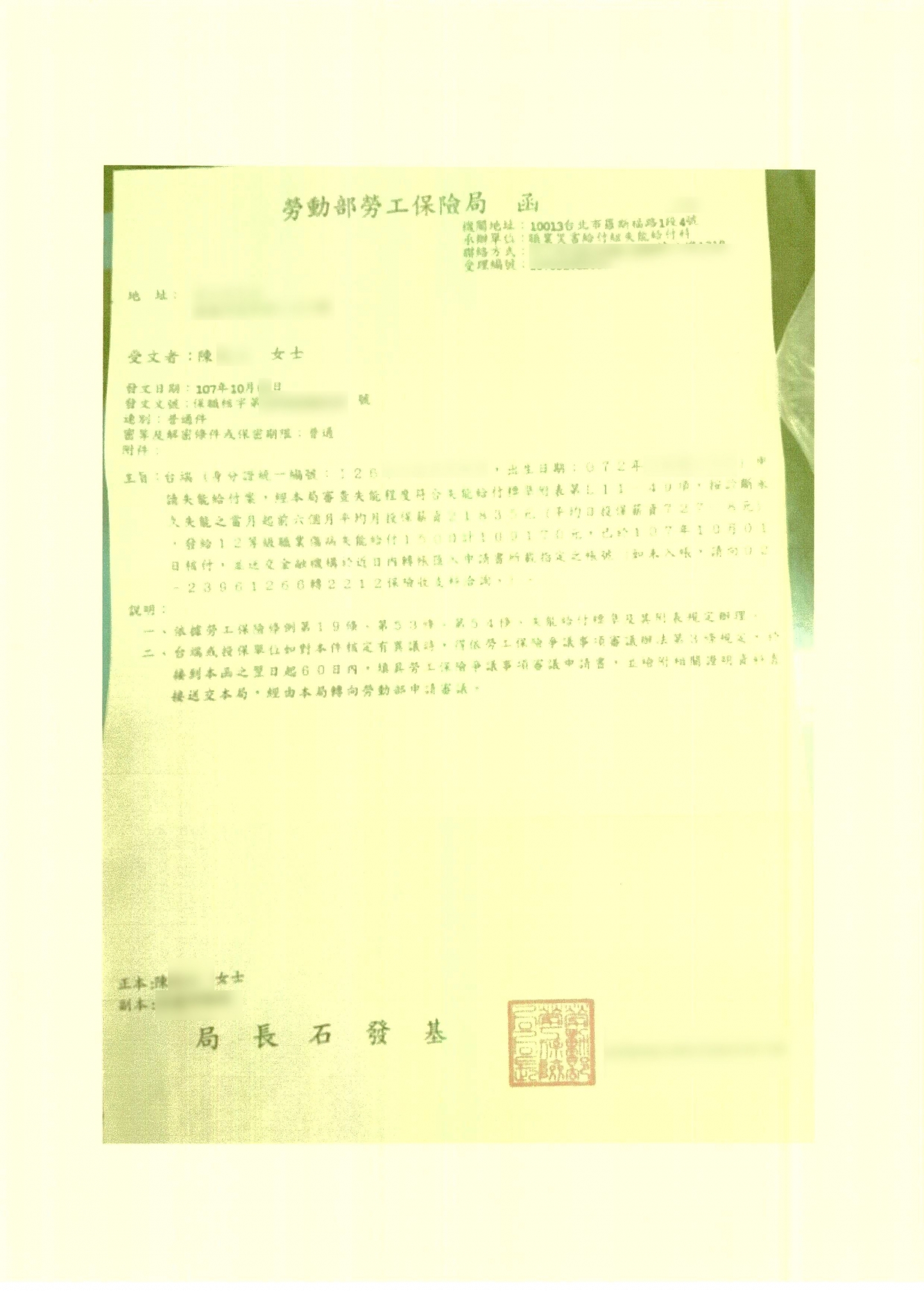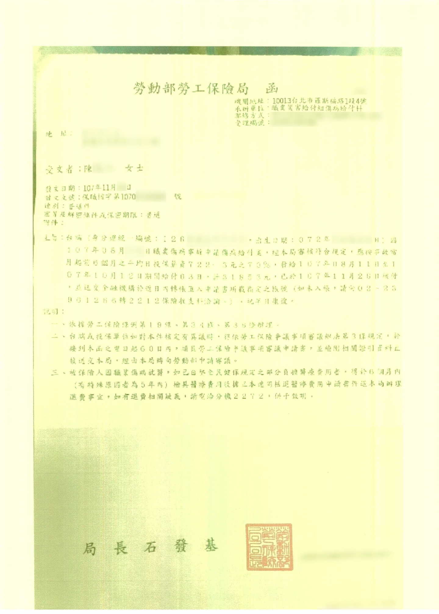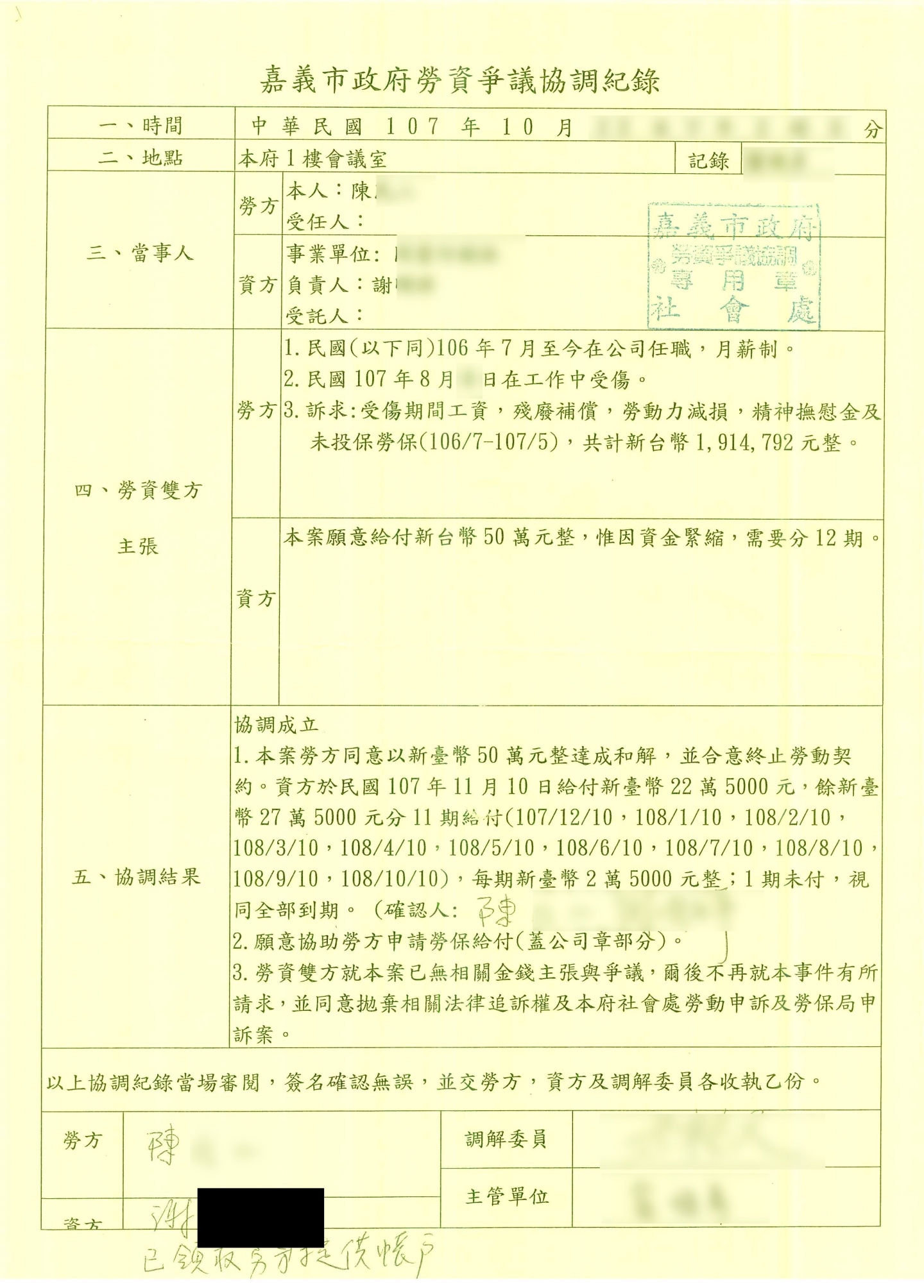 案件類型: 職業災害案件。 發生時地: 107年8月 嘉義市。 面談過程: 陳小姐在廠區工作時左手食指遭機器壓傷,因患部損害嚴重無法治療,因此施予截指手術。術後復原期間,陳小姐屢屢向老闆要求職業災害補償,但老闆皆不予理會。後來上網尋求協助管道,剛好看到本公司之網頁,經電話聯絡、約訪面談後,陳小姐認為本公司提供之服務剛好是她所需要的,便決定將此案件委託本公司協助。 委任關鍵: 我方當事人向老闆要求補償老闆皆不予理會。 處理結果: 協助當事人收集相關資料並商議如何爭取補償,我方當事人獲得公司補償500,000元、勞保給付141,023元,合計641,023元。 其中公司補償部份老闆於簽立和解書沒有依協議內容付款,而且避不聯絡,經本公司協助追討後該老闆同意一次性全額支付,沒有再拖欠款項。 案件資料: 診斷書 勞保核付函01 勞保核付函02 和解書