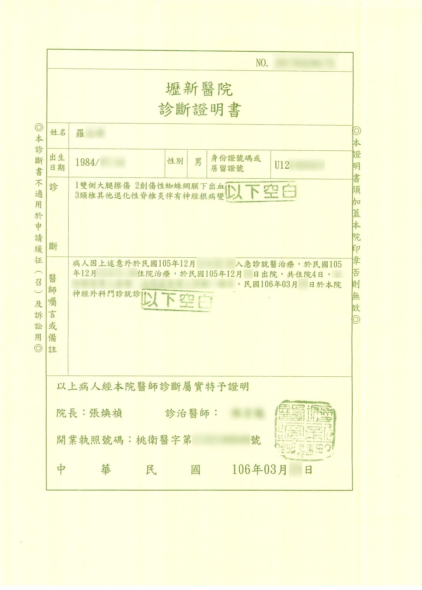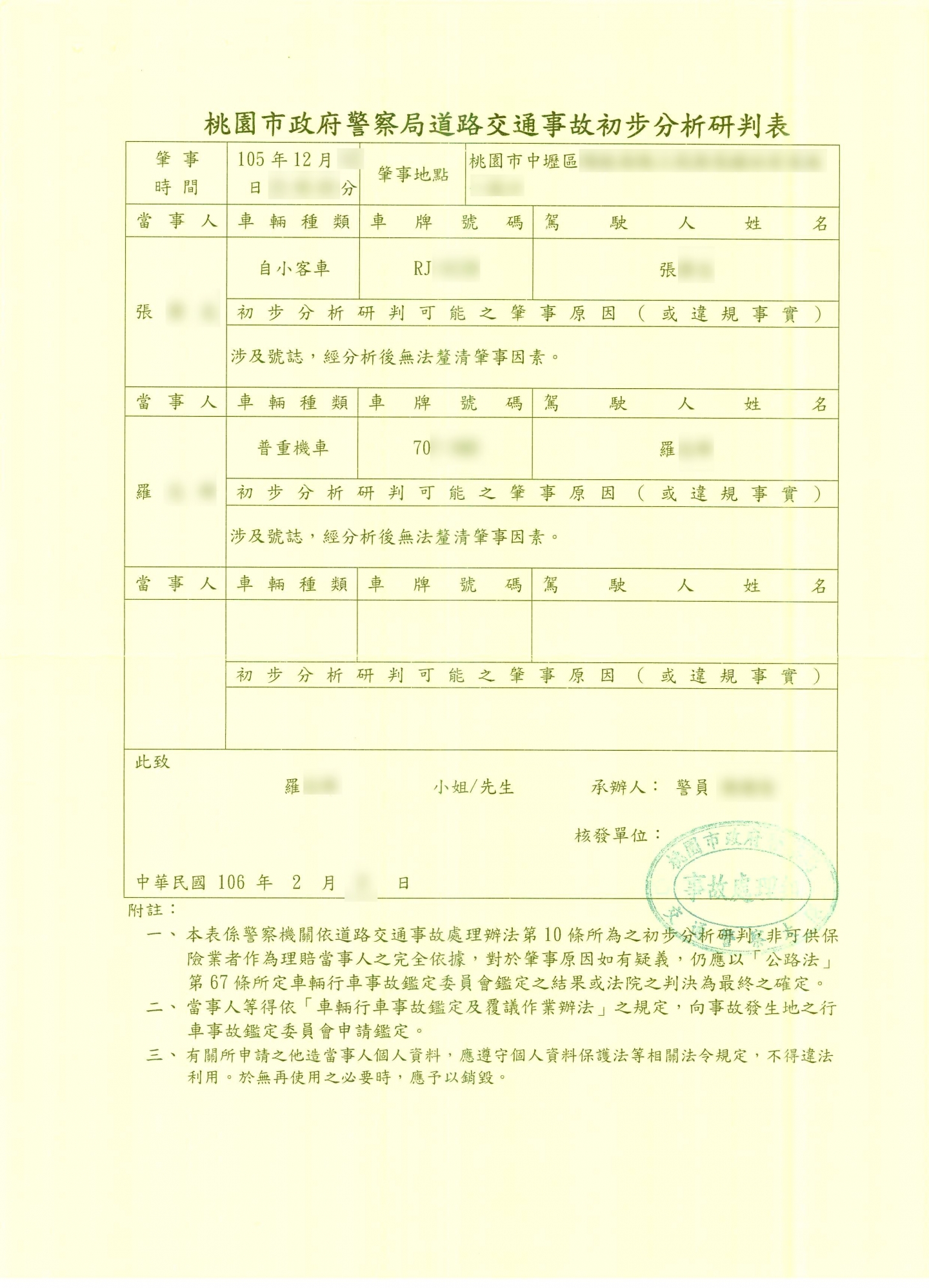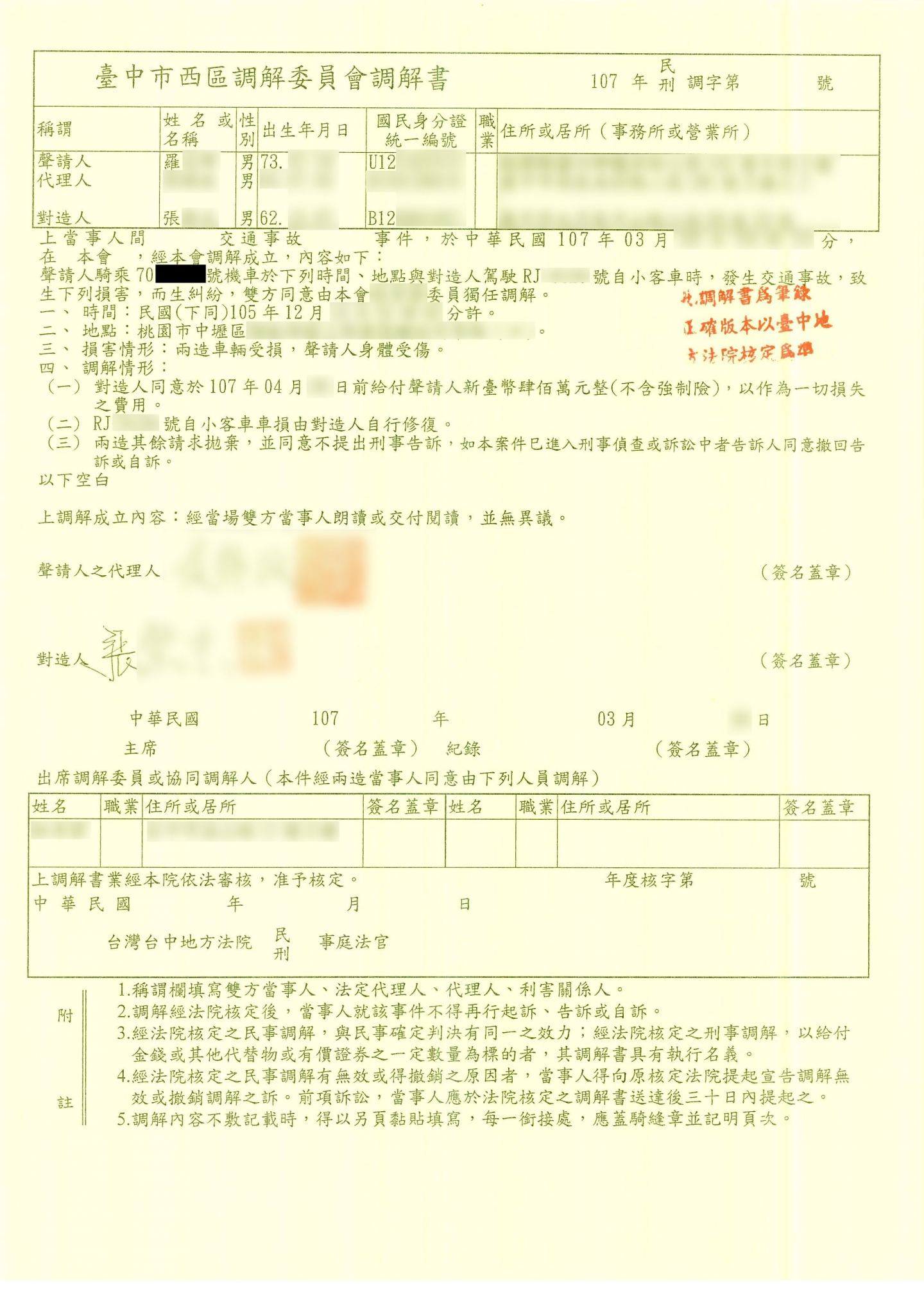 案件類型: 車禍案件。 發生時地: 105年12月 桃園市中壢區。 面談過程: 羅先生騎車行經桃園市中壢區某路口,遭對向欲左轉之自小客車撞擊,造成羅先生嚴重體傷及車損。一開始羅先生找自己熟識之保險業務人員代為處理此事,但對方保險公司願意賠償的金額一直無法達到羅先生的要求。後來經該保險業務員之介紹,羅先生得知本公司在此事能提供很大的協助,碰面會談中深感若有能專業人士介入處理,會比較安心省事,效果亦佳,因此決定將此事件交由本公司處理。 委任關鍵: 1.我方當事人之保險業務人員無法協談出合理之賠款。 2.經該保險業務人員之介紹,羅先生對本公司之處理能力有所期待。 處理結果: 協助當事人收集相關資料並申請賠償,我方當事人獲得對方賠償金額4,000,000元,各項保險給付570,000元,合計4,570,000元。 案件資料: 現場圖 初判表 診斷書 和解書