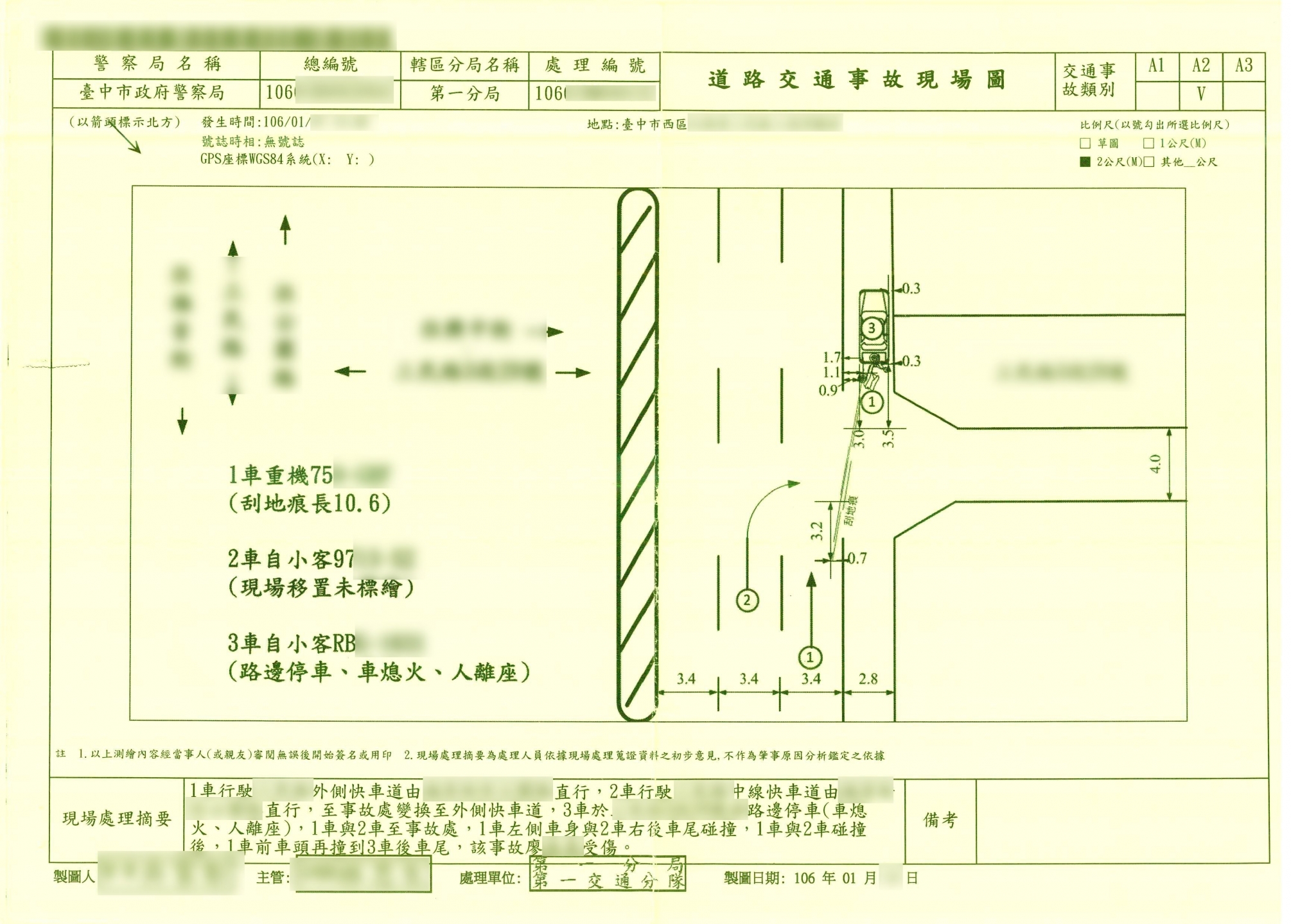 案件類型: 車禍案件。 發生時地: 106年1月 台中市西區。 面談過程: 廖先生工作完畢返回公司途中行經台中市西區某路口,來自左方欲右轉之自小客車未禮讓我方先直行,碰撞我方並造成再碰撞路邊之違停車輛,我方受有體傷及車損。廖先生完全沒有車禍處理經驗,而且從事的工作無法提供薪資證明,不知如何向對方要求薪資損失。在談論案件過程中深感若有能夠信任的專業人士予以協助,事情處理起來會比較安心省事,效果亦佳,因此決定將此事件交由本公司處理。 委任關鍵: 1.我方當事人無車禍處理相關經驗。 2.我方當事人之薪酬都領現金,無法提供相關薪資證明。 處理結果: 協助當事人收集相關資料並申請賠償,我方當事人獲得對方賠償金額400,000元,雇主工資補償120,000元,合計520,000元。 案件資料: 現場圖 初判表 診斷書 和解書頁1 和解書頁2