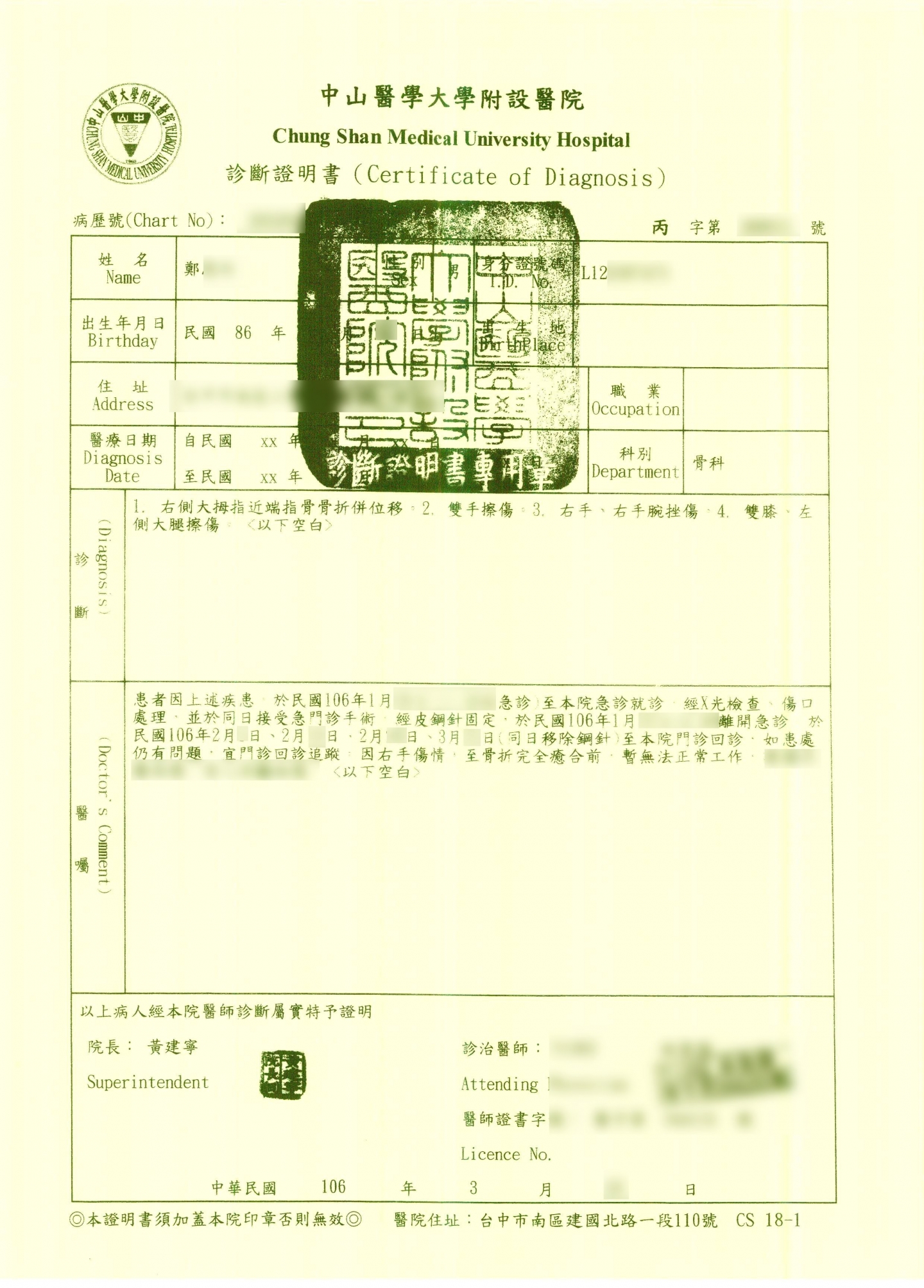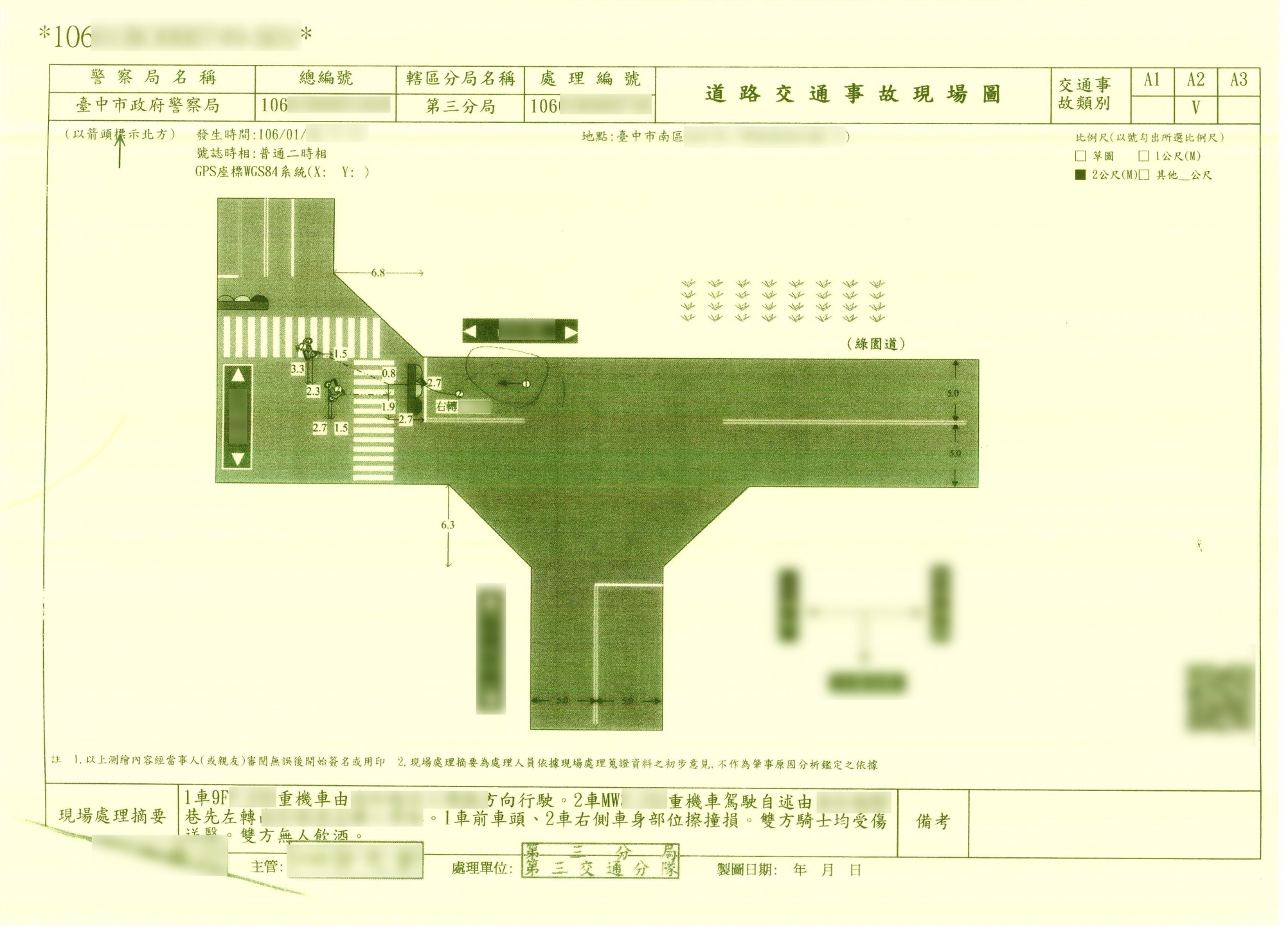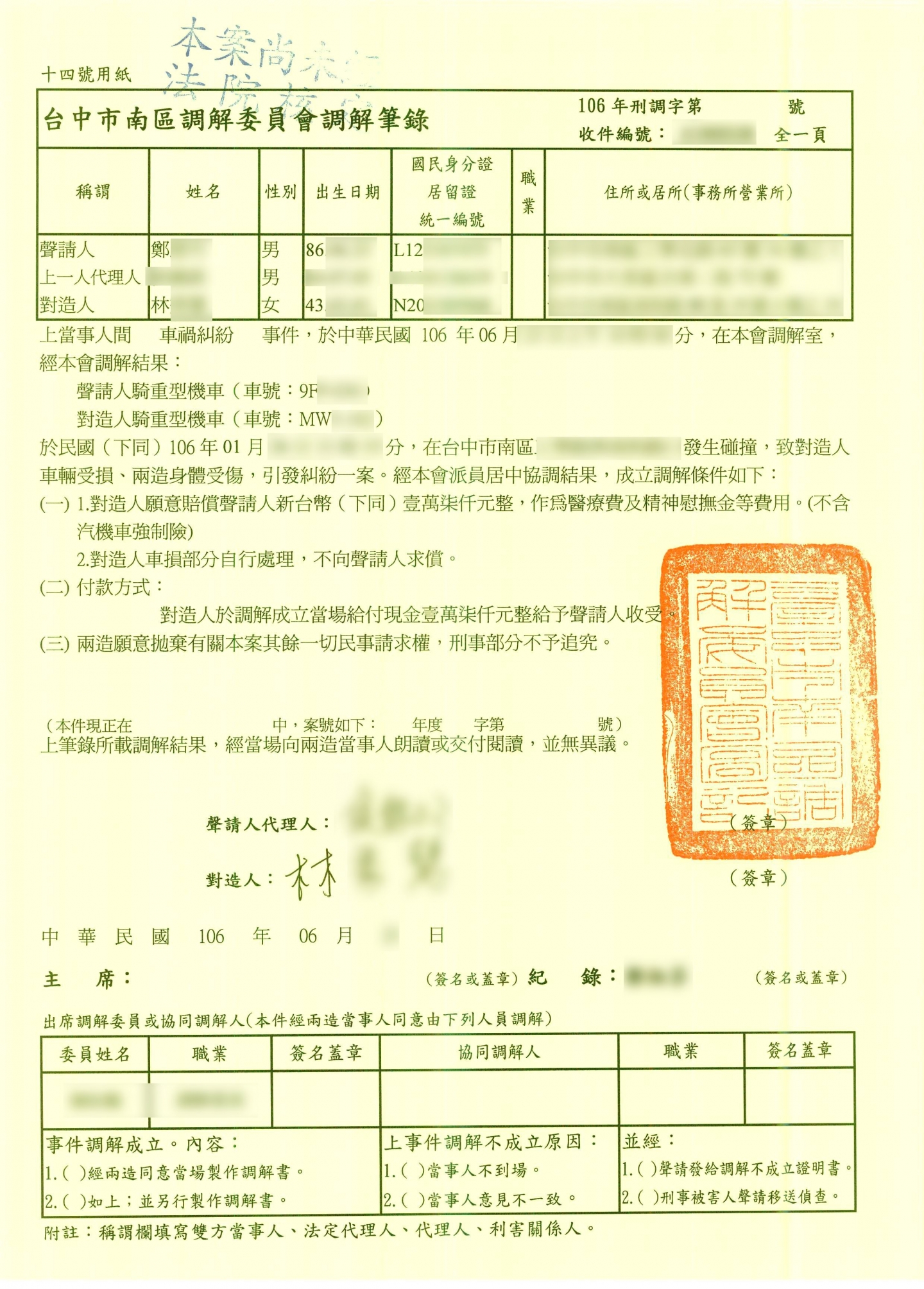 案件類型: 車禍案件。 發生時地: 106年1月 台中市南區。 面談過程: 鄭先生騎車行經台中市南區某路口,遭來自左方巷口之機車碰撞,造成鄭先生體傷及車損。鄭先生沒有車禍處理經驗,在談論案件過程中深感若有能夠信任的專業人士予以協助,事情處理起來會比較安心省事,且效果較佳,因此決定將此事件交由本公司處理。 委任關鍵: 我方當事人無車禍處理相關經驗。 處理結果: 協助當事人收集相關資料並申請賠償,我方當事人共計獲得補償金額17,000元。 案件資料: 現場圖 診斷書 和解書