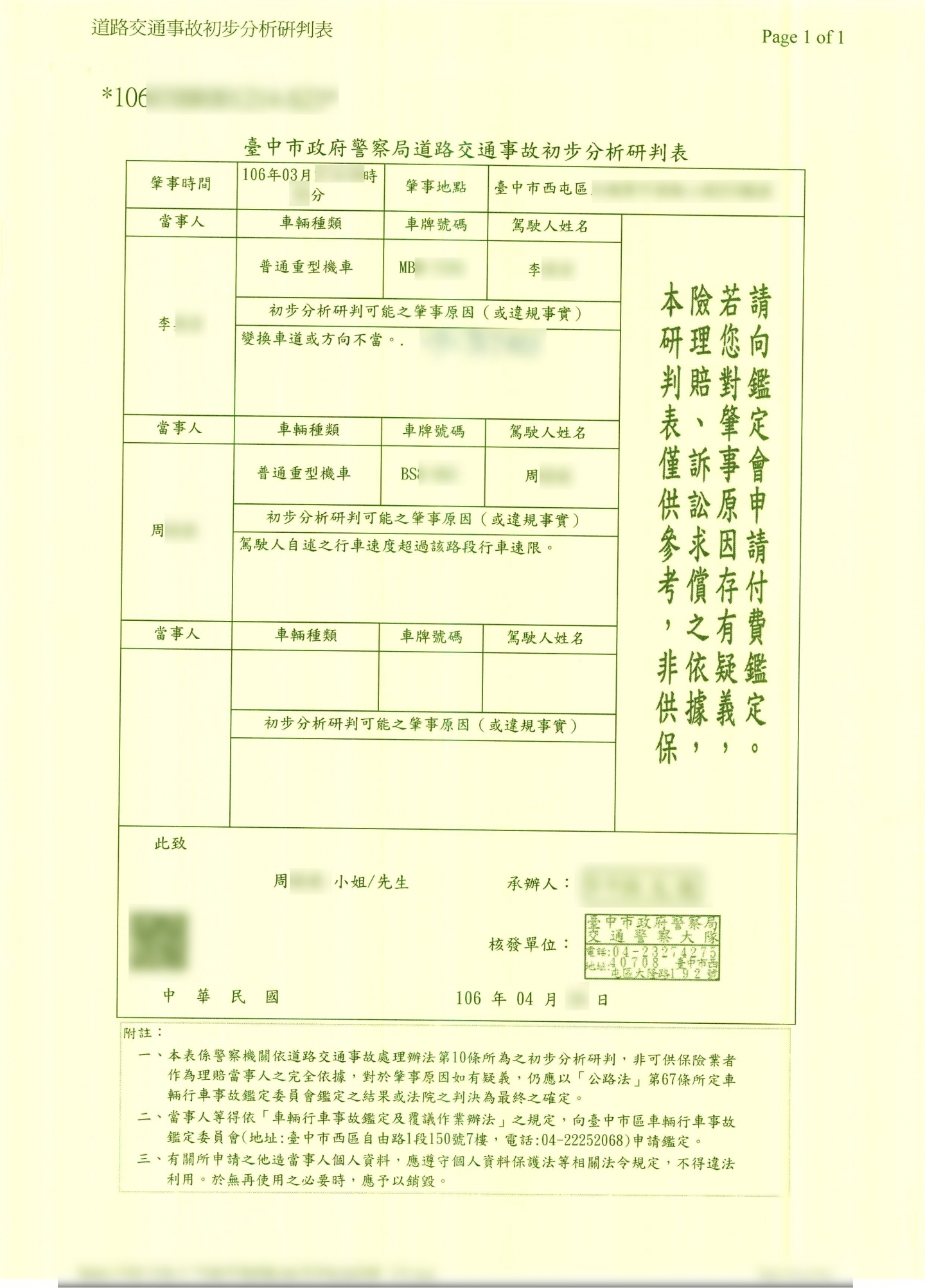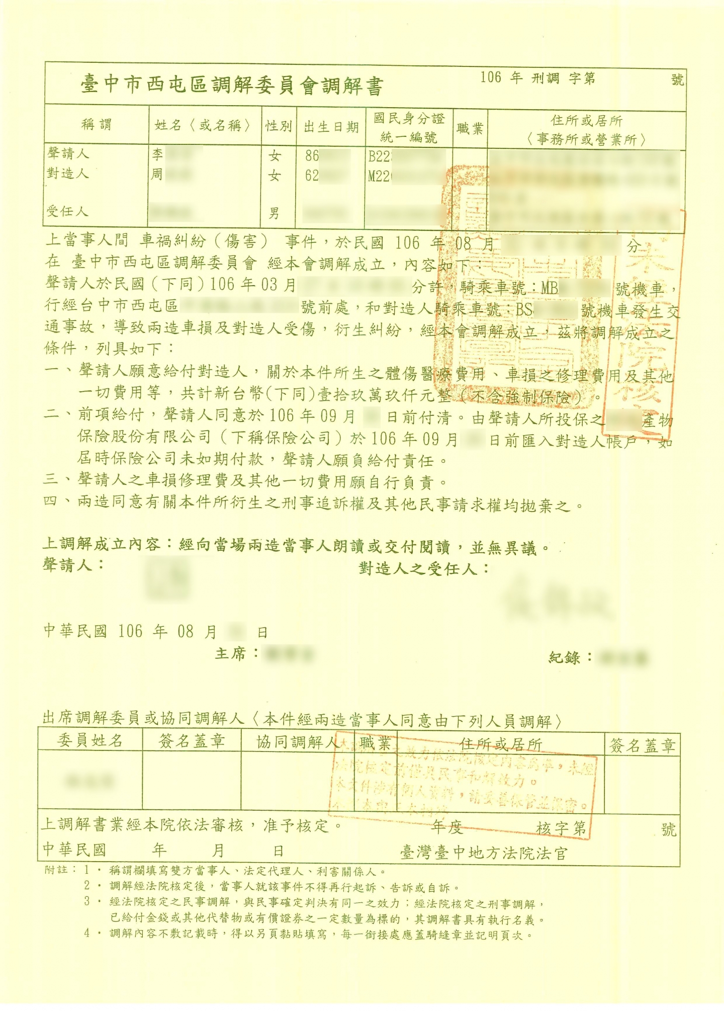 案件類型: 車禍案件。 發生時地: 106年3月 台中市西屯區。 面談過程: 周小姐騎車行經台中市西屯區某路口時,前方機車不明原因突然偏向,導致周小姐來不及閃避而撞上,使周小姐受有體傷及車損。周小姐沒有車禍處理經驗,在與本公司業務員談論案件過程中深感若有能夠信任的專業人士予以協助,事情處理起來會比較安心省事,效果亦佳,因此決定將此事件交由本公司處理。 委任關鍵: 我方當事人無車禍處理相關經驗。 處理結果: 協助當事人收集相關資料並申請賠償,我方當事人共計獲得補償金額199,000元。 案件資料: 初判表 診斷書 和解書