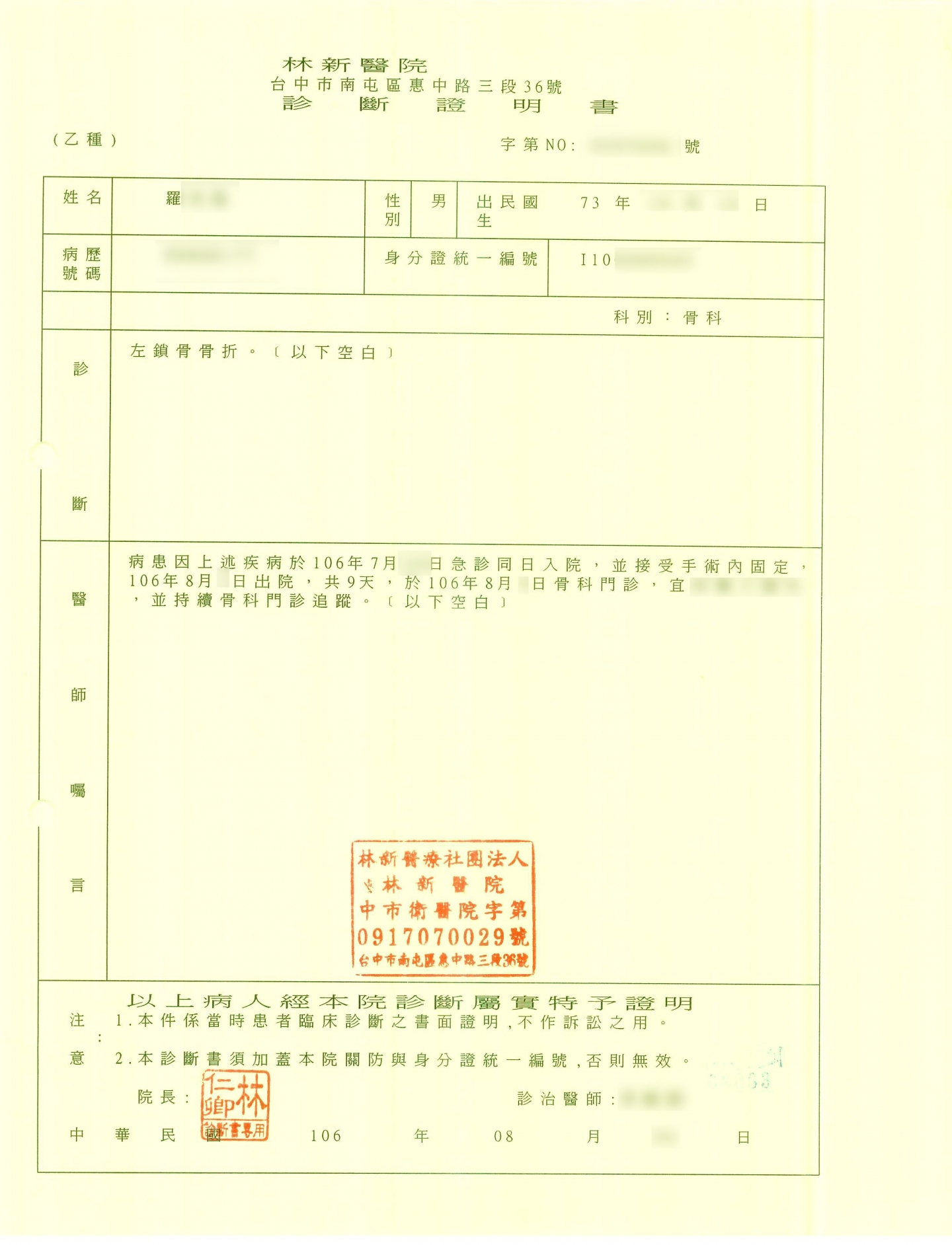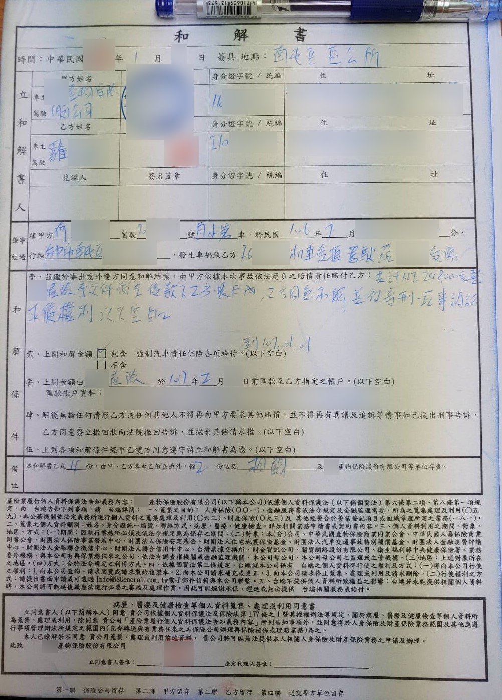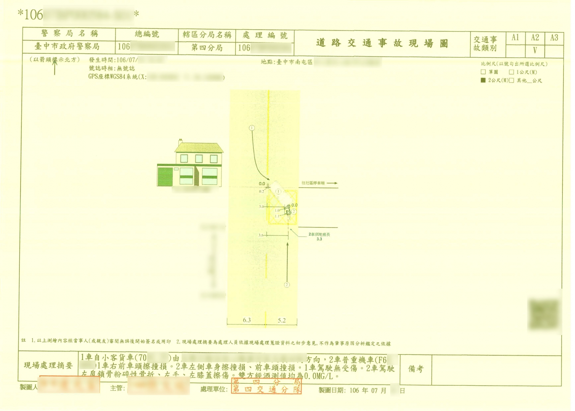 案件類型: 車禍案件。 發生時地: 106年7月 台中市南屯區。 面談過程: 羅先生在送貨途中行經台中市南屯區某社區門口,對向欲左轉進入社區地下停車場之自小客車未禮讓我方先行,碰撞造成羅先生體傷及車損。羅先生完全沒有車禍處理經驗,加上身體狀況需積極治療行動不便,難以分神於車禍處理。在談論案件過程中深感若有能夠信任的專業人士予以協助,事情處理起來會比較安心省事,且效果較佳,因此決定將此事件交由本公司處理。 委任關鍵: 我方當事人無車禍處理相關經驗,加上行動不便難以分神於車禍處理。 處理結果: 協助當事人收集相關資料並申請賠償,我方當事人共計獲得補償金額248,000元。 案件資料: 現場圖 診斷書 和解書