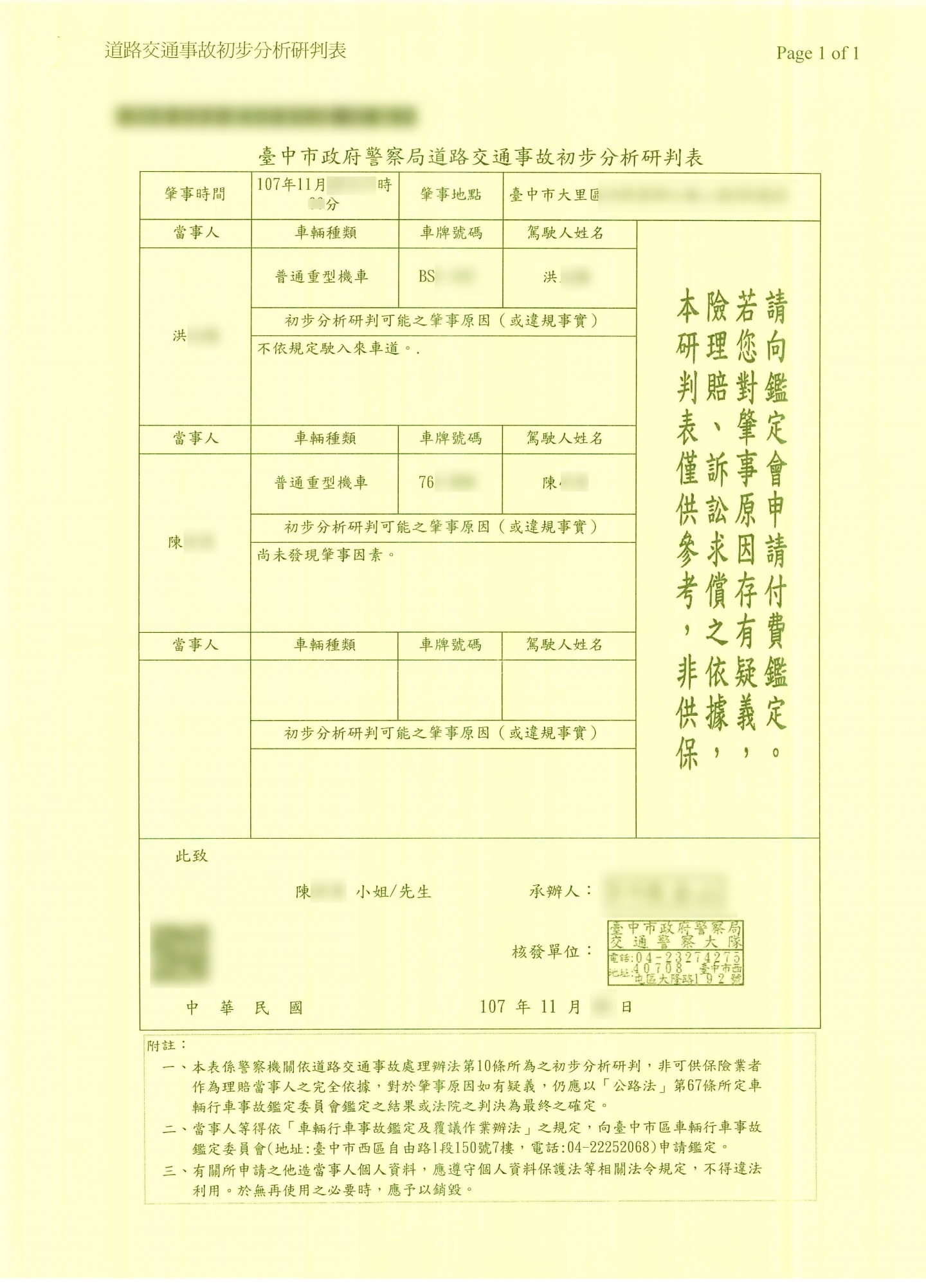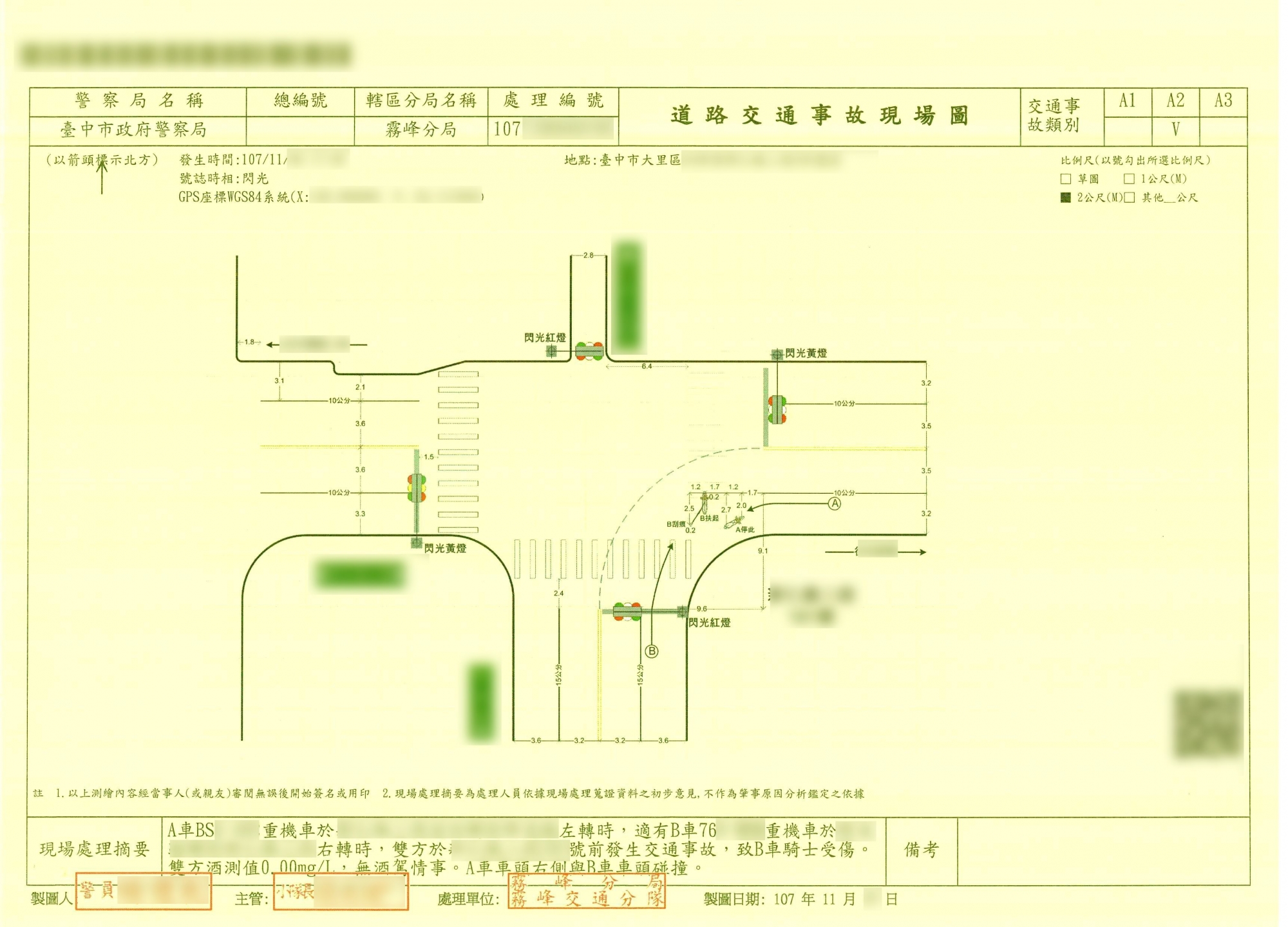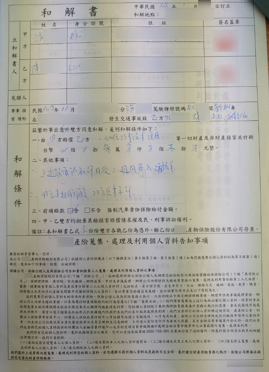 案件類型: 車禍案件。 發生時地: 107年11月 台中市大里區。 面談過程: 陳小姐騎機車於台中市大里區某路口右轉時,突有逆向機車迎面而來導致我方閃避不及發生碰撞,我方機車損壞且受有體傷。陳小姐之前已經有委託過本公司代為處理車禍,對本公司之服務相當滿意,因此此事故發生後便主動聯絡本公司將此事件交由本公司處理。 委任關鍵: 我方當事人曾委託本公司代為處理車禍事件,對服務相當滿意。 處理結果: 協助當事人收集相關資料並申請賠償,我方當事人獲得補償金額30,000元。 案件資料: 現場圖 初判表 和解書