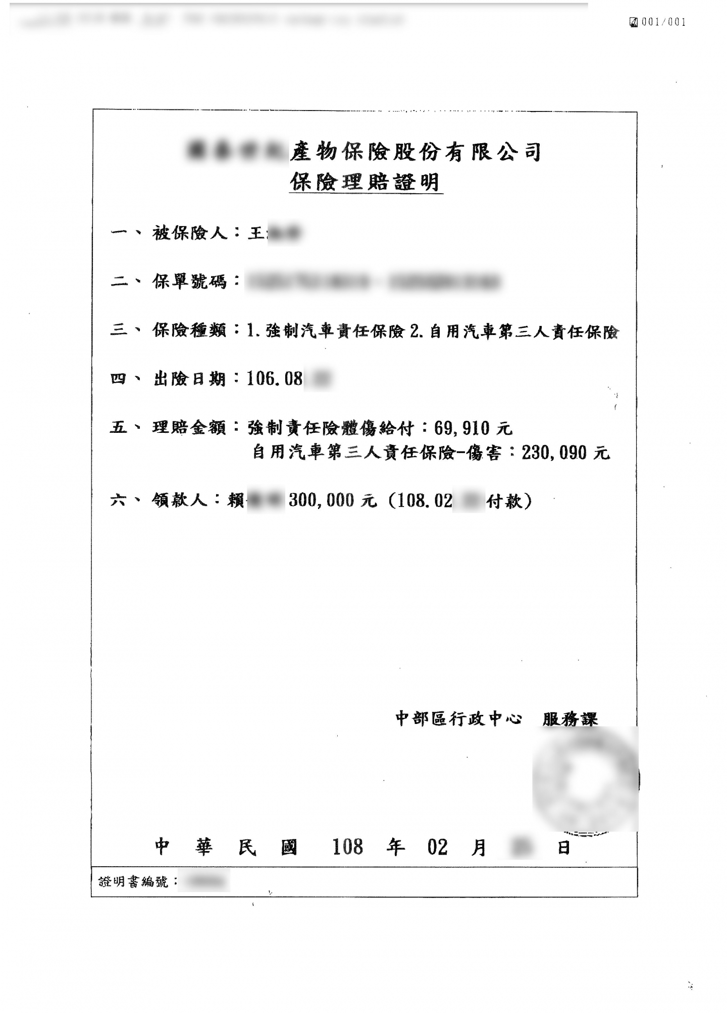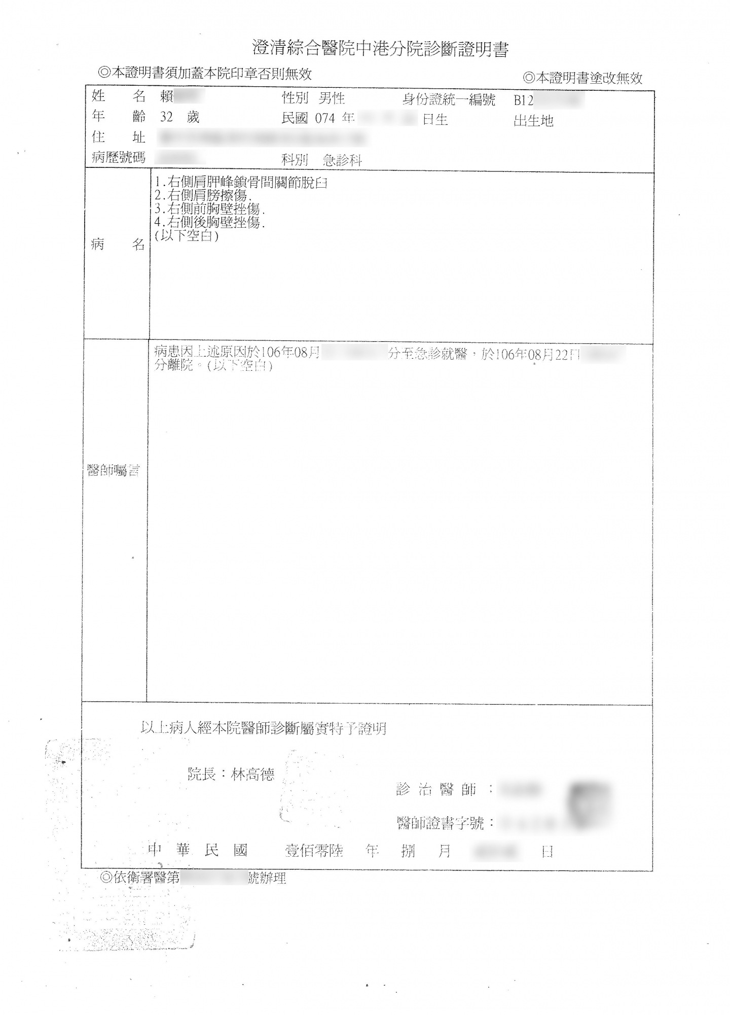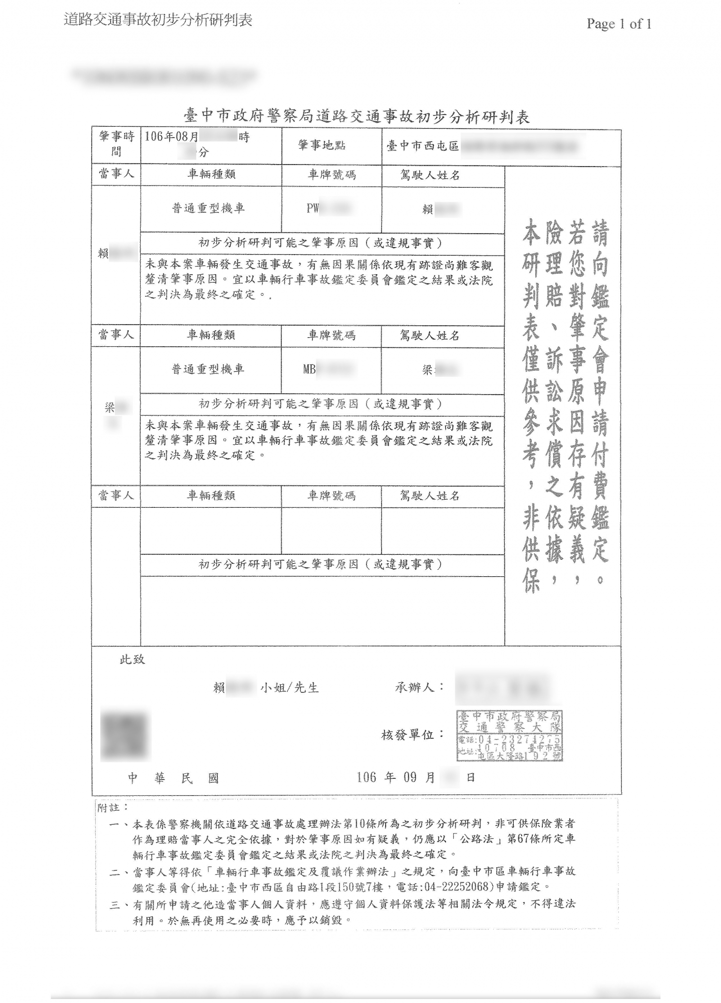 案件類型: 車禍案件。 發生時地: 106年8月 台中市西屯區。 面談過程: 賴先生騎車行經台中市西屯區某路口時,左前方之機車突然右切,我方駕駛反應不及摔車,造成賴先生體傷及車損。在與對方協調的過程中,對方堅持自己沒有向右偏行,是賴先生自己莫名其妙自摔,他聽到後方有摔車的聲音,才停靠路邊查看並協助,因此不願負擔任何賠償責任。賴先生跟對方接洽的過程,對方堅持不願負責,賴先生不知道如何繼續處理下去,因此決定將此事件交由本公司處理。 委任關鍵: 對方堅持自己沒有造成事故,是我方莫名其妙自摔,不願負責。 處理結果: 協助當事人收集相關資料並申請賠償,我方當事人共計獲得補償金額300,000元。 案件資料: 現場圖 初判表 診斷書 保險理賠證明