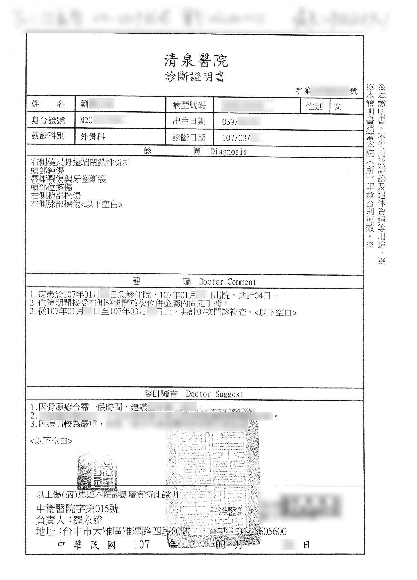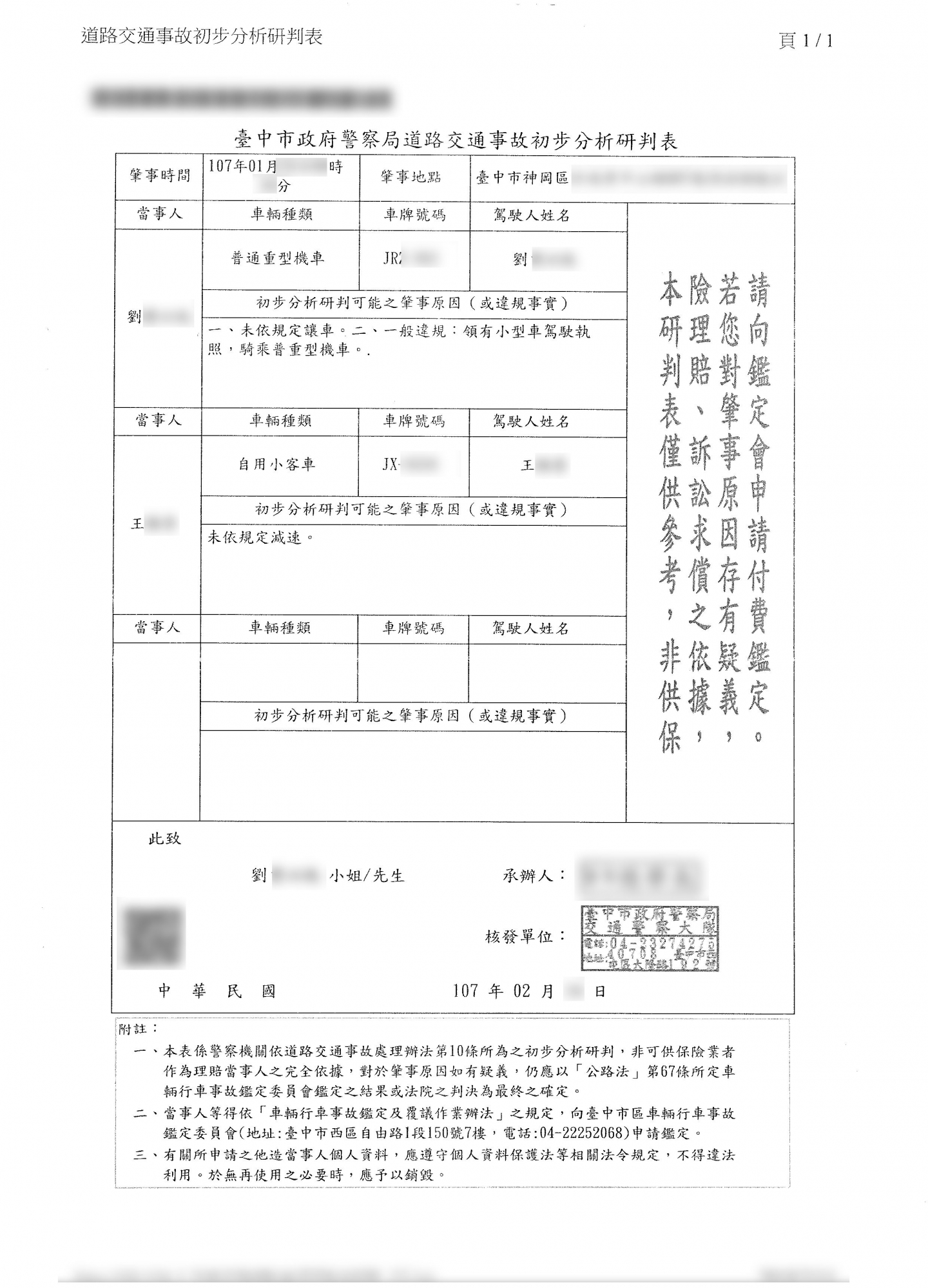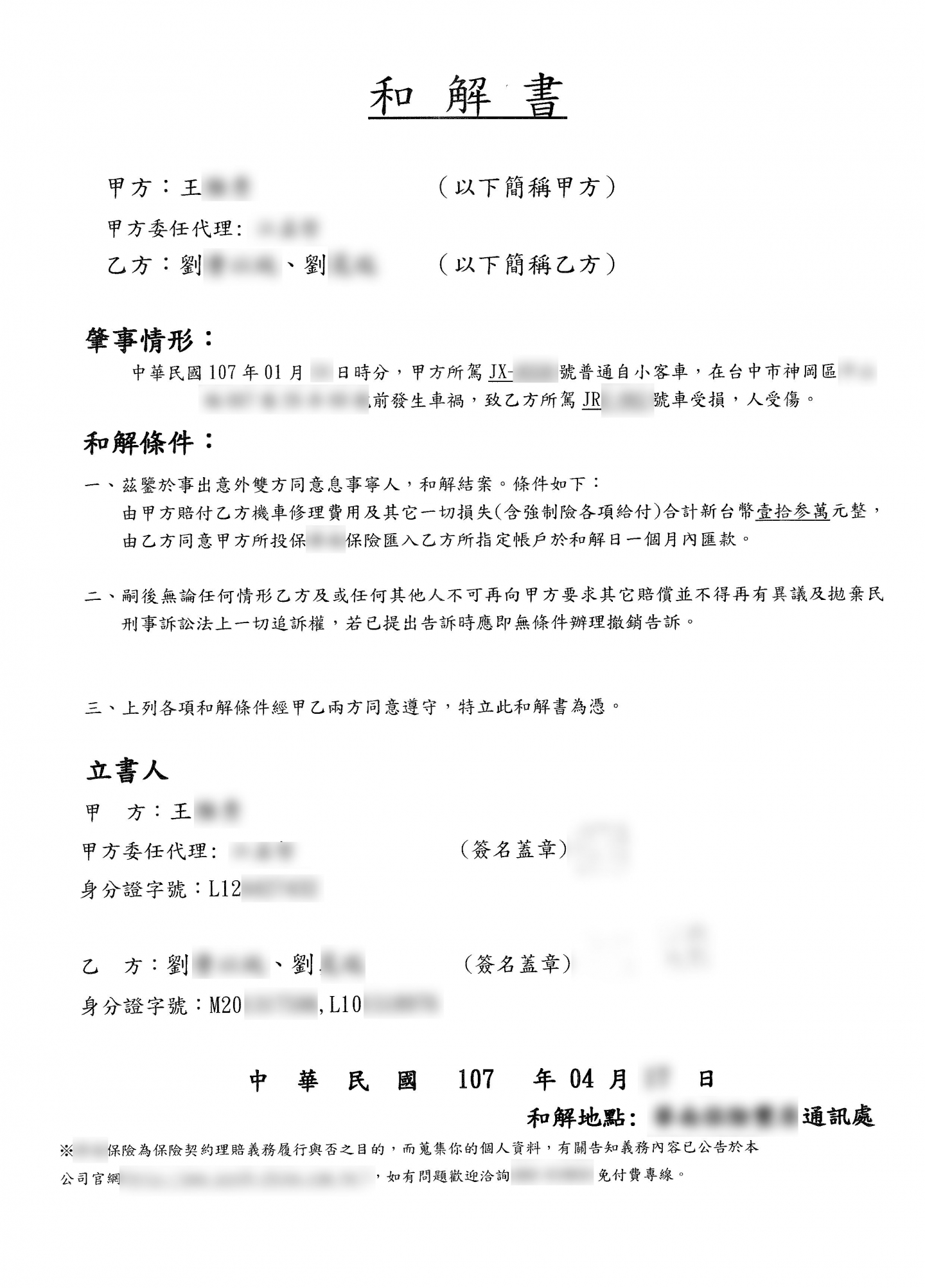 案件類型: 車禍案件。 發生時地: 107年1月 台中市神岡區。 面談過程: 劉曹女士騎車行經台中市神岡區某路口左轉時,未注意右方有小客車亦要直行,不慎發生碰撞造成劉曹女士體傷及車損。劉曹女士屬無照駕駛,不知如何向對造開口索賠,剛好其女兒認識本公司業務人員,因此決定將此事件交由本公司處理。 委任關鍵: 1.我方當事人無照駕駛,不知如何向對方開口索賠。 2.我方當事人女兒認識本公司業務人員,知道交給專業人員處理效果較佳。 處理結果: 協助當事人收集相關資料並申請賠償,我方當事人共計獲得補償金額130,000元。 案件資料: 現場圖 初判表 診斷書 和解書