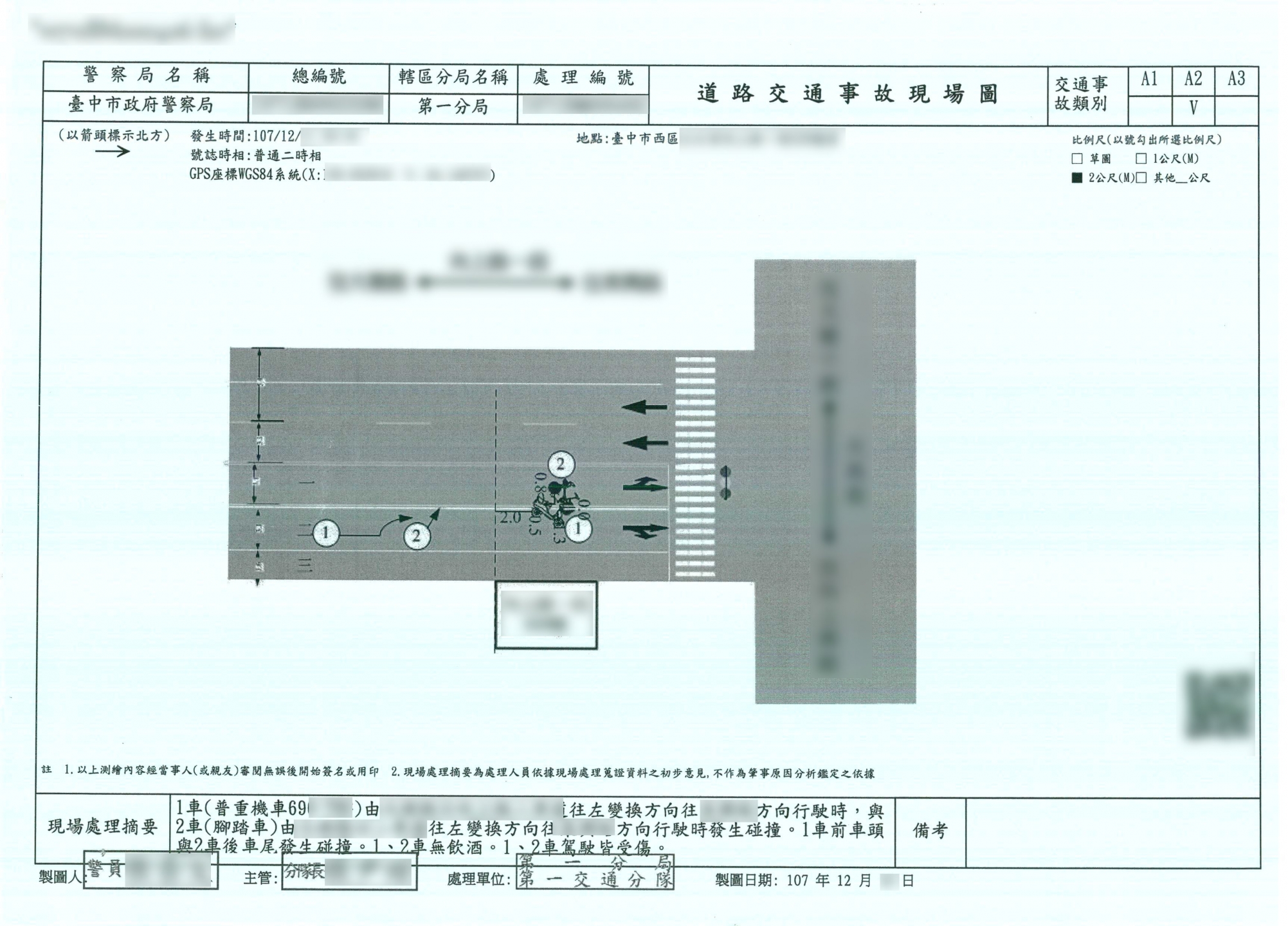 案件類型: 車禍案件。 發生時地: 107年12月 台中市西區。 面談過程: 周先生騎腳踏車行經台中市西區某路口欲左轉,遭來自後方同樣打算左轉的機車騎士撞上,造成體傷及車損。周先生完全沒有車禍處理經驗,在談論案件過程中深感若有能夠信任的專業人士予以協助,事情處理起來會比較安心省事,且效果較佳,因此決定將此事件交由本公司處理。 委任關鍵: 我方當事人無車禍處理相關經驗。 處理結果: 協助當事人收集相關資料並申請賠償,我方當事人共計獲得補償金額70,000元。 案件資料: 現場圖 初判表 診斷書 和解書