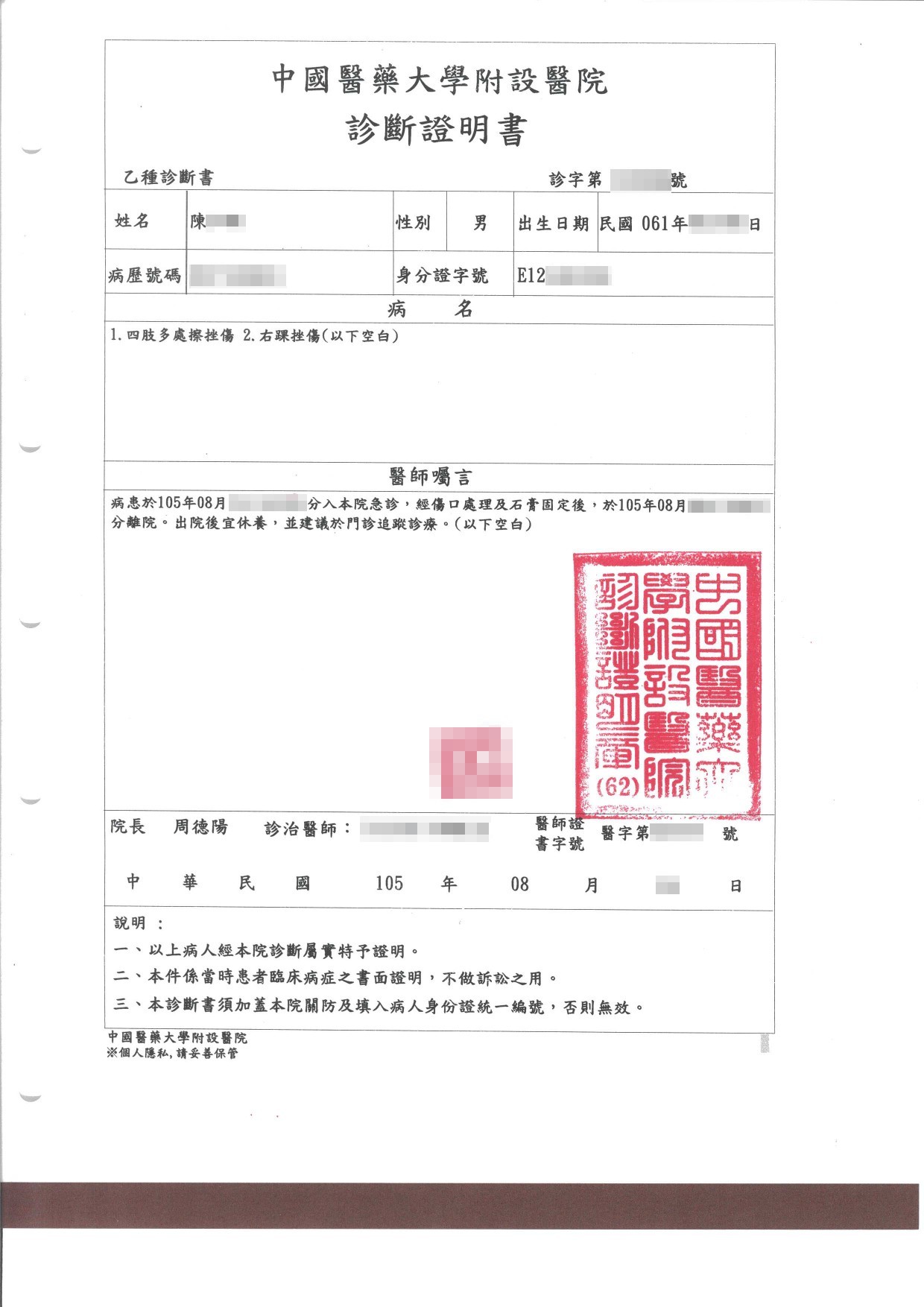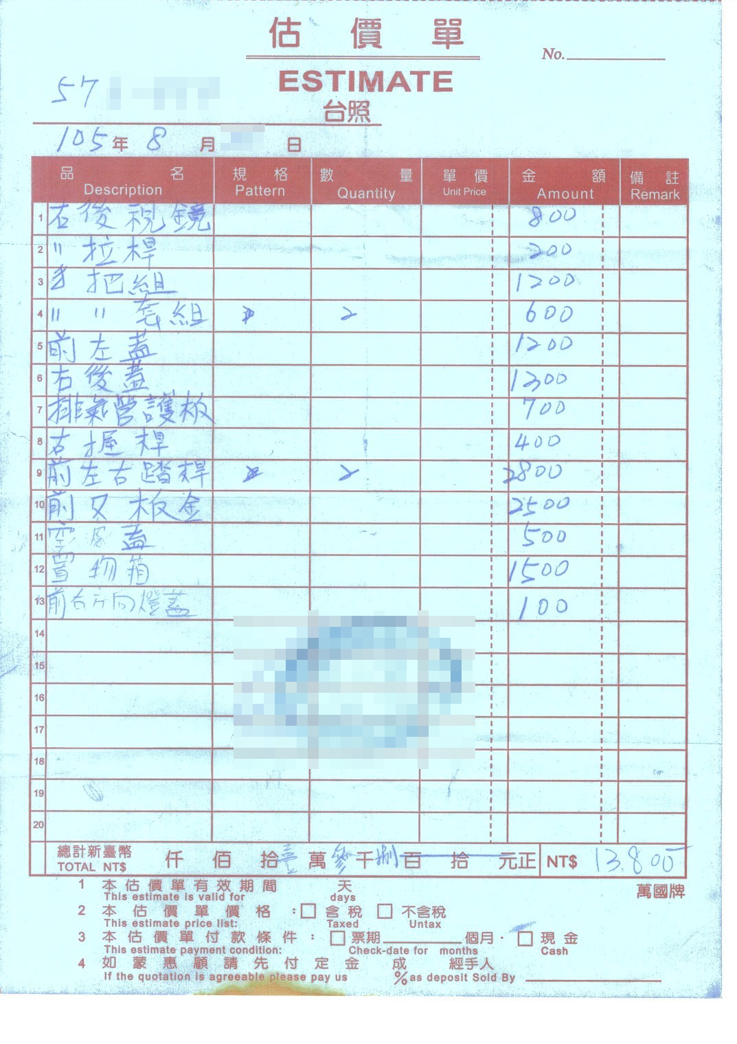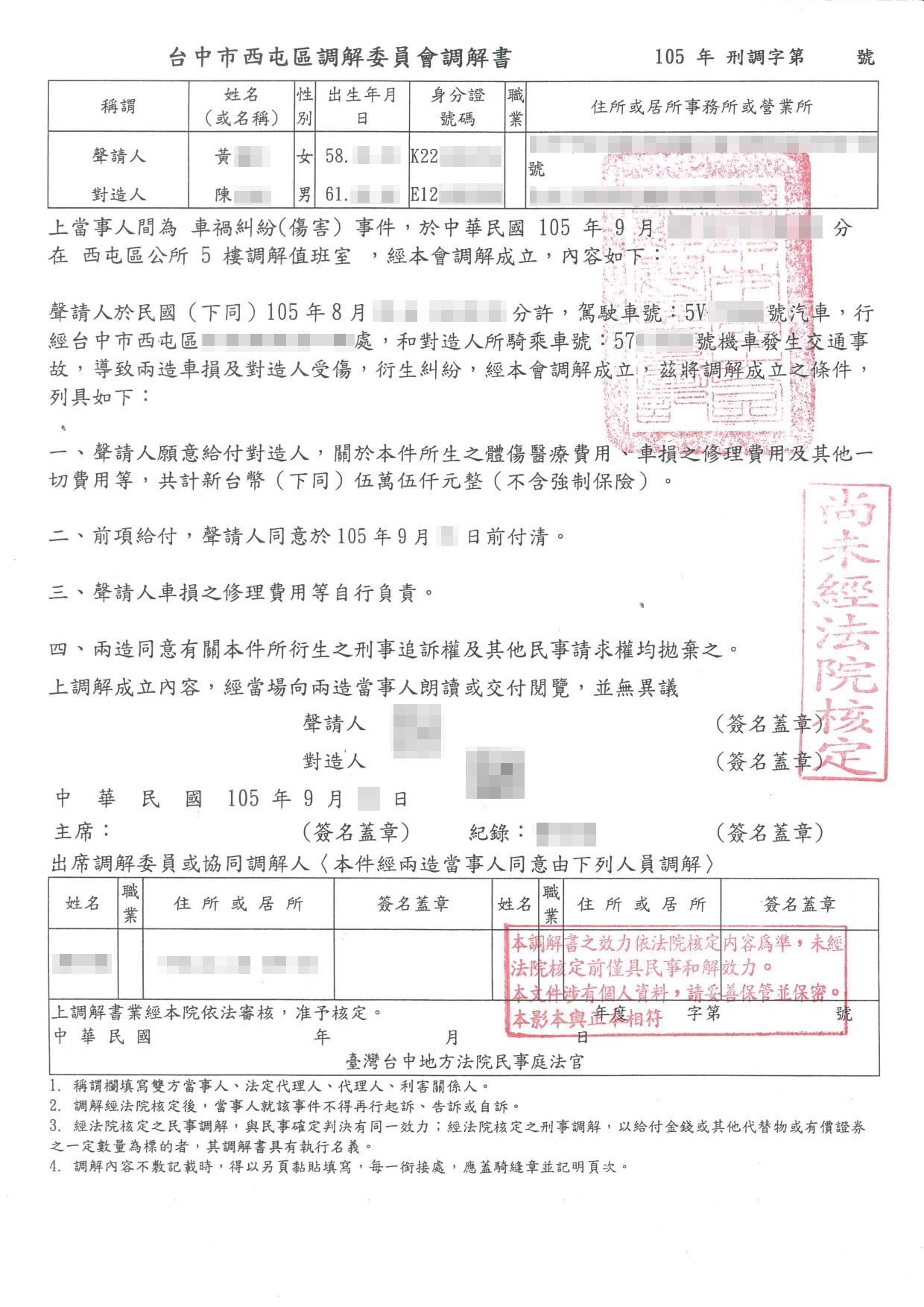 案件類型: 車禍案件。 發生時地: 105年8月 台中市西屯區。 面談過程: 陳先生騎機車上班行經台中市西屯區某路口時,與後方欲右轉的自小客車發生碰撞,陳先生受傷以及機車損毀。本公司業務人員開發案件時得知此案,向陳先生說明車禍發生後越早尋求專業人員協助,越容易獲得完整的補償,不僅可以省時免費心,效果也往往比自己處理好得多。陳先生後來幾經思考,認為自己要上班也沒有時間處理這件事,便決定將此案件委託本公司協助。 委任關鍵: 1.我方當事人沒有時間處理此事。 2.我方當事人了解車禍案件及早尋求專業協助的重要性。 處理結果: 協助當事人收集相關資料並商議如何爭取補償金,我方當事人總計獲得補償金額55,000元(未含強制險)。 案件資料: 初判表 診斷書 修車估價 和解書