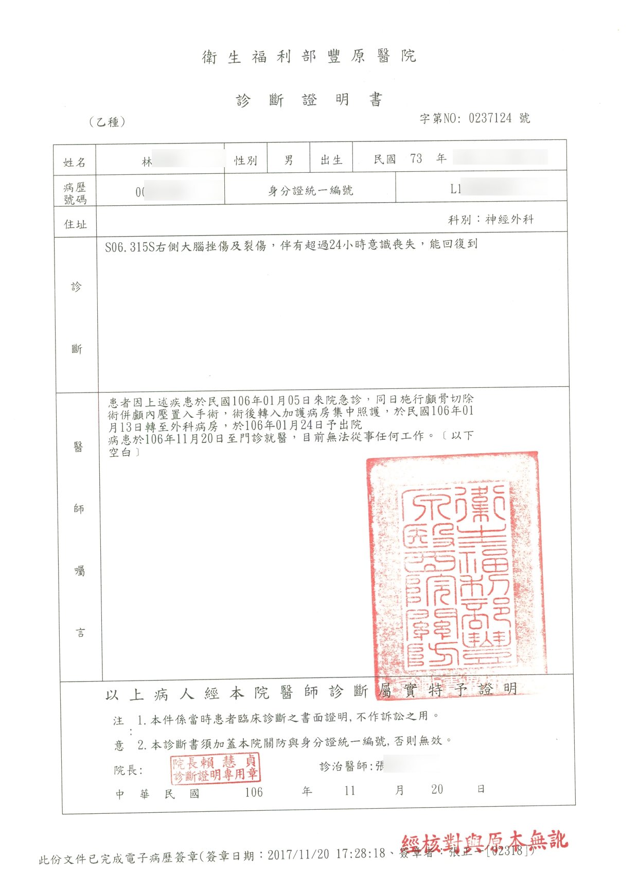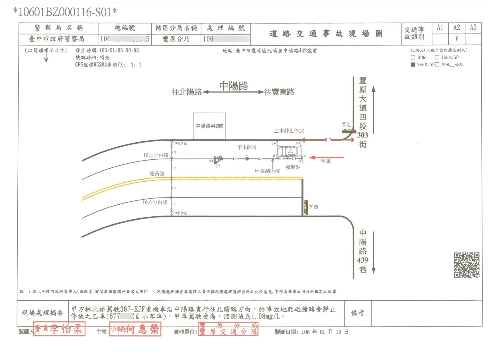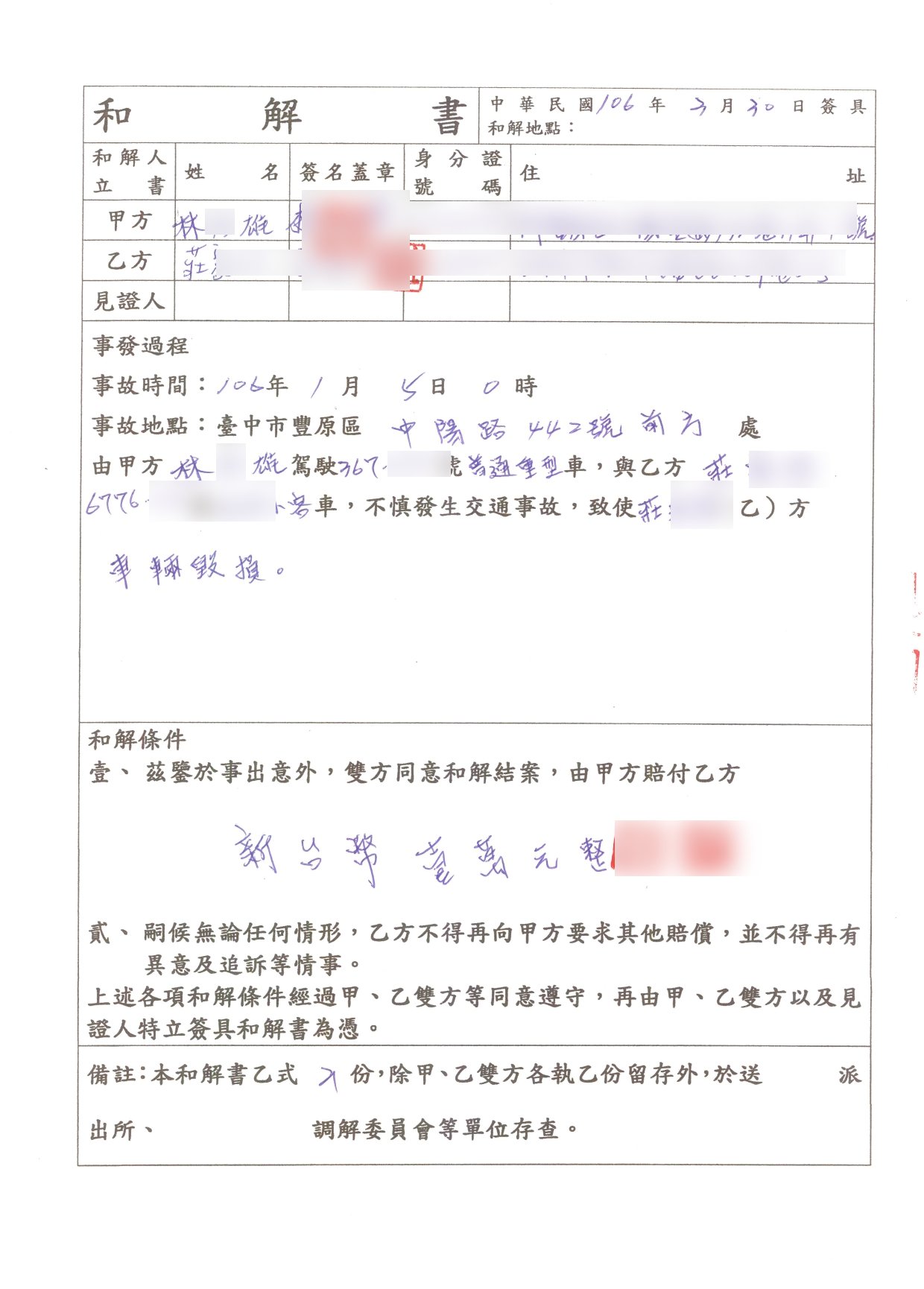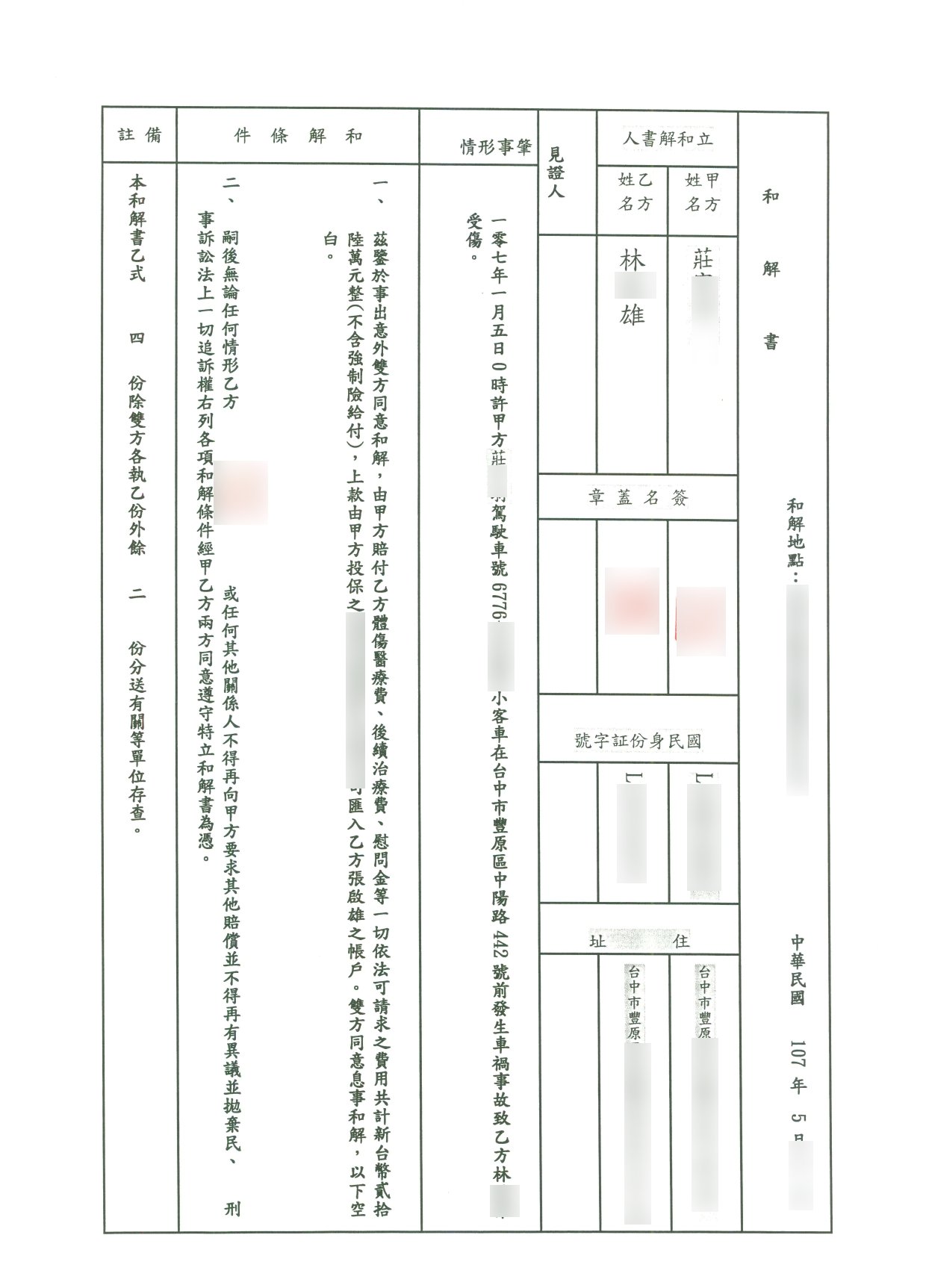 案件類型: 車禍案件。 發生時地: 106年1月 台中市豐原區。 面談過程: 林先生騎車行經台中市豐原區中陽路442號前,因酒駕未注意車前狀況與停放路旁車輛莊小姐((6776)發生碰撞,導致林先生右側大腦挫傷及裂傷。因林先生於住院期間認識本公司客戶賴先生,經賴先生介紹佑安得有機會於林先生見面洽談。 委任關鍵: 林先生知道自己酒駕(酒測值高達1.08mg/L),且係因自己未注意而導致車禍發生,因而賠償對造莊小姐修車費用1萬元整,也詢問莊小姐所承保之保險公司是否能夠理賠,保險公司回覆因為林先生有酒駕,所以無法賠償。經佑安瞭解本件事故並分析後,雖然酒駕並不可取,但是事故已發生當事人亦應有相當權利可爭取賠償。 處理結果: 協助當事人收集相關資料並申請賠償,我方當事人共計獲得賠償金額260,000元(不含強制險)。 案件資料: 現場圖︰ 診斷證明書︰ 賠償對造莊小姐和解書︰ 保險公司同意賠償和解書︰