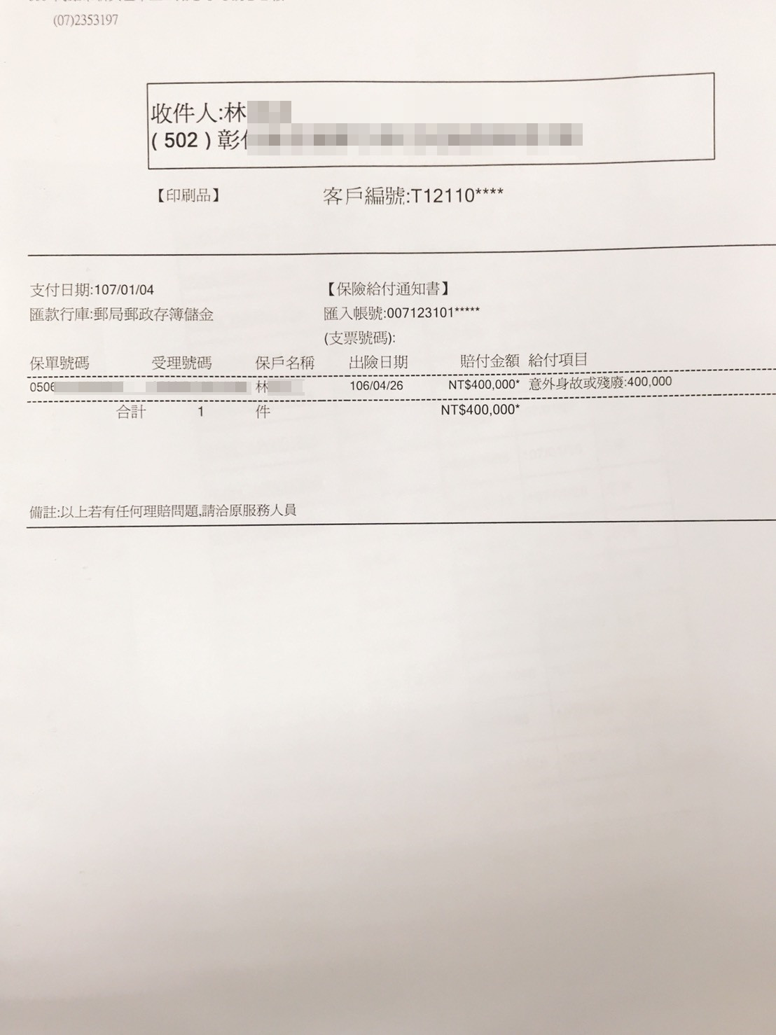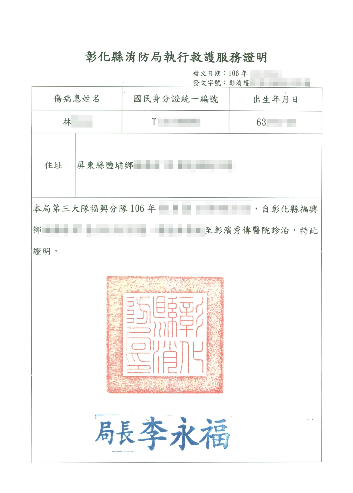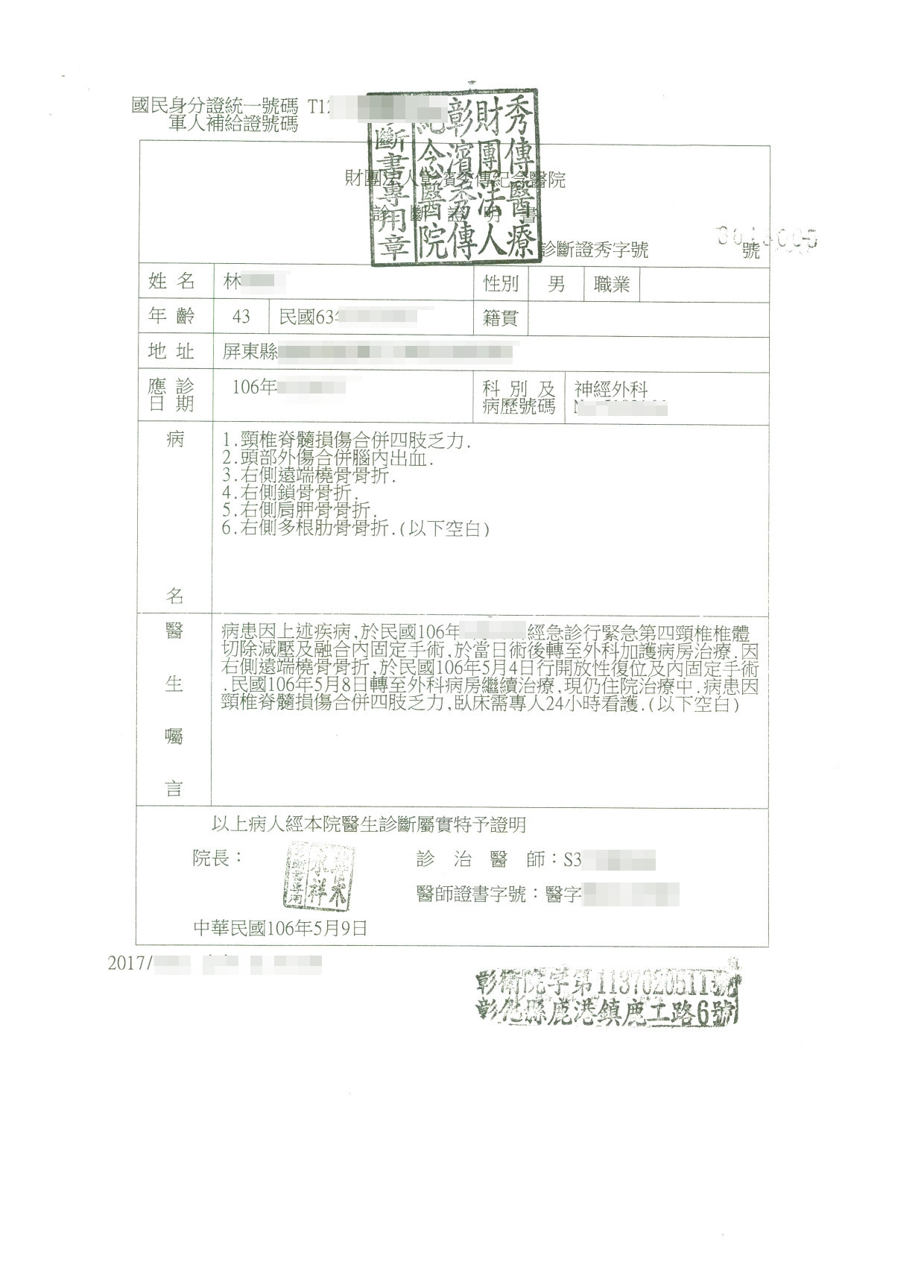 案件類型: 職業災害案件。 發生時地: 106年4月 彰化縣。 面談過程: 委託人林先生在工地執行職務時,因踩空從高處墜落至地面,受有頸椎脊髓損傷合併四肢乏力及多處骨折等傷害。於住院期間多次請雇主及營造公司先給付醫療費用與工資以便維持生活開銷,遭到雇主與營造公司互相推拖。林先生一方面要治療受傷後所帶來的後遺症,一方面又要處理雇主和營造公司之間不願面對補償及賠償問題,經佑安與林先生洽談,希望林先生能夠將複雜的問題交由我們來解決,林先生思考後決定交給佑安處理。 委任關鍵: 雇主沒有依法為勞工林先生投保勞工保險,至林先生遭逢職業災害無法申請勞保傷病給付來維持生活,而雇主亦無解決事情的態度,林先生實屬無奈,僅能維護自身權益。 處理結果: 協助我方當事人收集相關資料並計算合理賠償金額,我方當事人獲得職安署補償失能給付46萬2,198元,保險理賠40萬元整以解燃眉之急。 案件資料: 工地照片︰(這樣的防護措施很難保護勞工) 執行救護證明 診斷書 通報勞動檢查︰事業單未依規定通報,那就由我們來代勞吧。 職業災害檢查報告表 職安署給付公文 理賠通知單