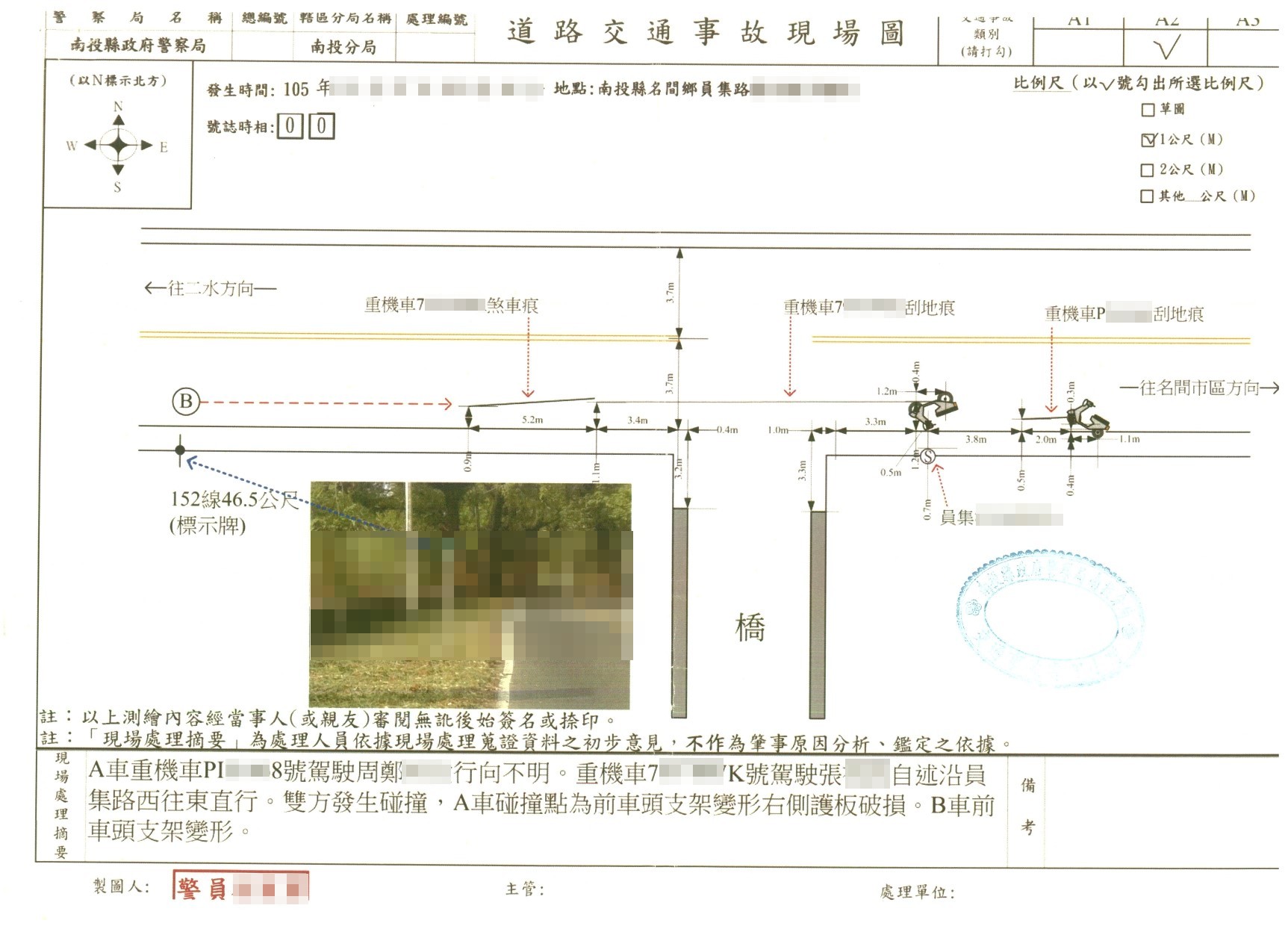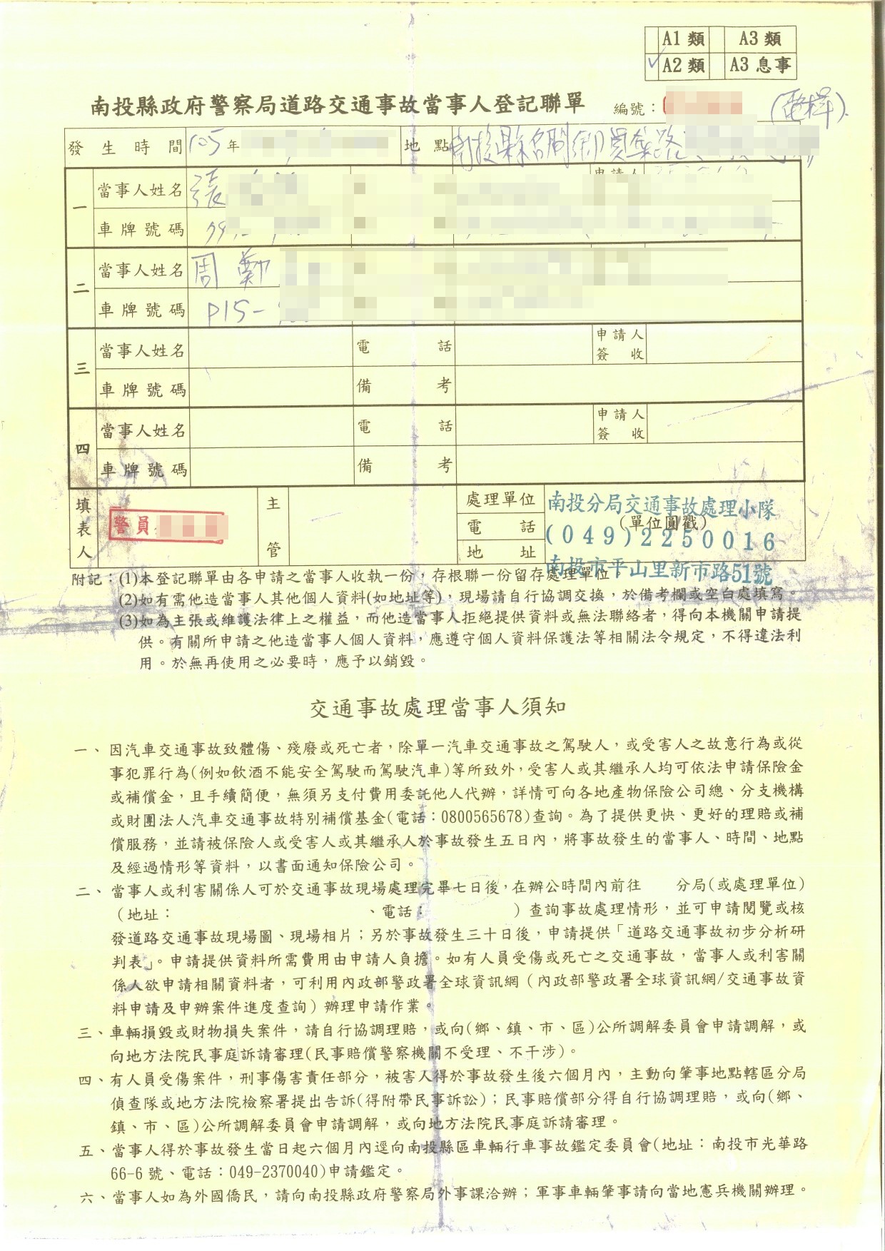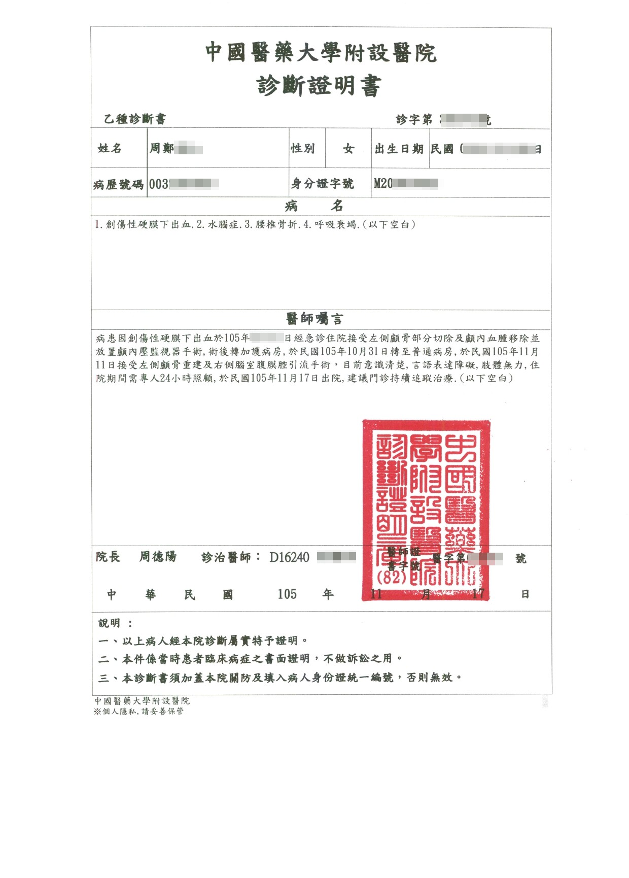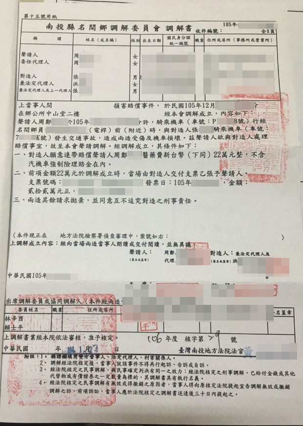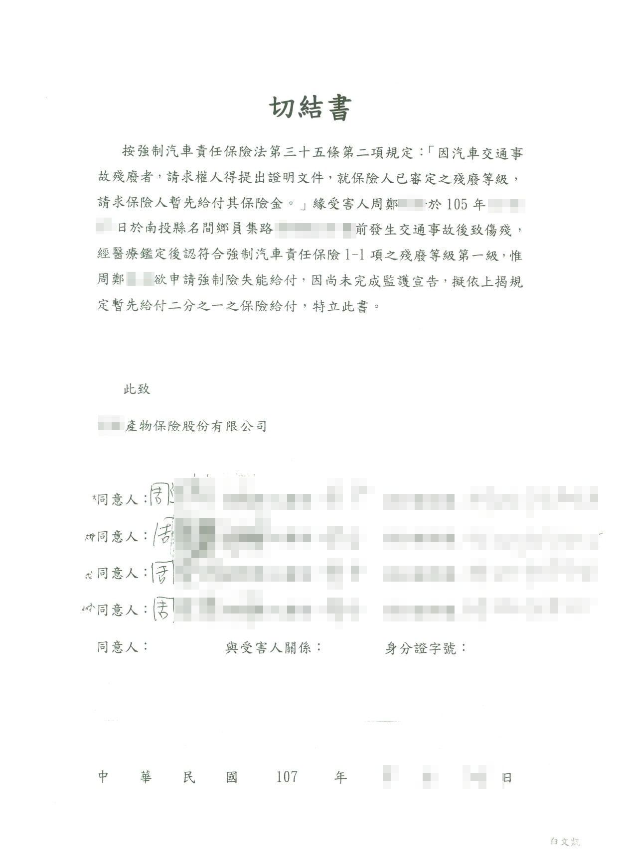 案件類型: 車禍案件。 發生時地: 105年10月 南投縣名間鄉。 事情經過: 周鄭OO女士騎車行經南投縣名間鄉員集路與對造駕駛重機車張先生發生碰撞,導致周鄭OO女士創傷性硬腦膜下出血、水腦症、腰椎骨折、呼吸衰竭等重傷。嗣後於民國105年12月與對造人張先生達成和解,和解金額22萬元整。經吳先生介紹佑安得有機會與周鄭OO女士家屬見面洽談,從而瞭解為何受傷那麼嚴重卻僅以22萬元和解,原來最主要的原因是對造無照又沒有錢可以賠償,所以認為能拿多少就算多少吧! 委任關鍵: 周鄭OO女士家屬認為已經和解,強制險亦已申請完成,因為要照顧媽媽也無暇再去處理相關事務,故委託佑安協助處理。 處理結果: 協助當事人收集相關資料並申請,我方當事人共計獲得賠償金額2,000,000元。 案件資料: 交通事故登記聯單︰ 現場圖︰ 診斷證明書︰ 和解書︰ 切結書︰(暫行給付2分之1,待完成監護宣告再給付餘2分之1) 匯款證明︰