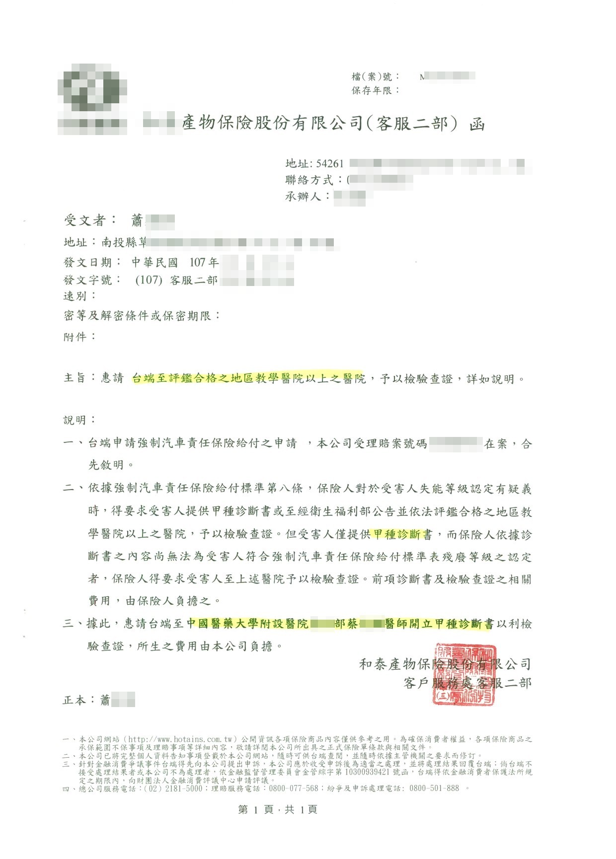 案件類型: 強制險失能給付案件。 發生時地: 104年12月 南投縣埔里鄉。 事情經過: 蕭先生於送貨途中發生交通事故,經醫師診斷為右距骨骨折合併缺血性壞死、踝關節攣縮等情形,經治療後蕭先生向產物保險公司申請強制險理賠,詎料,保險公司以為蕭先生有詐領保險金之意圖而拒絕理賠,經蕭先生來電諮詢,本公司覺得顯然有誤會故請蕭先生委託佑安去處理。 委任關鍵: 當事人對於關節活動角度不熟悉,無法理解保險公司為何拒絕理賠,且踝關節確實有活動受限之情形,故委託佑安協助處理。 處理結果: 協助當事人收集相關資料並申請,我方當事人共計獲得賠償金額270,000元。 心得︰ 真的假不了,假的也真不了,以正當合法的方式來為當事人爭取權益,絕不走旁門左道,要走旁門左道的客戶也不要來找佑安。 案件資料: 保險公司拒絕給付函︰ 診斷證明書︰保險公司以診斷書內容踝關節角度可活動度為55-75,依醫理及臨經驗判斷,關節活動度不至於短時間內產生變化。 保險公司要求出具教學醫院以上甲種診斷書公文(還指定科別及醫師) 中國附醫甲種診斷證明書