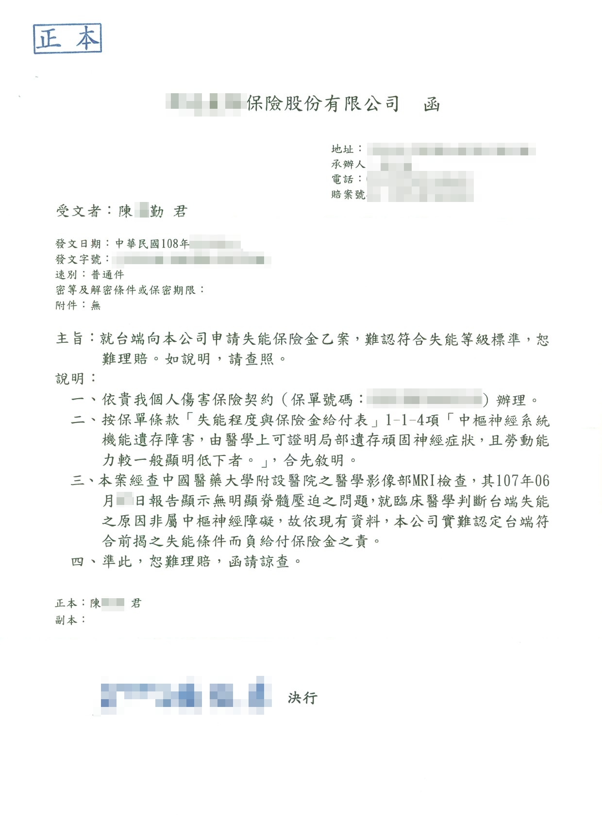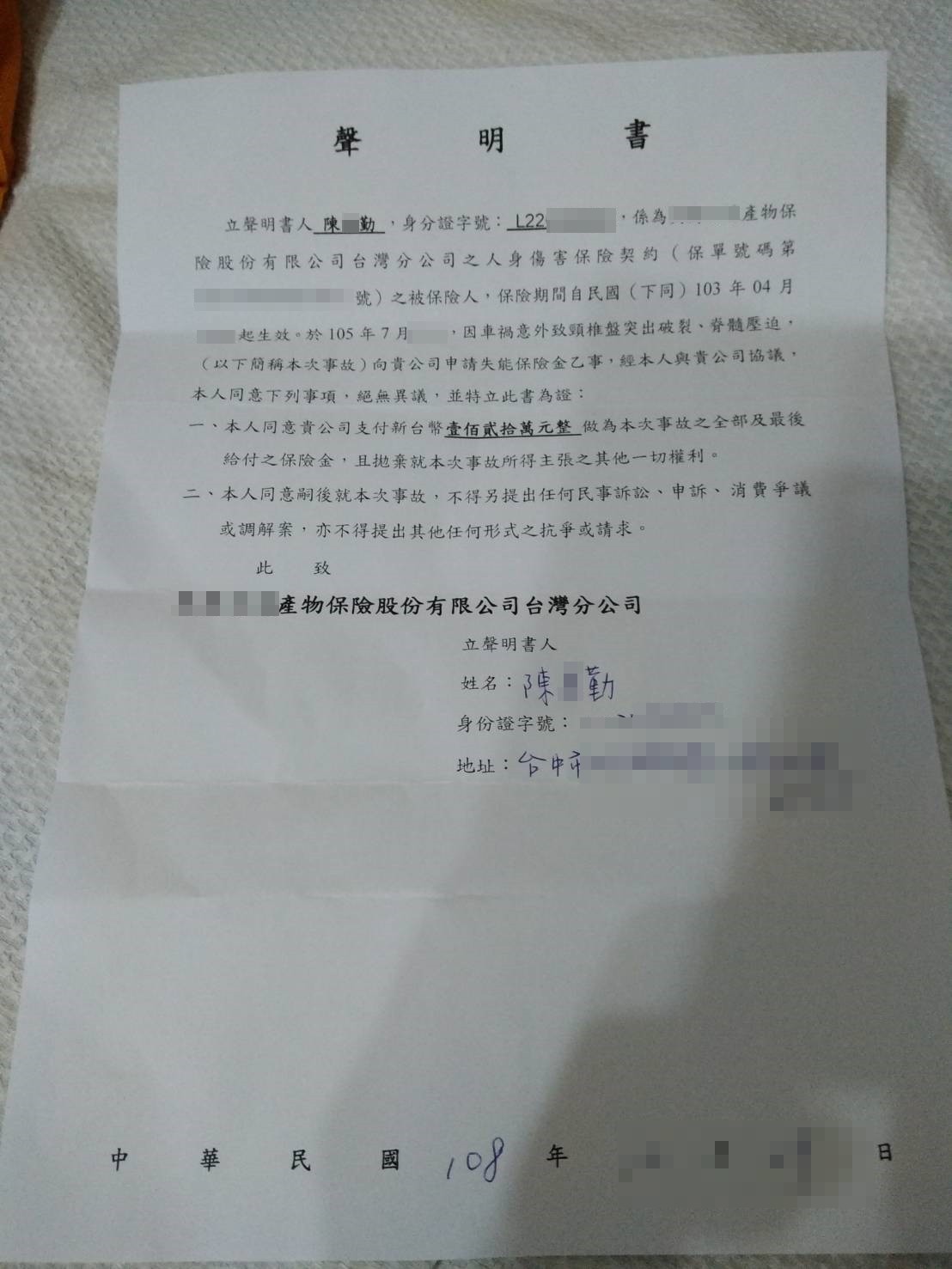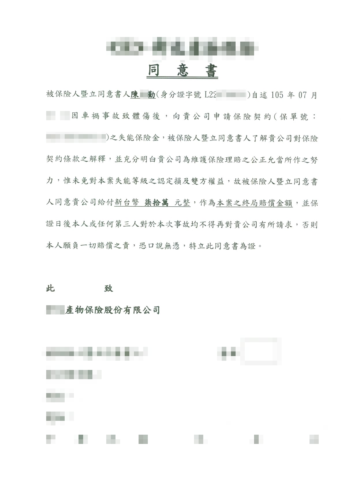 案件類型: 強制險、傷害險失能給付案件。 發生時地: 105年7月 台中市太平區。 事情經過: 陳小姐於上述日期騎乘腳踏車外出,行經台中市太平區光德路因對造人楊先生未保持安全間隔撞擊陳小姐,起初醫師診斷為橈骨閉鎖性骨折,後續又發現有腰椎外傷及頸椎外傷等情形,經治療後陳小姐向保險公司提起申請理賠,但是保險公司認為陳小姐不符合可以理賠的條件,因而發文給陳小姐拒絕理賠,經保險業務介紹陳小姐與佑安見面詳談,陳小姐決定委託佑安去處理。 委任關鍵: 保險公司拒絕理賠,故委託佑安協助處理。 處理結果: 收集當事人所有病歷,找出本件有利於陳小姐的資料,我方當事人共獲3間保險公司理賠,獲得賠償金額共計2,630,000元。 心得︰ 神經障礙導致失能,保險公司常以週邊神經非屬中樞神經來拒絕理賠。又常以聲明書、同意書等方式來免除保險公司的後續賠償責任,簽立前一定要三思.... 案件資料: 初步分析研判表︰我方無肇事因素 診斷證明書︰ 保險公司拒絕給付函︰ 同意書︰簽立同意書等於後續的賠償保險公司不再負責任,為避免後續糾紛,簽立前一定要多想想。