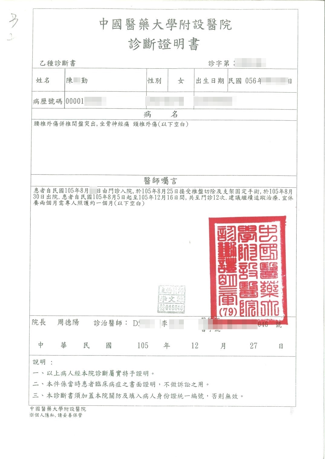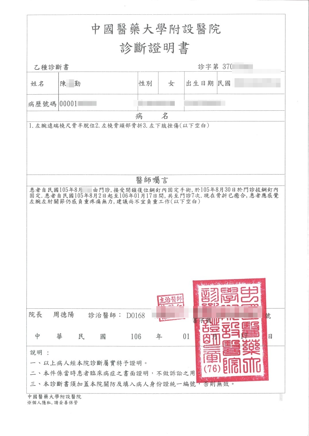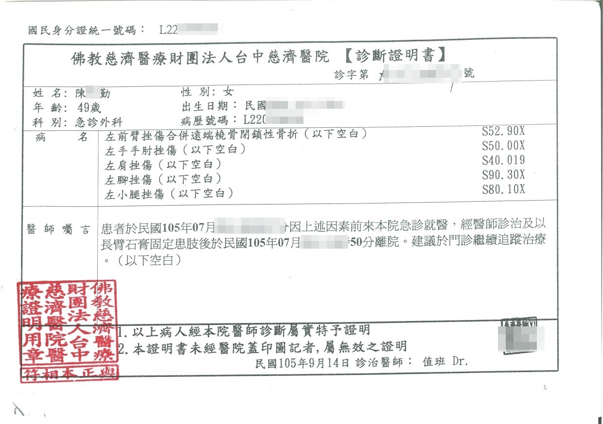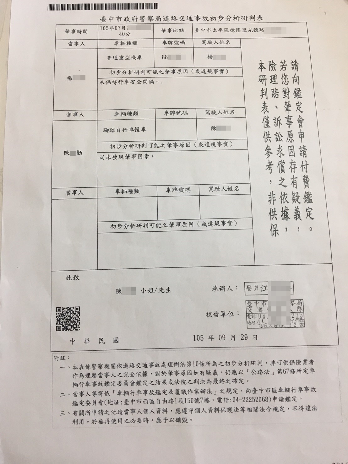 案件類型: 強制險、傷害險失能給付案件。 發生時地: 105年7月 台中市太平區。 事情經過: 陳小姐於上述日期騎乘腳踏車外出,行經台中市太平區光德路因對造人楊先生未保持安全間隔撞擊陳小姐,起初醫師診斷為橈骨閉鎖性骨折,後續又發現有腰椎外傷及頸椎外傷等情形,經治療後陳小姐向保險公司提起申請理賠,但是保險公司認為陳小姐不符合可以理賠的條件,因而發文給陳小姐拒絕理賠,經保險業務介紹陳小姐與佑安見面詳談,陳小姐決定委託佑安去處理。 委任關鍵: 保險公司拒絕理賠,故委託佑安協助處理。 處理結果: 收集當事人所有病歷,找出本件有利於陳小姐的資料,我方當事人共獲3間保險公司理賠,獲得賠償金額共計2,630,000元。 心得︰ 神經障礙導致失能,保險公司常以週邊神經非屬中樞神經來拒絕理賠。又常以聲明書、同意書等方式來免除保險公司的後續賠償責任,簽立前一定要三思.... 案件資料: 初步分析研判表︰我方無肇事因素 診斷證明書︰ 保險公司拒絕給付函︰ 同意書︰簽立同意書等於後續的賠償保險公司不再負責任,為避免後續糾紛,簽立前一定要多想想。