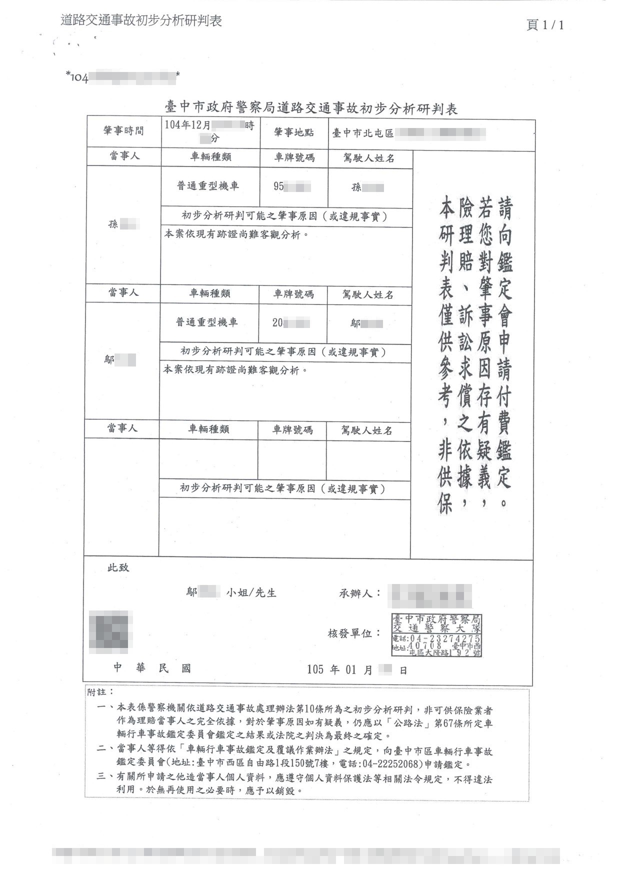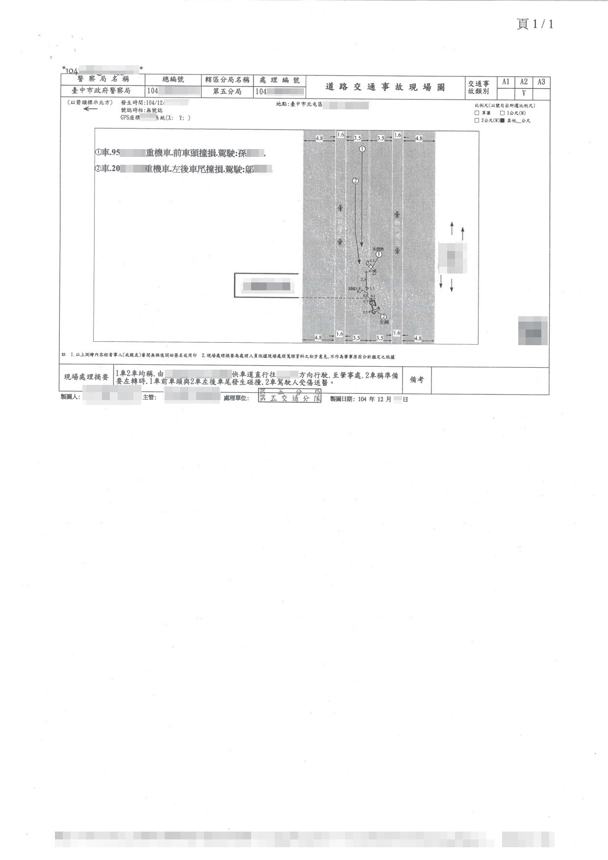 案件類型: 車禍案件。 發生時地: 104年12月 台中市北屯區。 面談過程: 鄔女士騎機車行駛於台中市北屯區道路上,左轉時未注意左後方來車,與左方直行騎士發生碰撞,雙方受傷以及機車損毀。本公司業務人員開發案件時得知此案,向鄔女士說明車禍發生後越早尋求專業人員協助,越容易獲得完整的補償,不僅可以省時免費心,效果也往往比自己處理好得多。鄔女士與子女幾經商量,認為自己不清楚處理車禍事故要注意哪些地方,也不知道該做些什麼努力才可以拿到合理補償不至於讓自己權益受損。加上此案鄔女士負擔之肇事責任比例較高,而且對方並無投保車險(連強制險都沒有),考慮種種因素造成求償不易,便決定將此案件委託本公司協助。 委任關鍵: 1.對方無投保任何車險(連強制險都沒有)。 2.我方肇事責任較高。 3.雙方屢次自行協調賠款金額,因對方無力負擔賠款,均無法達成共識。 處理結果: 協助當事人收集相關資料並商議如何爭取補償金,我方當事人總計獲得補償金額160,000元。 目前仍向特別補償基金申請其他理賠中。 案件資料: 現場圖 初判表 診斷書 和解書