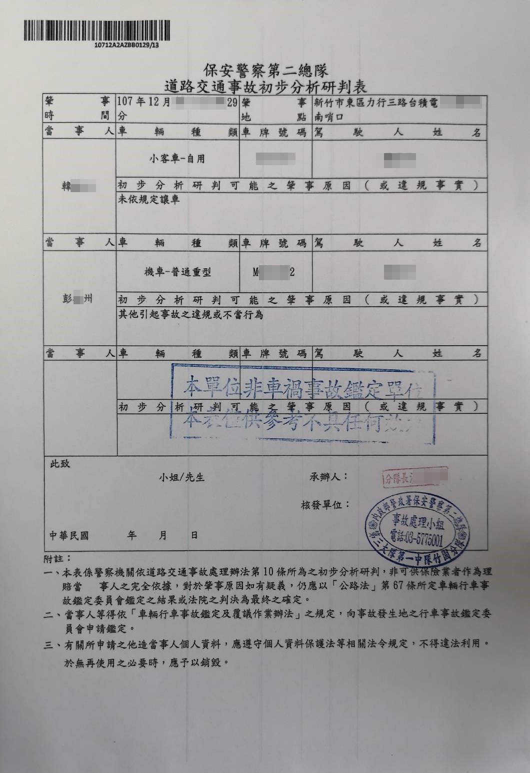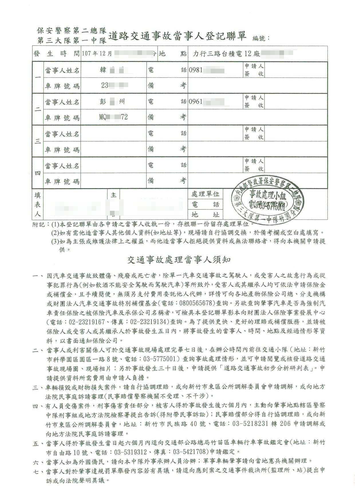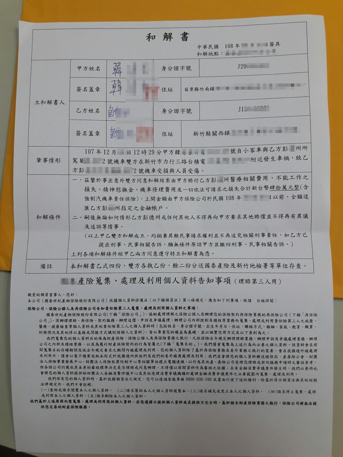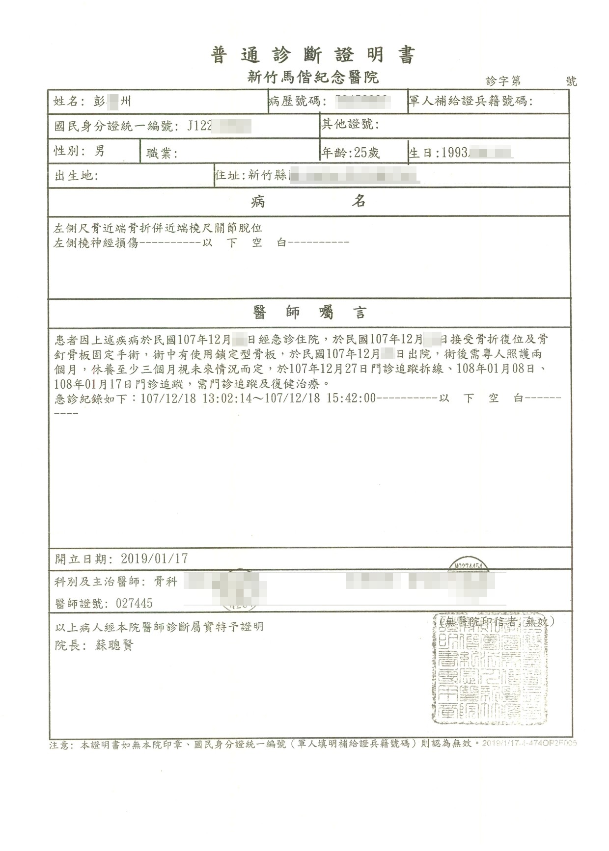案件類型: 車禍案件。 發生時地: 107年12月 新竹力行三路台積電12廠。 面談過程: 彭先生騎車行經新竹力行三路台積電12廠,因對造轉彎未理讓直行車致發生車禍,導致彭先生左尺骨骨折及橈神經受損,經佑安業務介紹詳談,希望佑安能夠為其爭取最大權益。 委任關鍵: 彭先生沒有處理車禍的相關經驗,希望透過佑安專業來解決紛爭。 處理結果: 協助當事人收集相關資料並申請賠償,我方當事人共計獲得賠償金額400,000元。 心得: 本件最重要的問題是當事人橈神經有受損,所以評估後續復原情況就很重要,儘早建議客戶積極復健,不要造成有後遺症,再多的錢都換不回健康的身體。 案件資料: 交通事故登記聯單︰ 初步分析研判表︰ 診斷證明書︰ 和解書︰