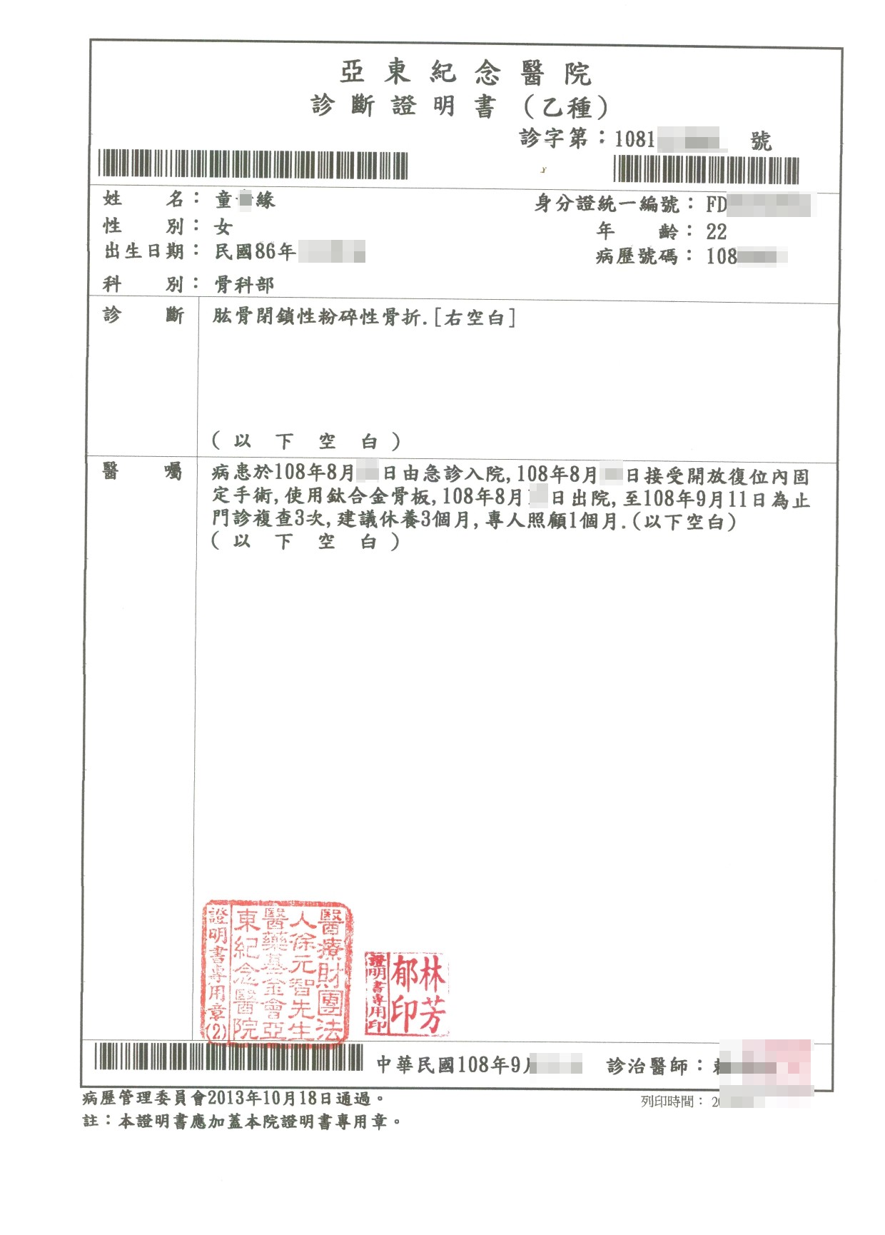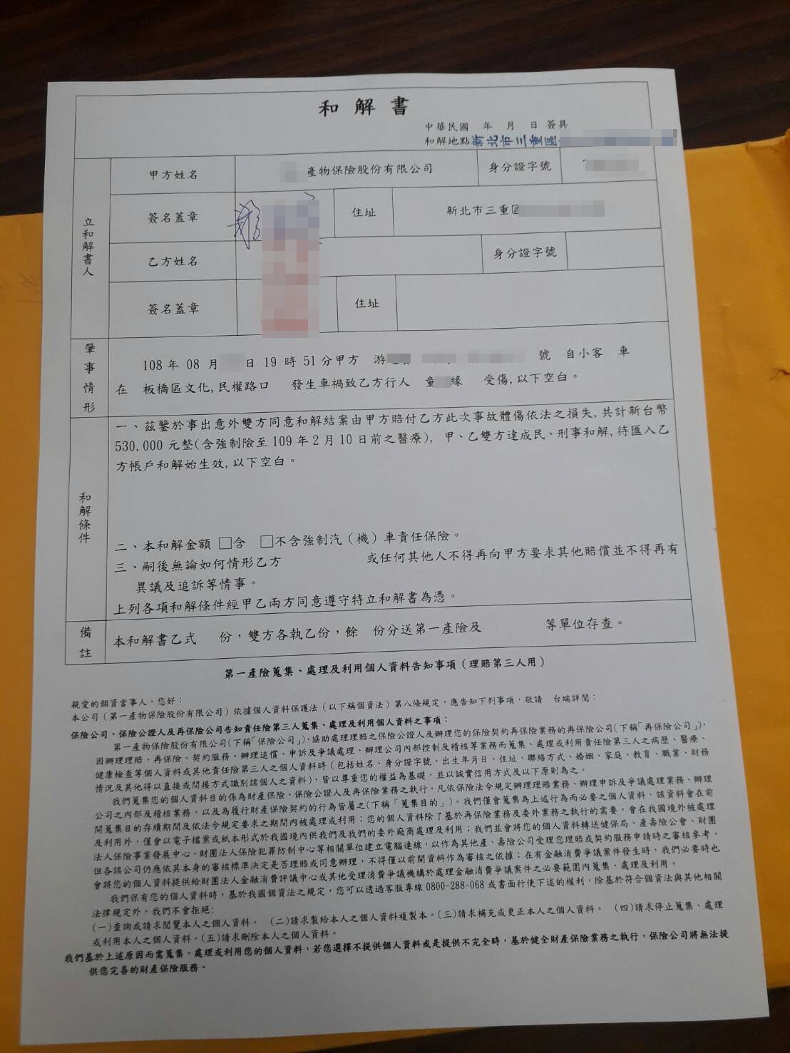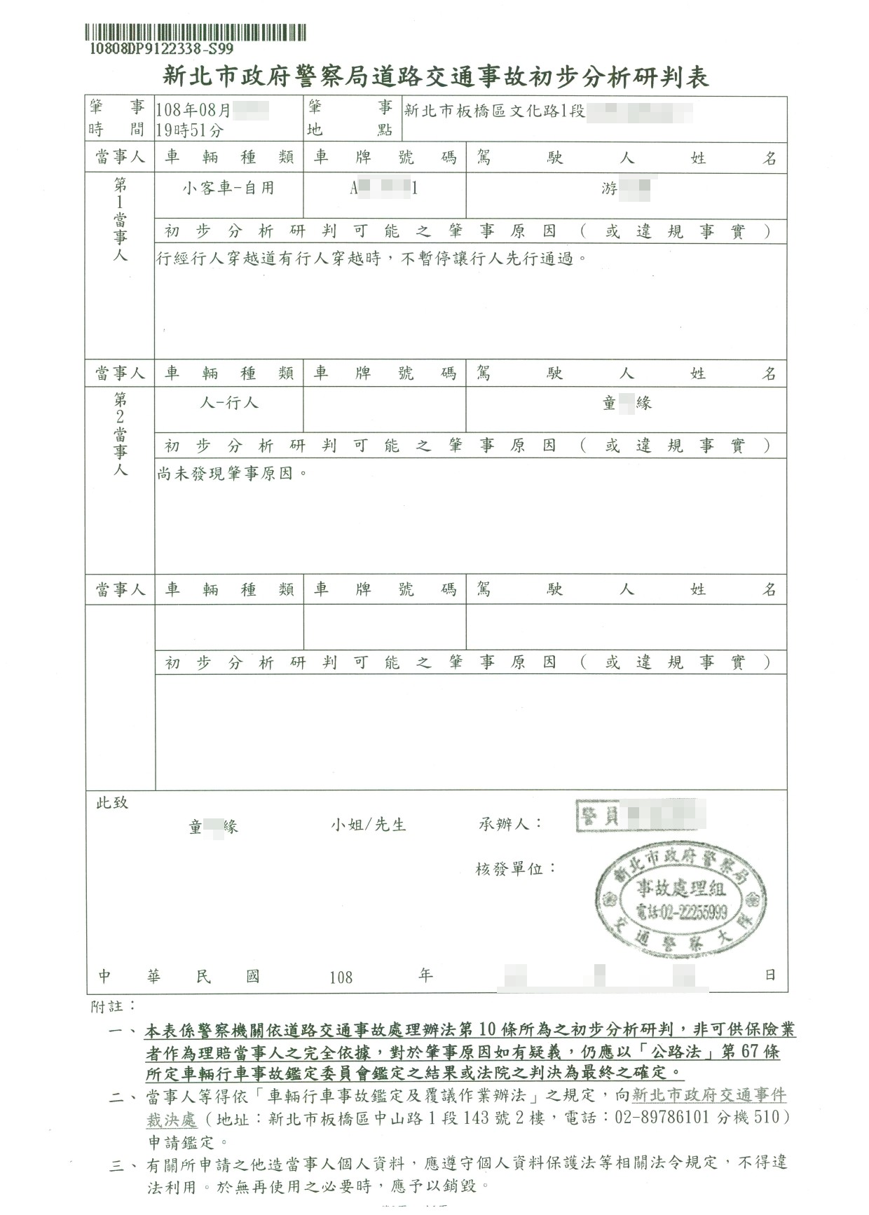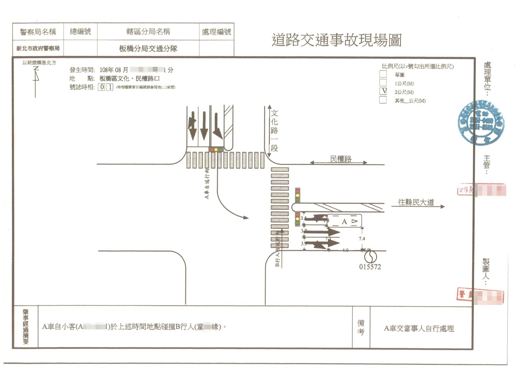 案件類型: 車禍案件。 發生時地: 108年8月 新北市板橋區文化路1段。 面談過程: 童小姐於上述路段行走在行人穿越道(斑馬線)因對造未理讓行人發生車禍,導致童小姐肱骨粉碎性骨折,經客戶來電佑安諮詢,見面詳談後同意委託佑安處理。 委任關鍵: 當事人是外藉配偶,因為沒有處理車禍相關經驗,所以委託佑安幫忙維護權利。 處理結果: 協助當事人收集相關資料並申請賠償,我方當事人共計獲得賠償金額530,000元。 心得: 常見汽機車駕駛人行經行人穿越道(斑馬線)未理讓行人,但依據道路交通管理處罰條例86條規定,行經行人穿越道不依規定讓行人優先通行,因而致人受傷或死亡,依法應負刑事責任者,加重其刑至二分之一。依前開規定可知是會加重刑罰,實在不可不慎。 案件資料: 初步分析研判表︰ 現場圖︰ 診斷證明書︰ 和解書︰